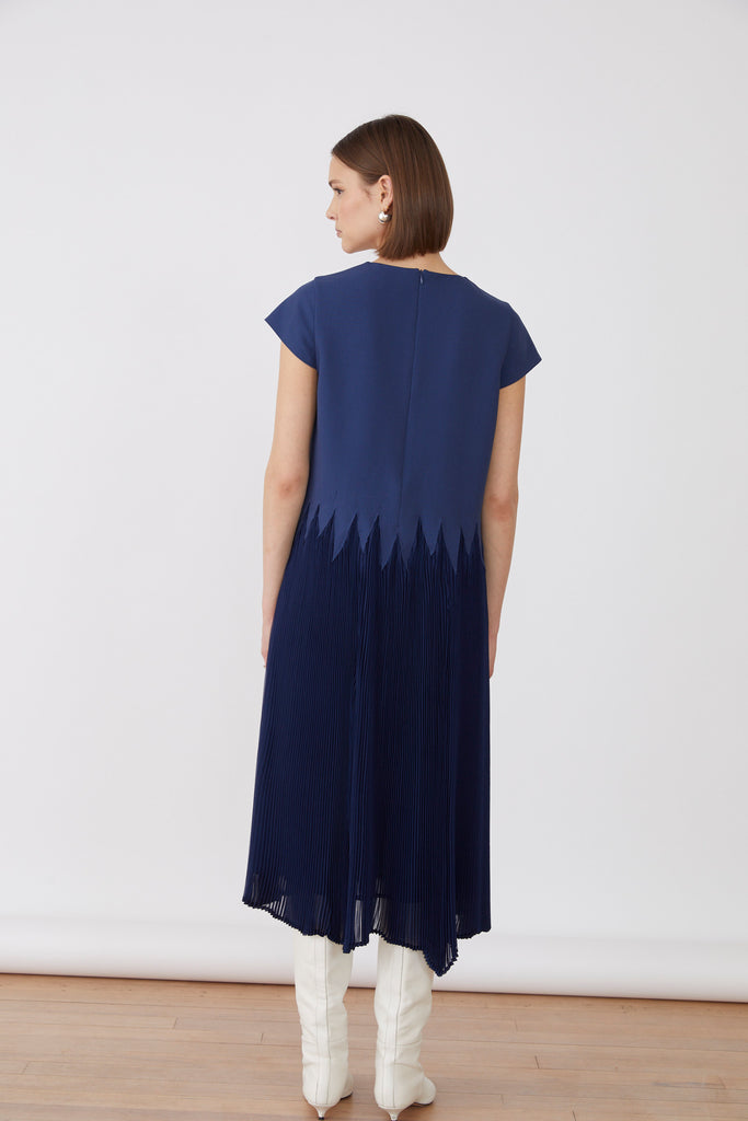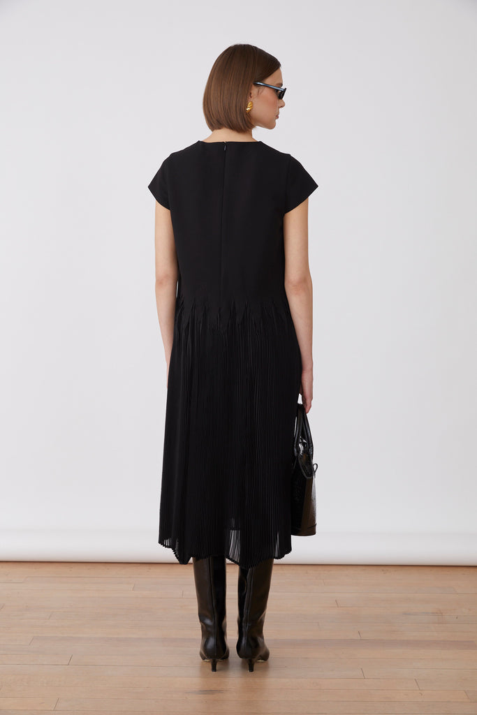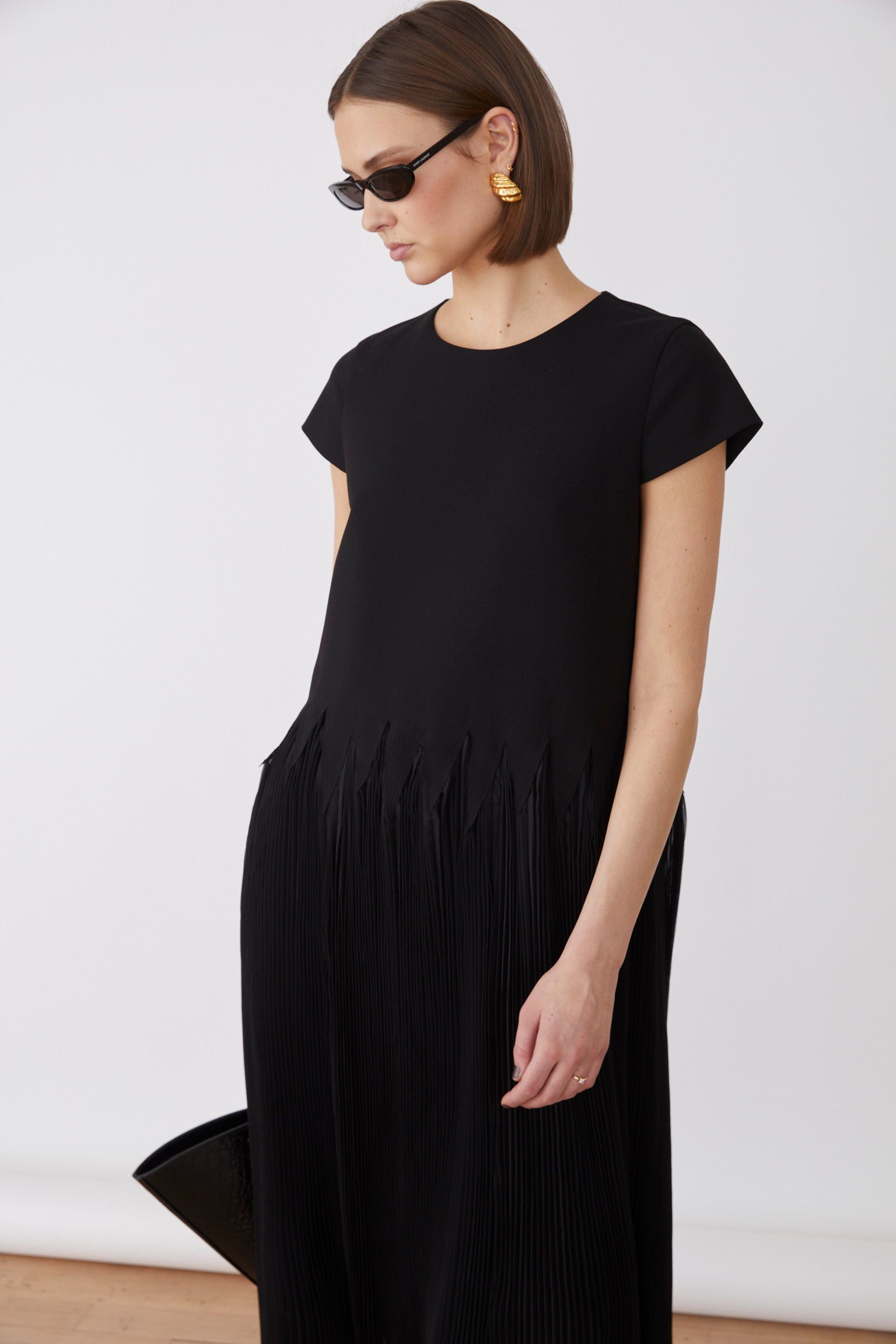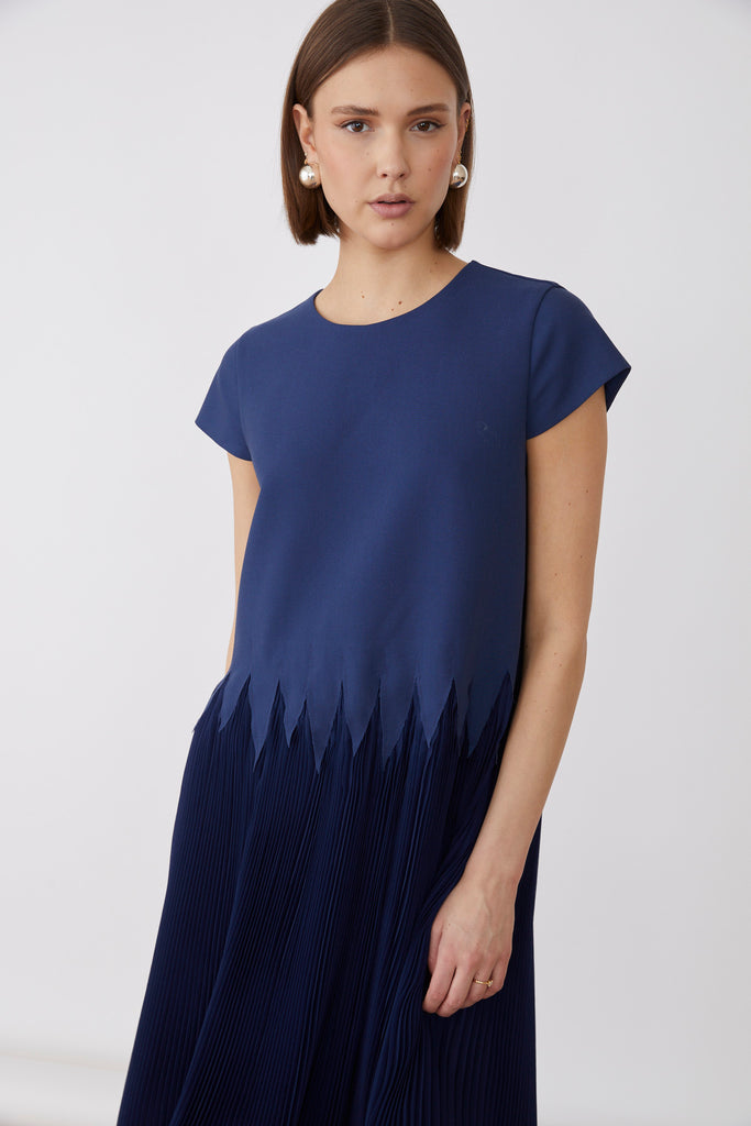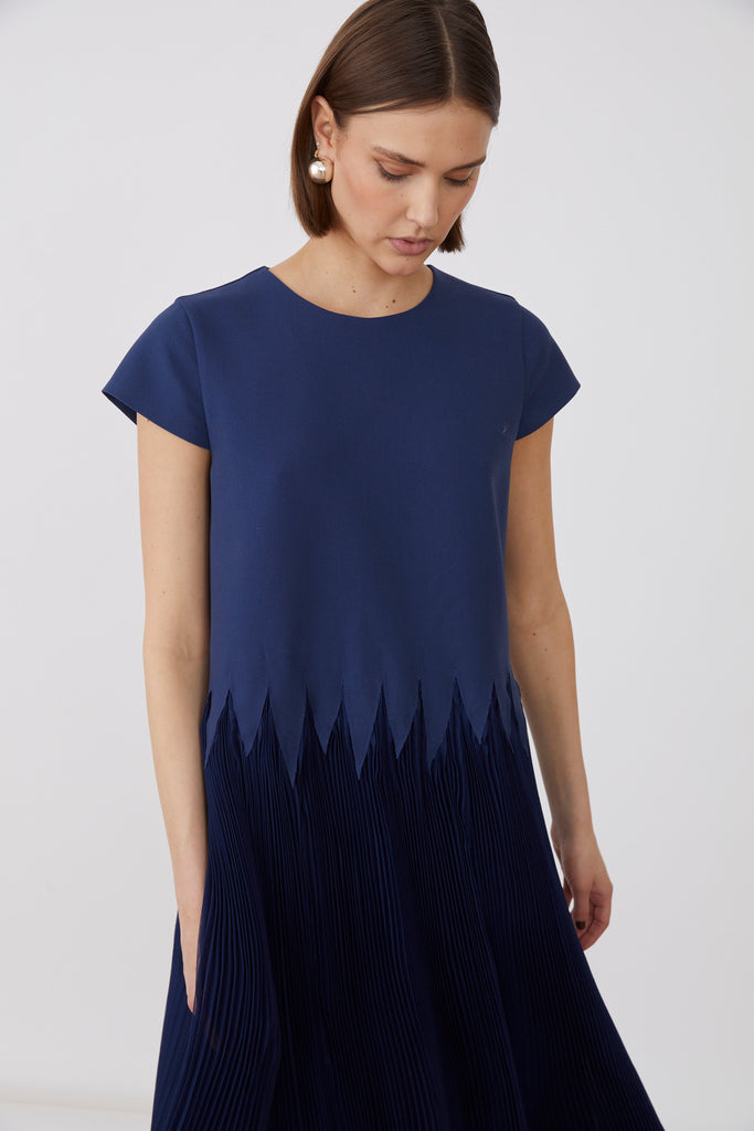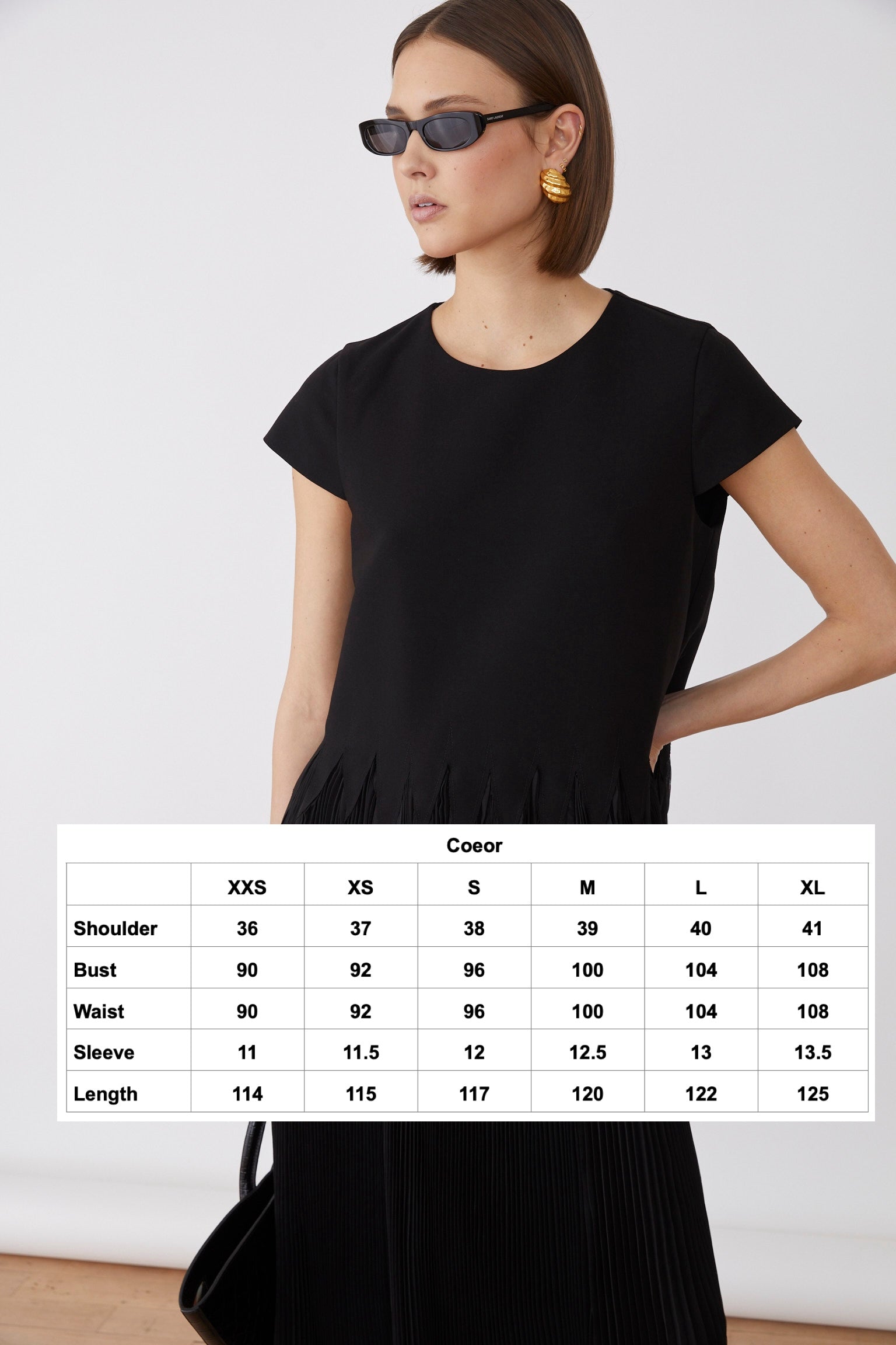 The COEOR Dress Black or Blue features a sophisticated design with a short sleeve top and a lightweight pleated skirt that moves gracefully. A discreet zip at the back ensures a sleek silhouette, combining elegance with comfort for any occasion.