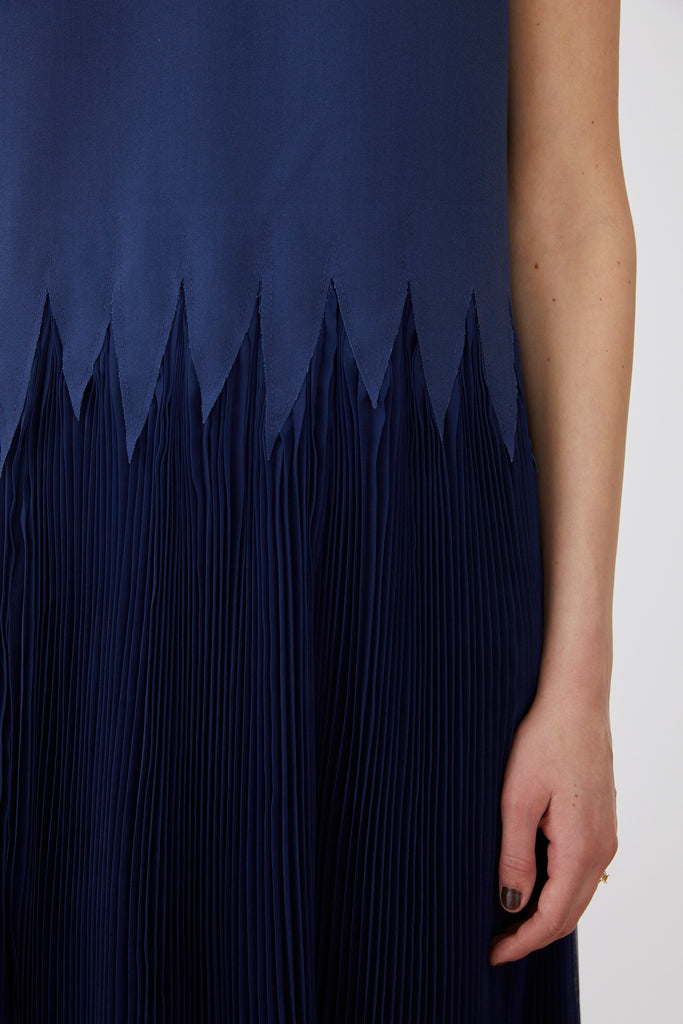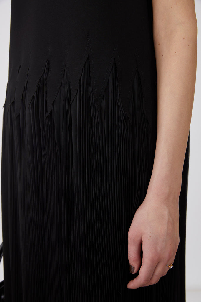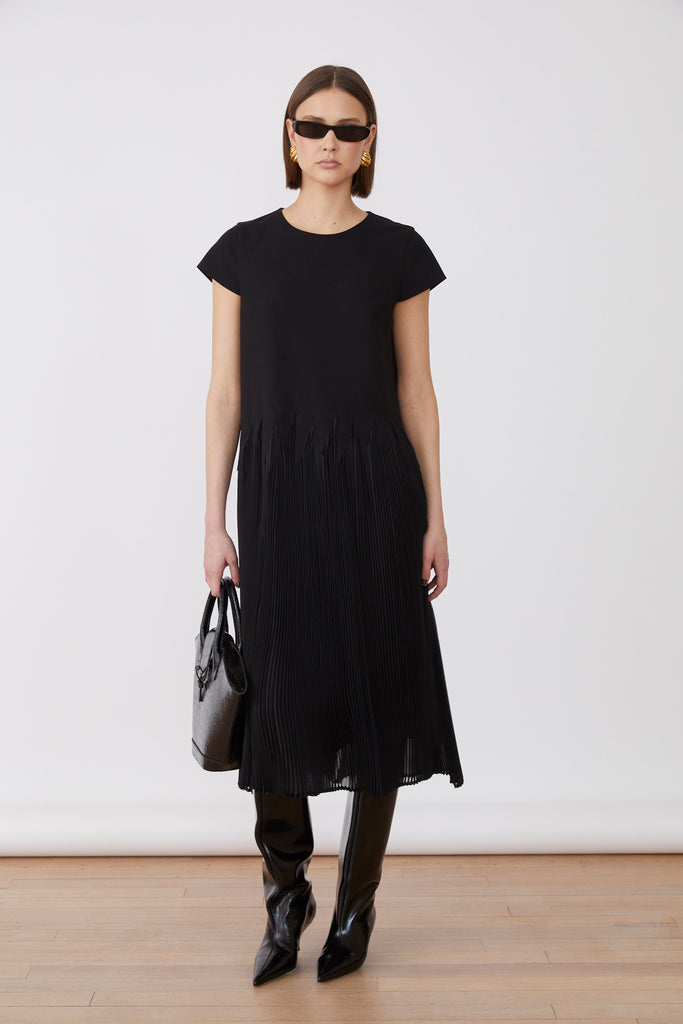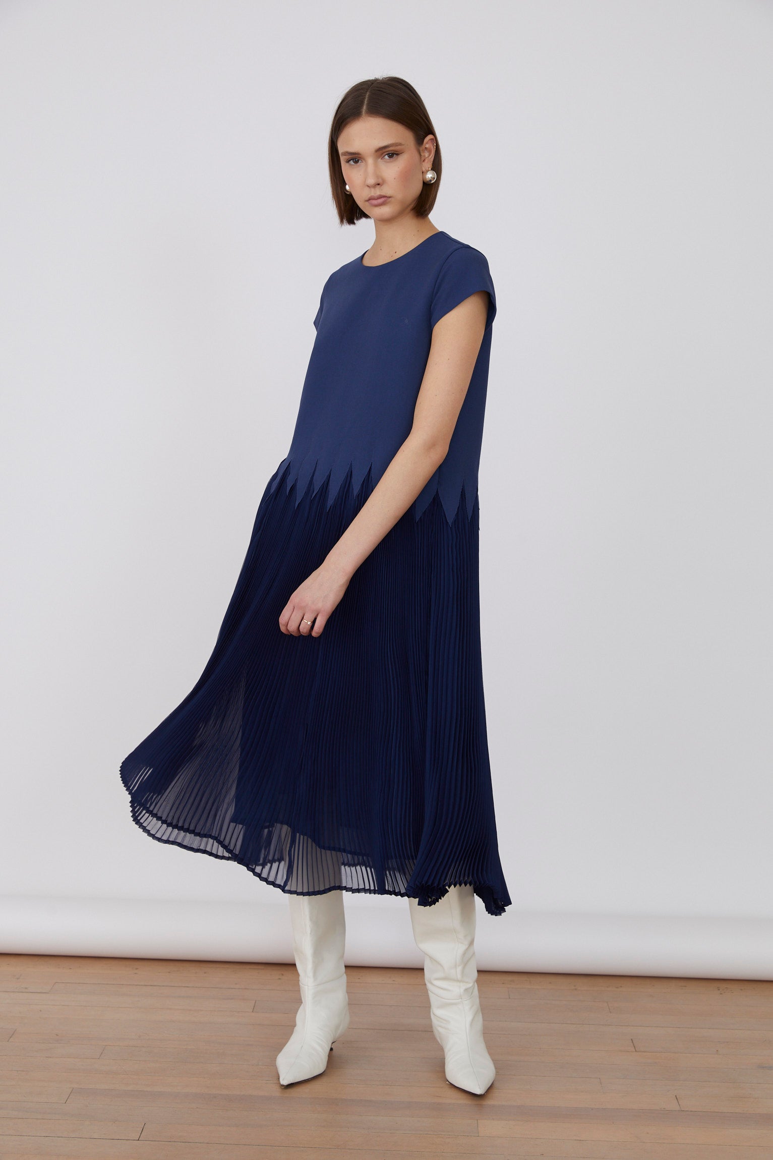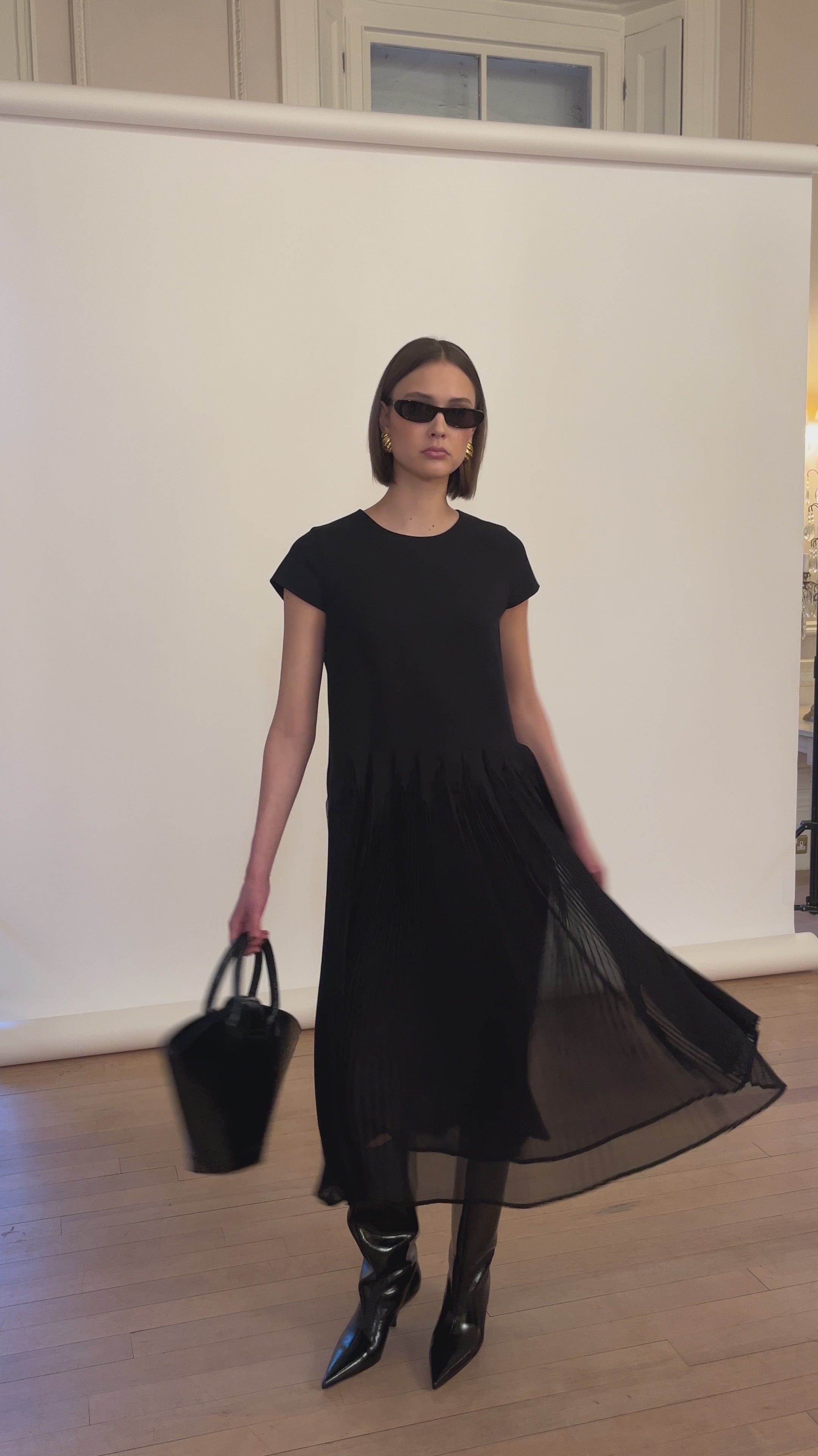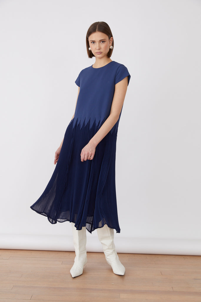 The COEOR Dress Black or Blue features a sophisticated design with a short sleeve top and a lightweight pleated skirt that moves gracefully. A discreet zip at the back ensures a sleek silhouette, combining elegance with comfort for any occasion.