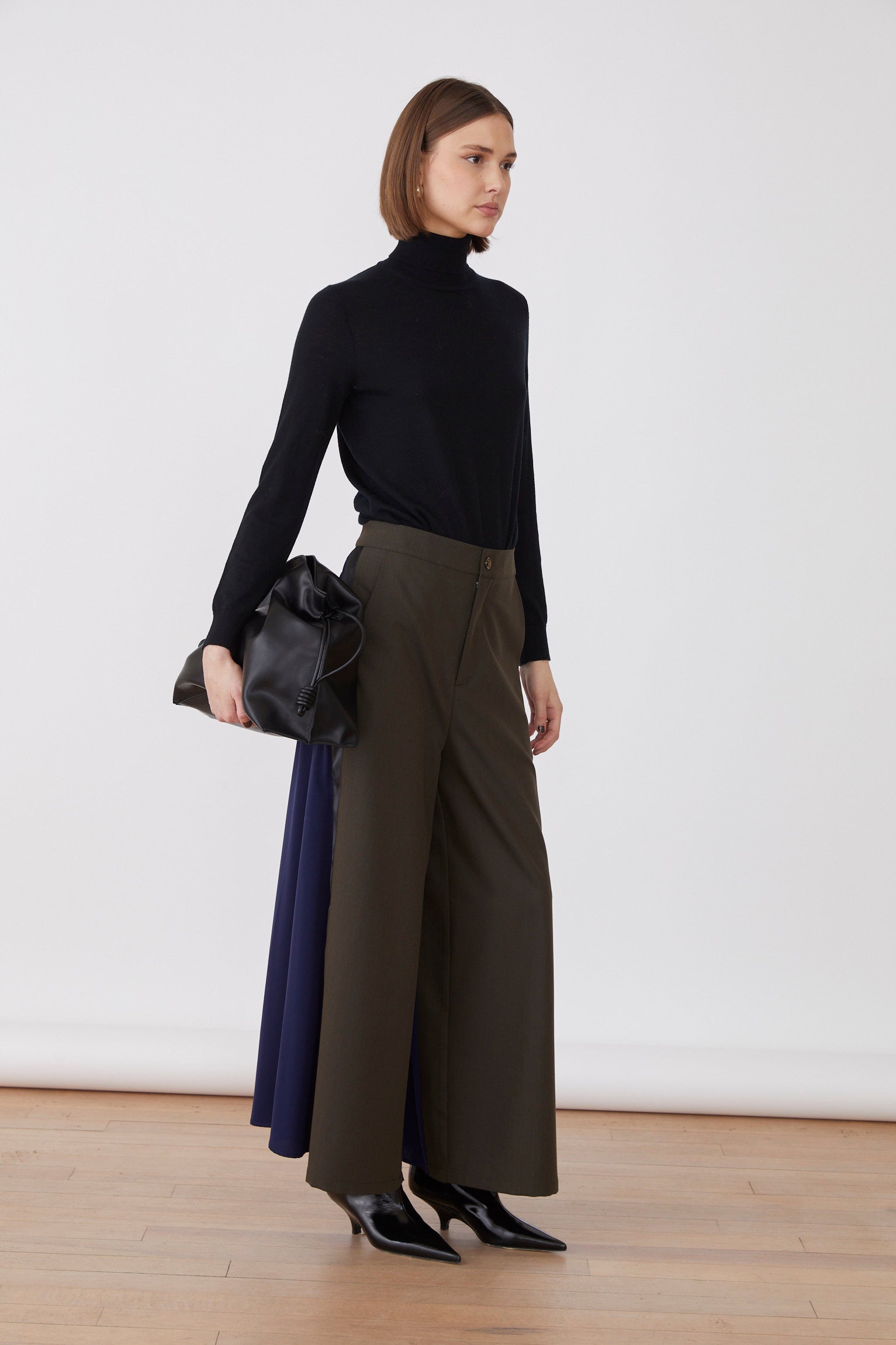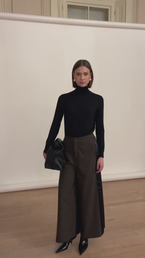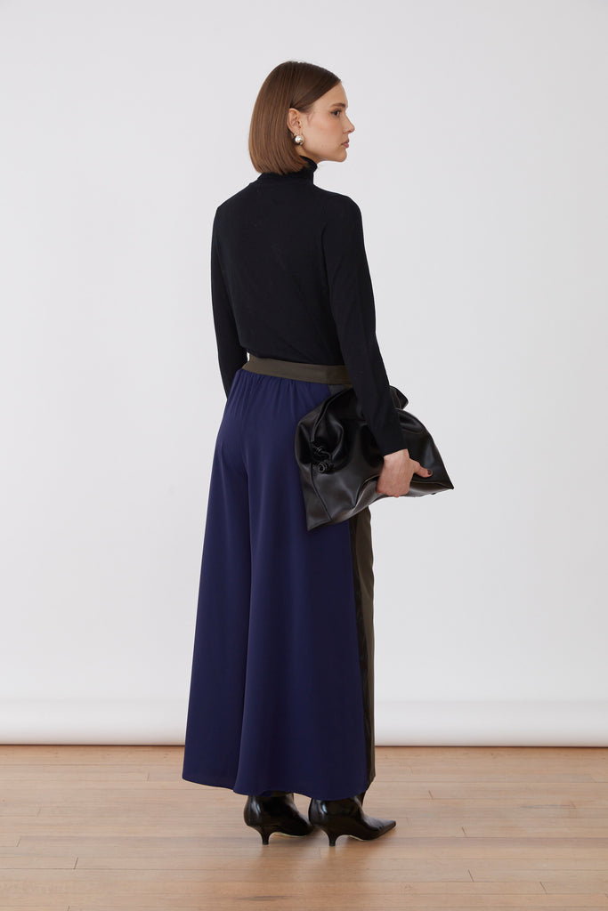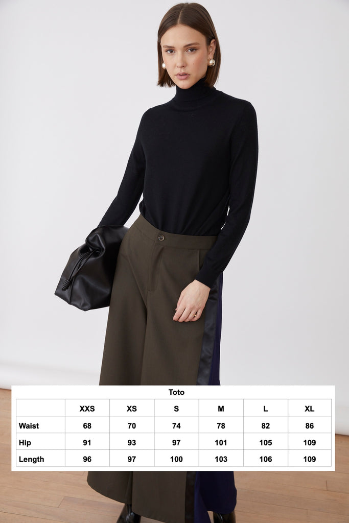 These TOTO Trousers feature a sophisticated blend of mixed materials that enhance both comfort and style. The pleated navy front adds refined texture, contrasting elegantly with the soft khaki front panels. Designed with a wide-leg silhouette, they offer a flowing, graceful movement, perfect for a polished yet relaxed look. Ideal for elevating your wardrobe with understated luxury and fluid design.
