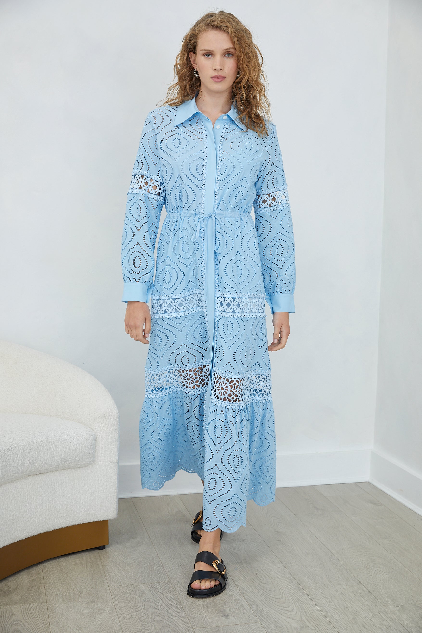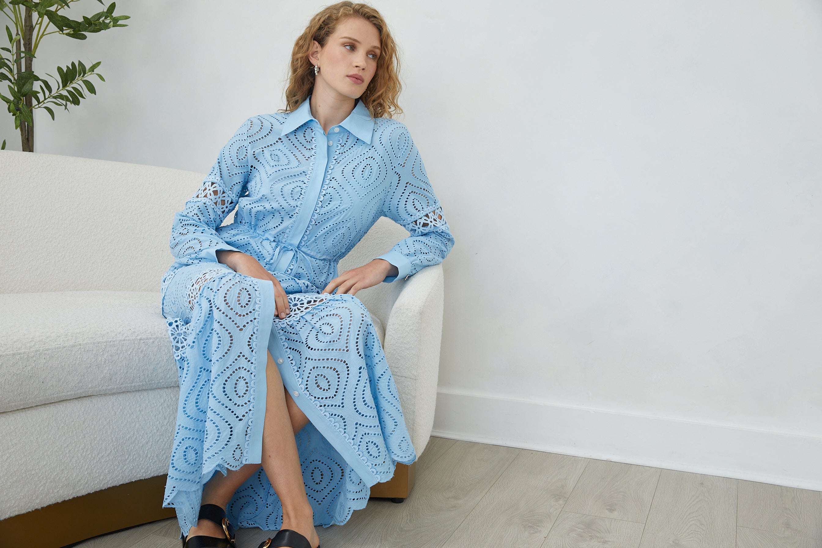 The SERINA DRESS combines timeless elegance with refined detailing. Crafted with delicate embroidery anglaise, this piece features a flattering tie waist that defines the silhouette and a classic button-down front for effortless styling. Perfect for elevated daywear or occasion dressing, the intricate eyelet work adds texture and visual interest while maintaining a sophisticated aesthetic. A versatile wardrobe essential that transitions seamlessly from season to season.