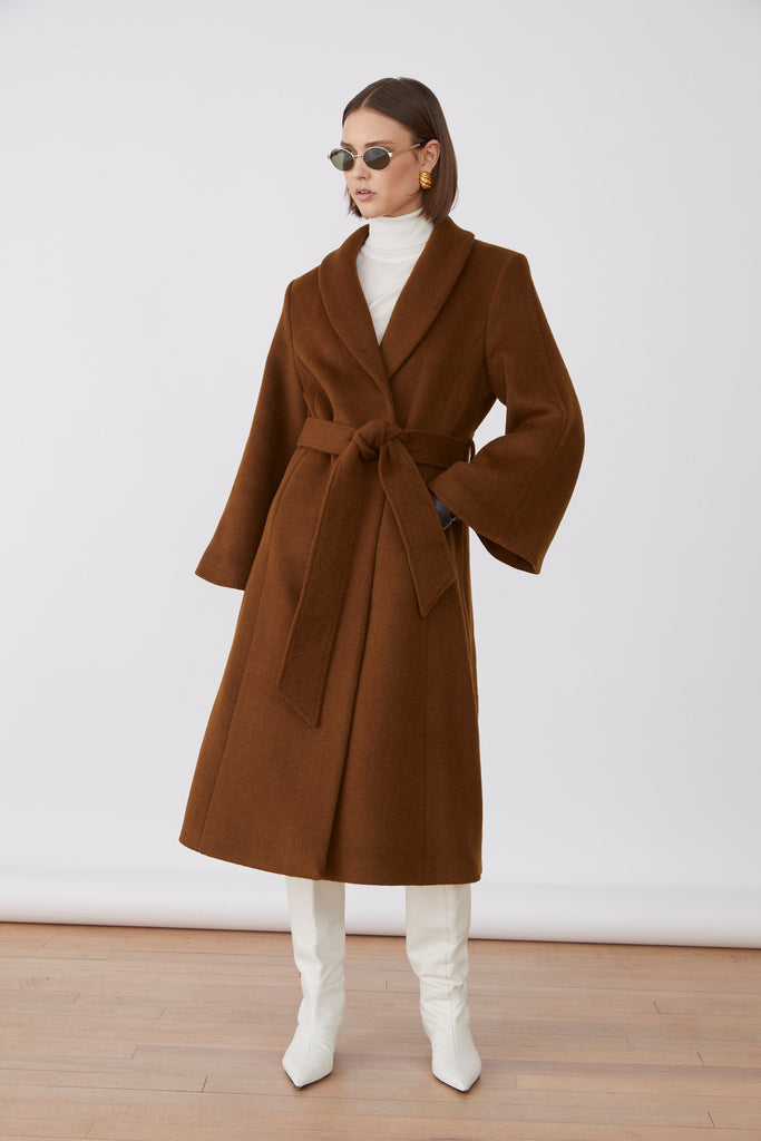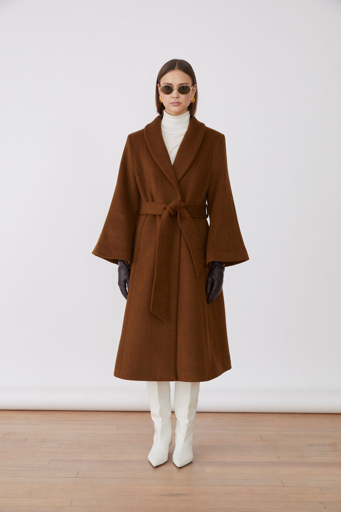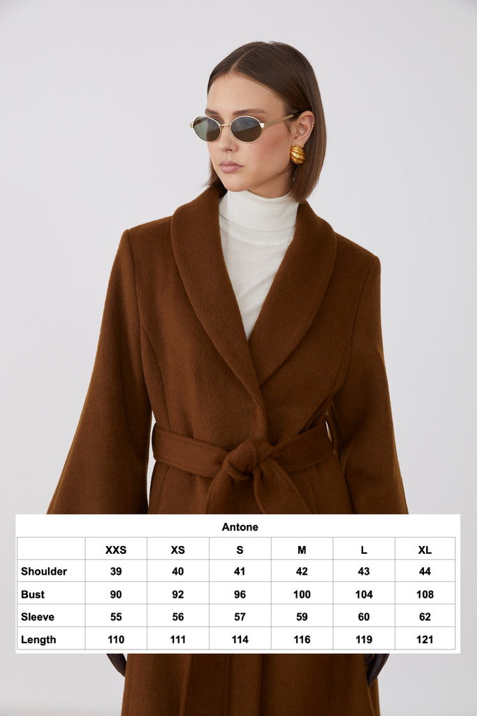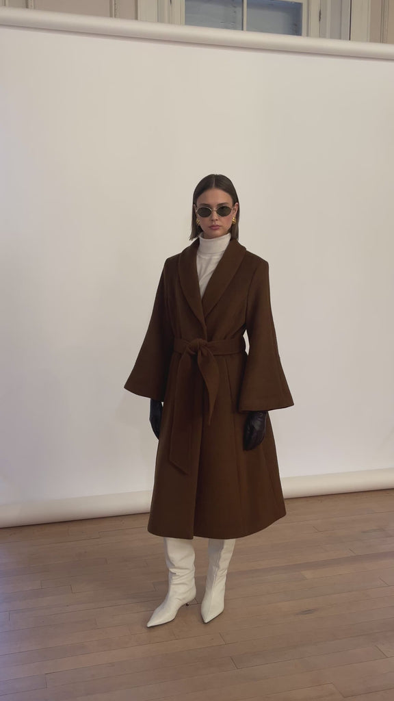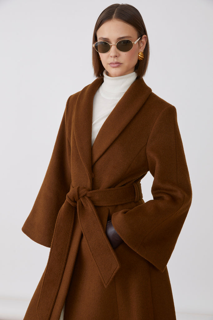 Crafted from 40% wool, the Antone Coat in brown features elegant flared sleeves and a flattering V-neckline. Its long silhouette is cinched at the waist with a tie, enhancing a sophisticated shape while offering functional pockets for convenience. This coat combines classic refinement with modern details for a timeless, polished look.