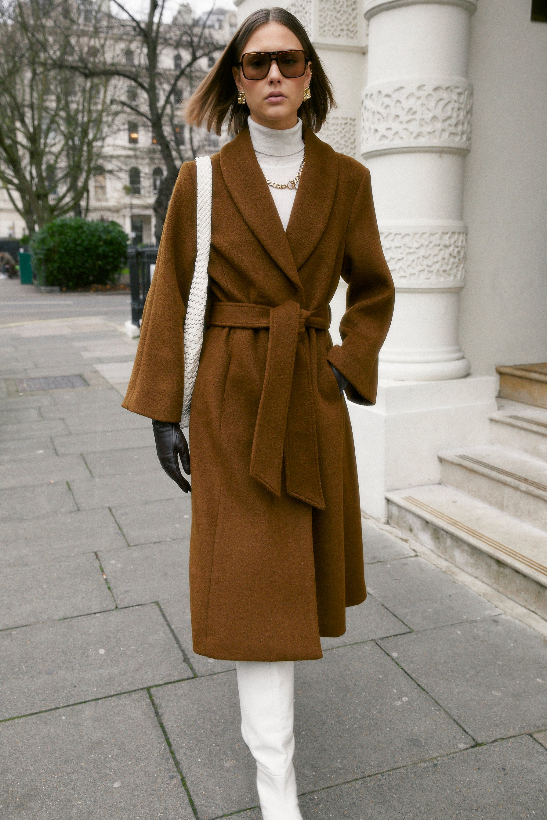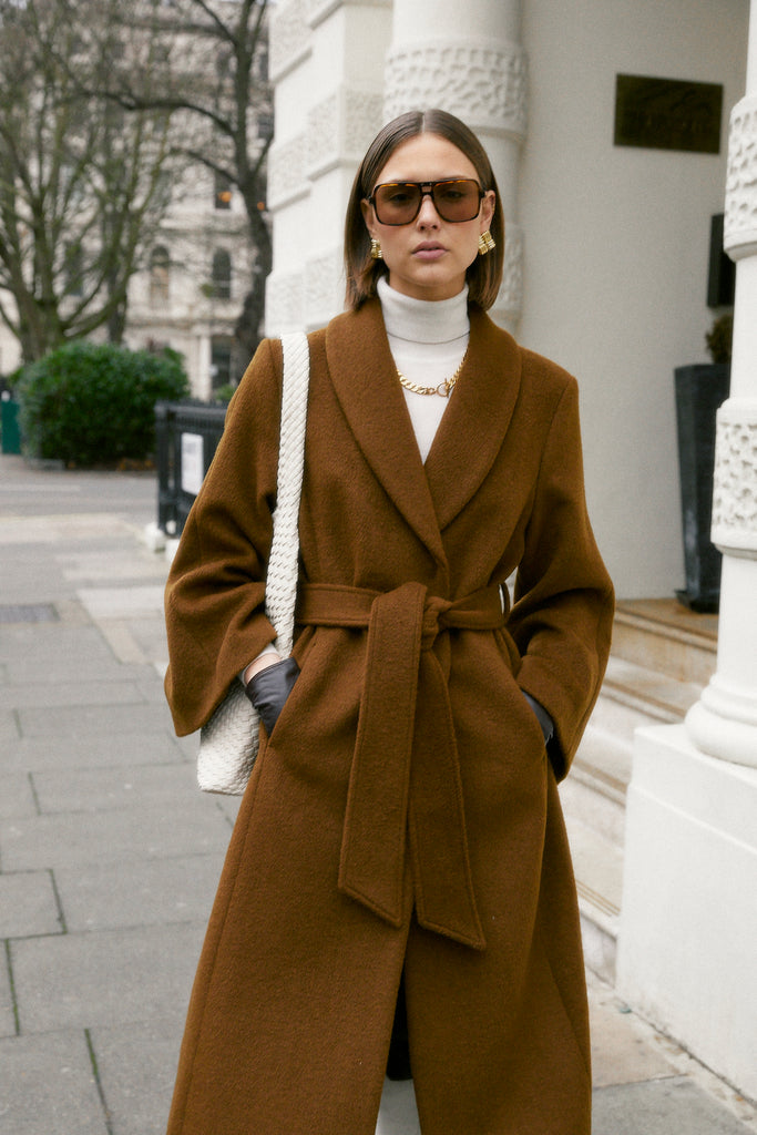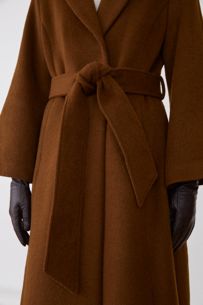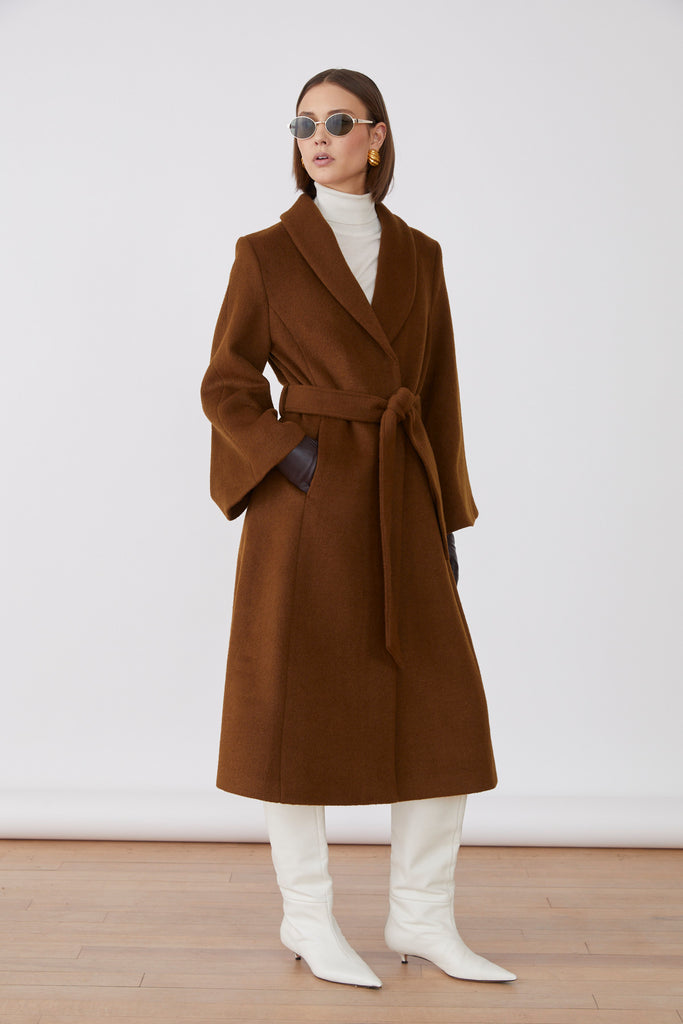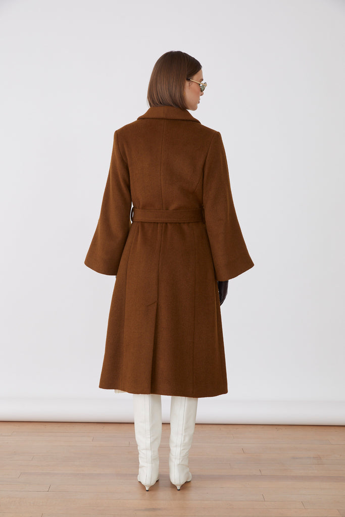 Crafted from 40% wool, the Antone Coat in brown features elegant flared sleeves and a flattering V-neckline. Its long silhouette is cinched at the waist with a tie, enhancing a sophisticated shape while offering functional pockets for convenience. This coat combines classic refinement with modern details for a timeless, polished look.