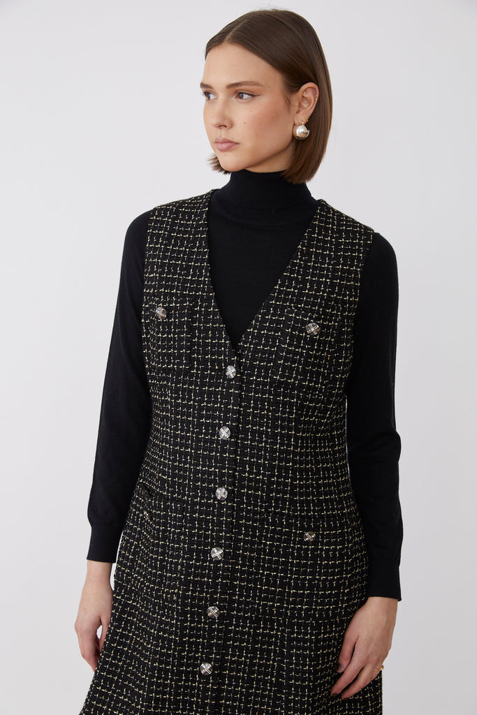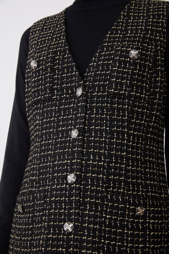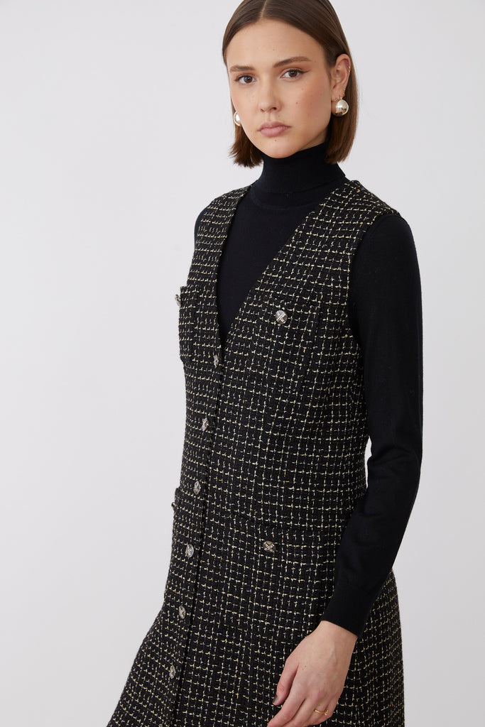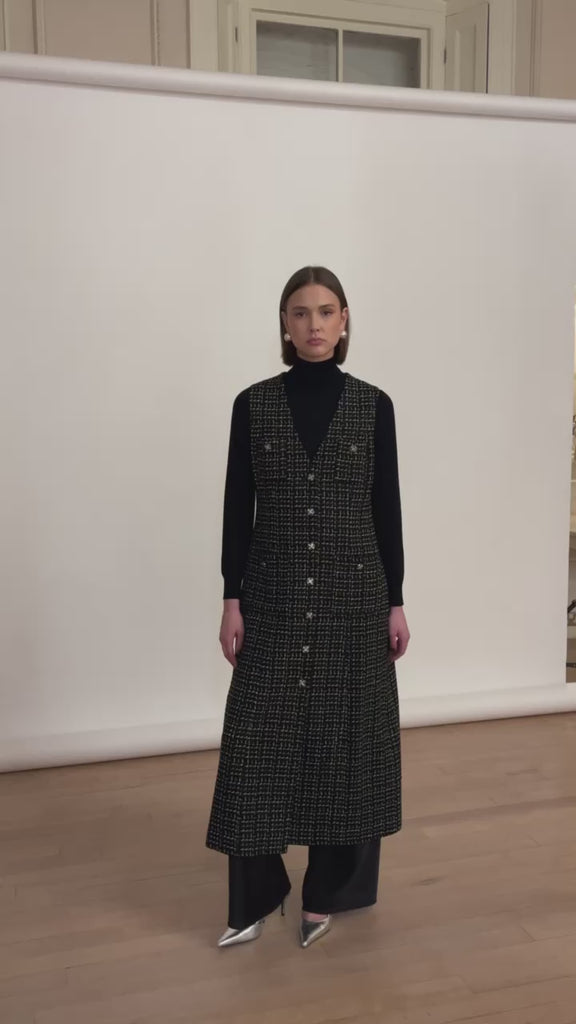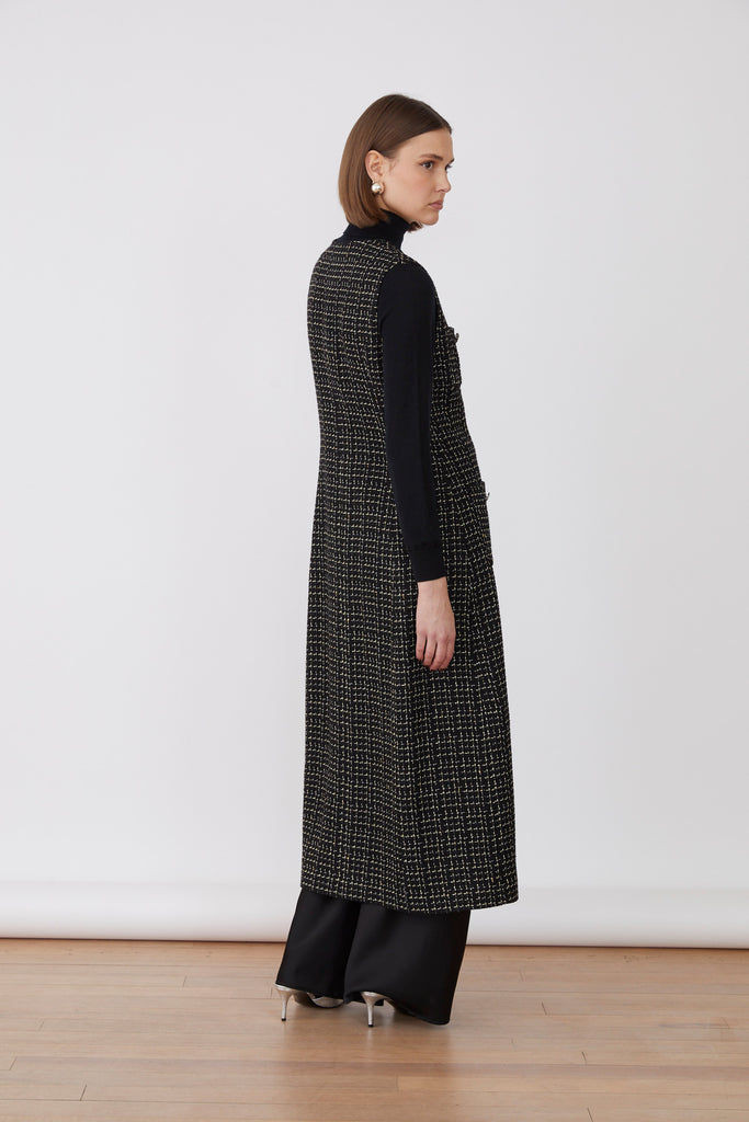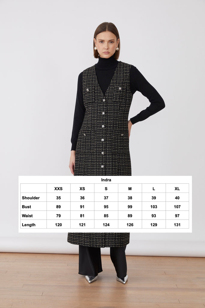 The INDRA JACKET is a sleeveless piece crafted in a classic long tweed style, offering a refined silhouette. Its carefully embellished buttons add a touch of elegance, making it perfect for layering over sophisticated ensembles. This jacket elevates your wardrobe with timeless texture and subtle decorative details.