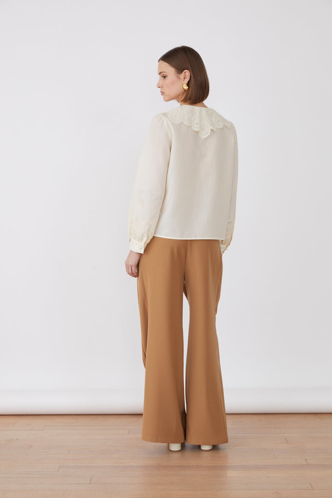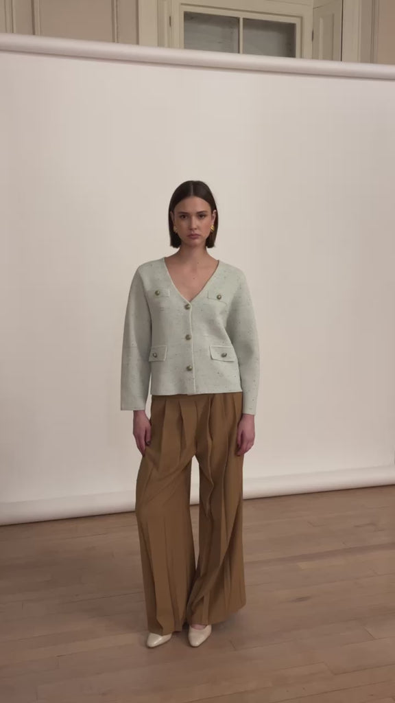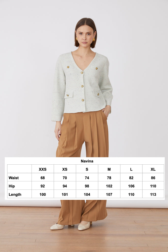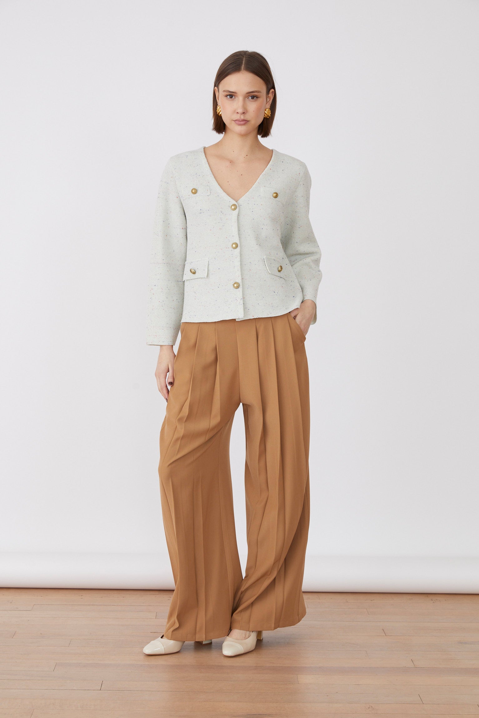 The Navina Trousers in brown feature a sophisticated pleated design with wide legs that offer a graceful silhouette. Crafted from lightweight fabric, they provide a flowing, effortless drape, perfect for elegant, comfortable wear throughout the day.
