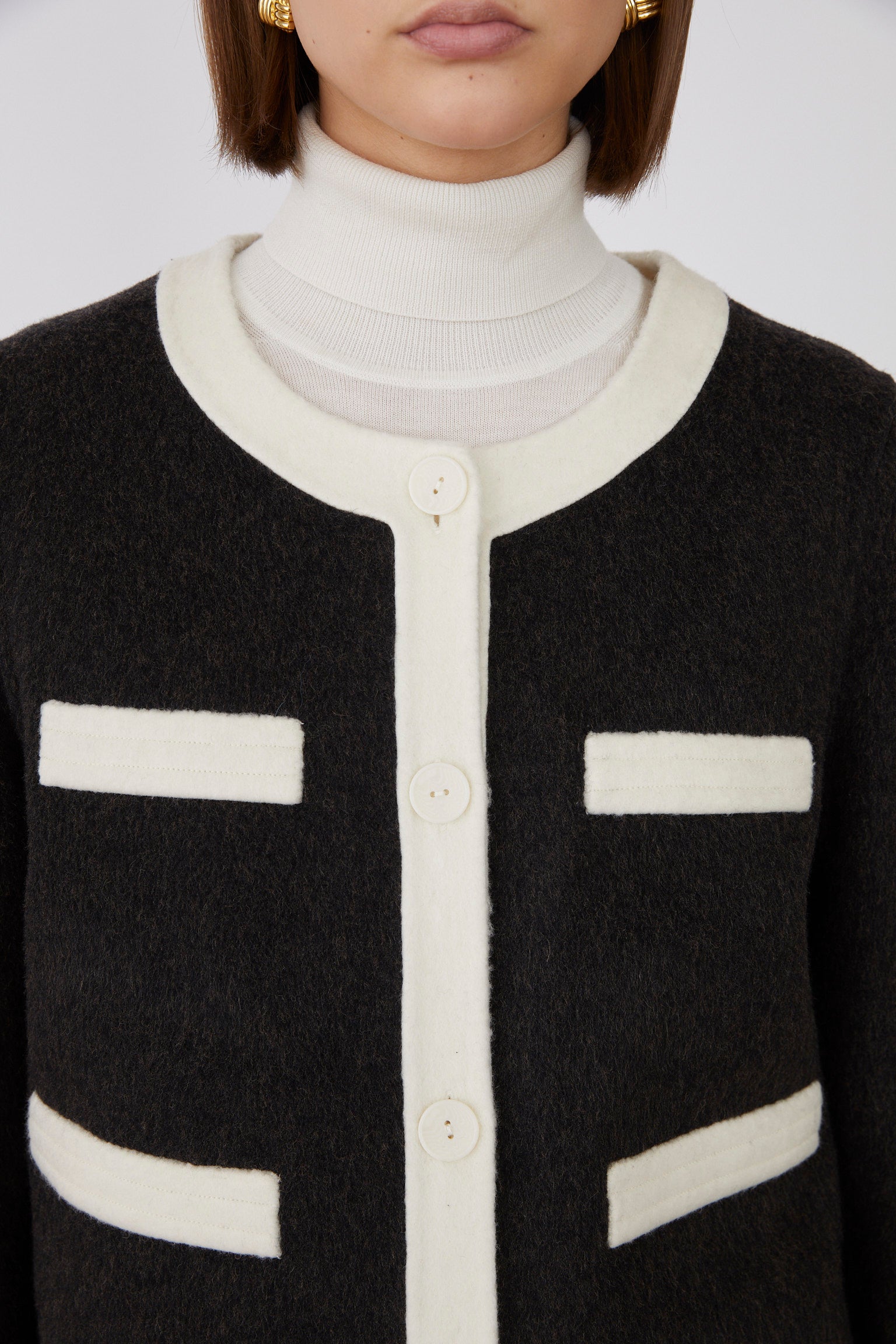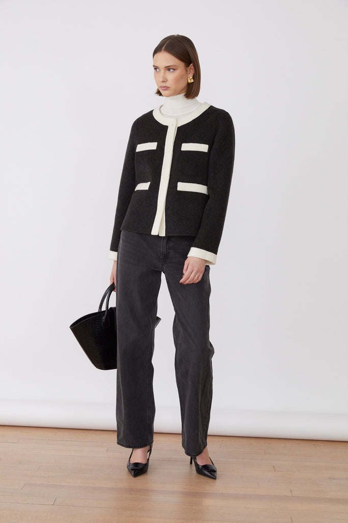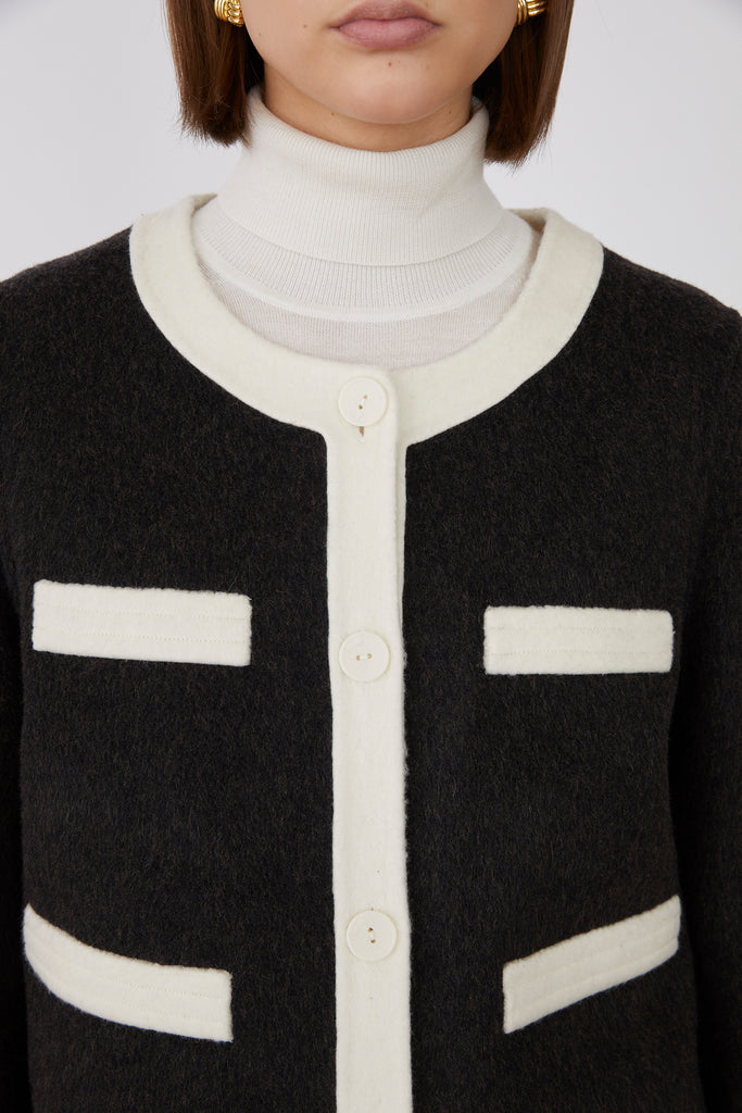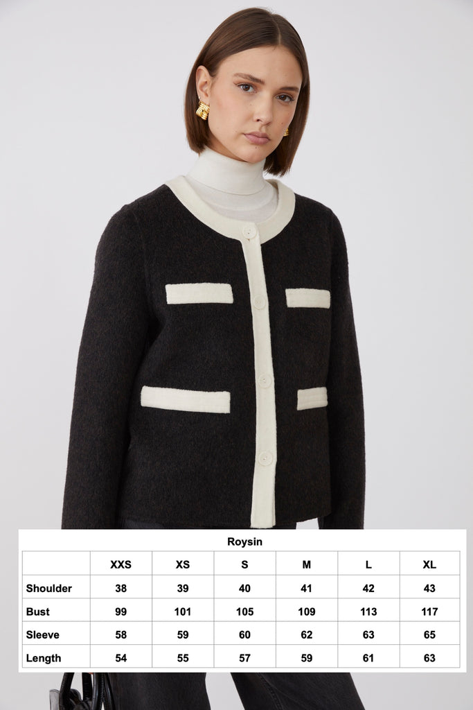 Elevate your wardrobe with the ROYSIN JACKET, crafted from a premium blend of 50% wool for warmth and durability. Its crisp white outlining adds a refined contrast, enhancing the jacket's sophisticated silhouette. Perfect for a polished, timeless look that effortlessly transitions from day to evening.