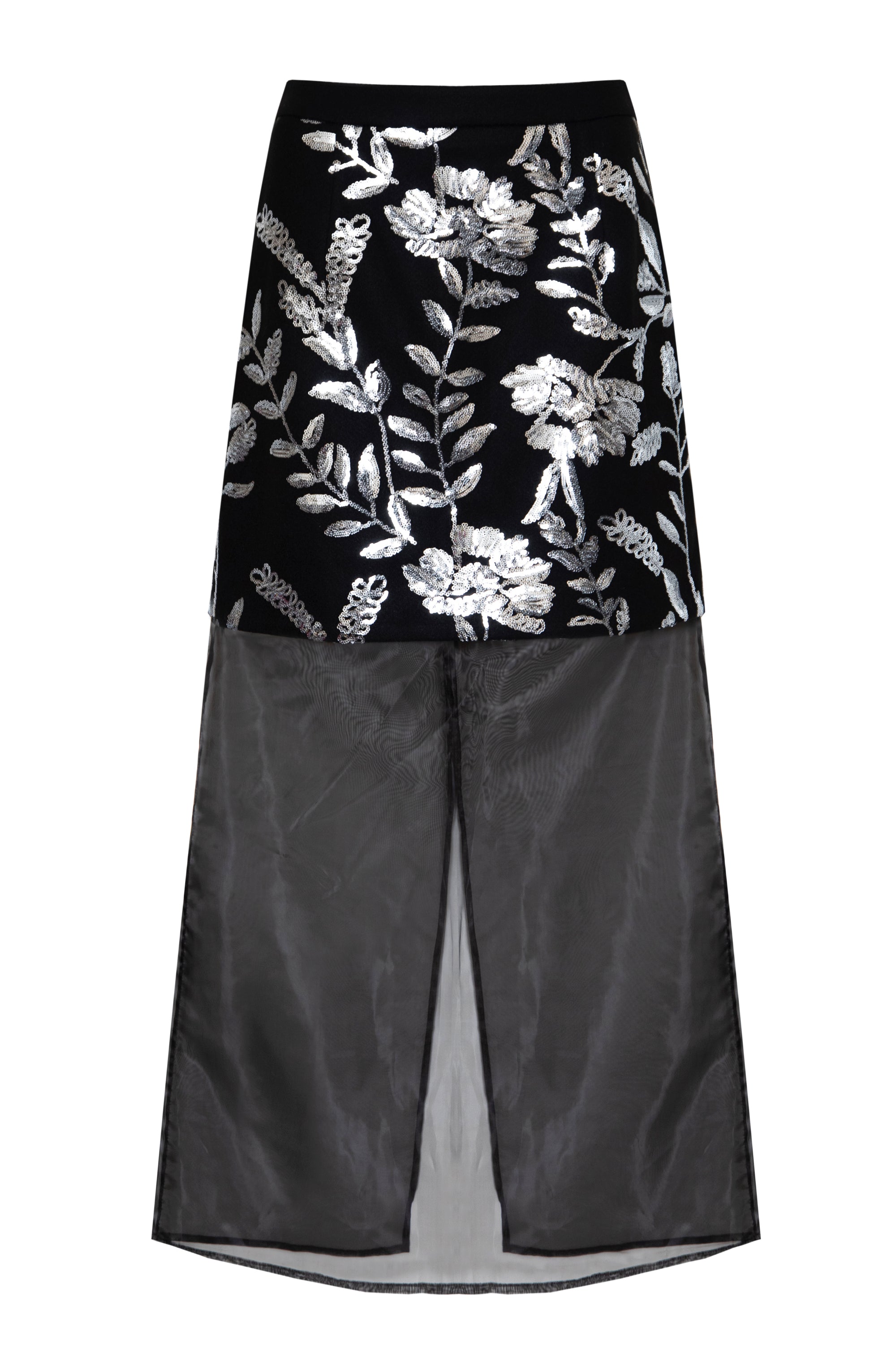 The SOLEI SKIRT features delicate floral embellishments adorned with shimmering sequins, creating an elegant and festive look. Its midi length and sheer lining add a touch of sophistication, making it perfect for special occasions and celebrations.