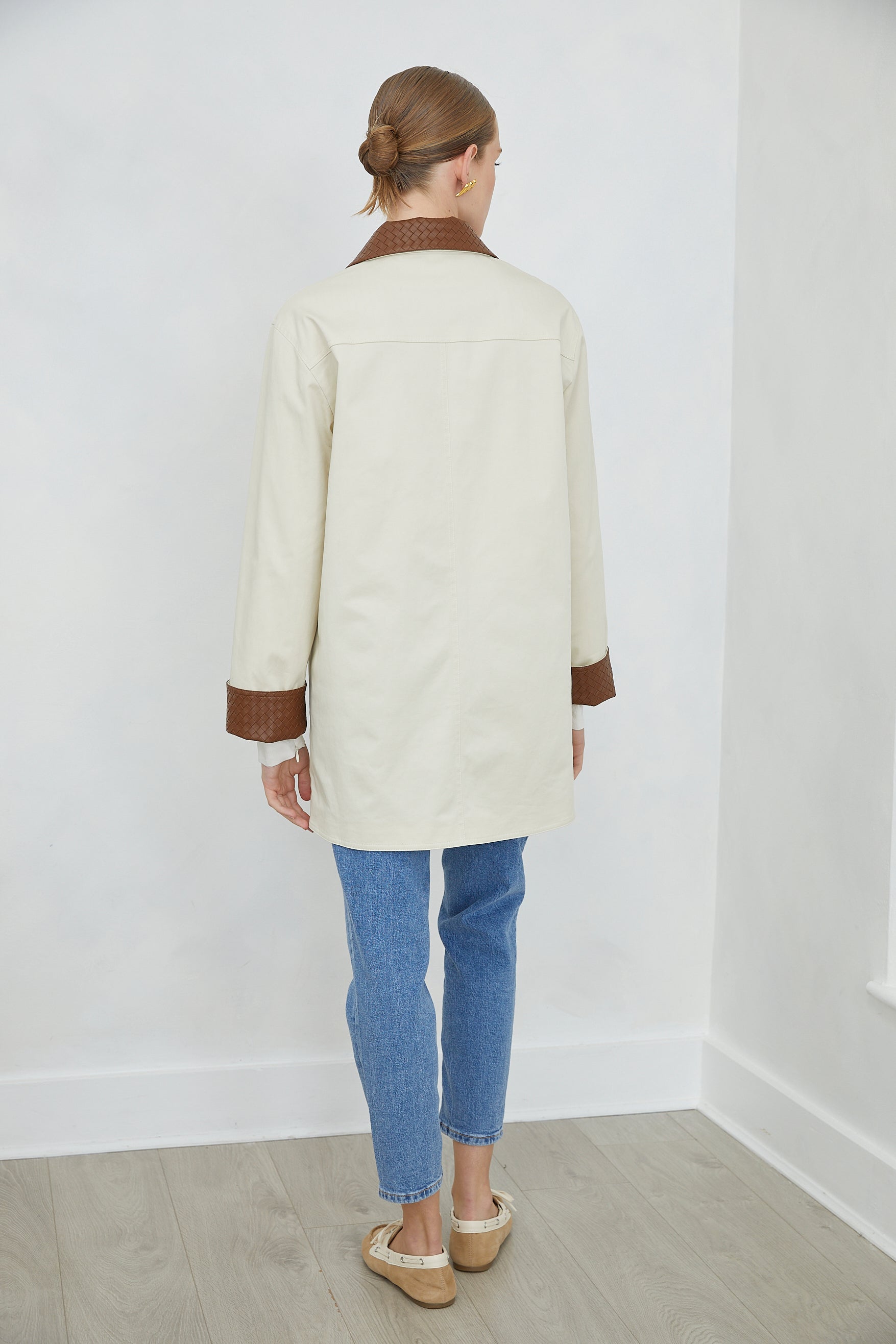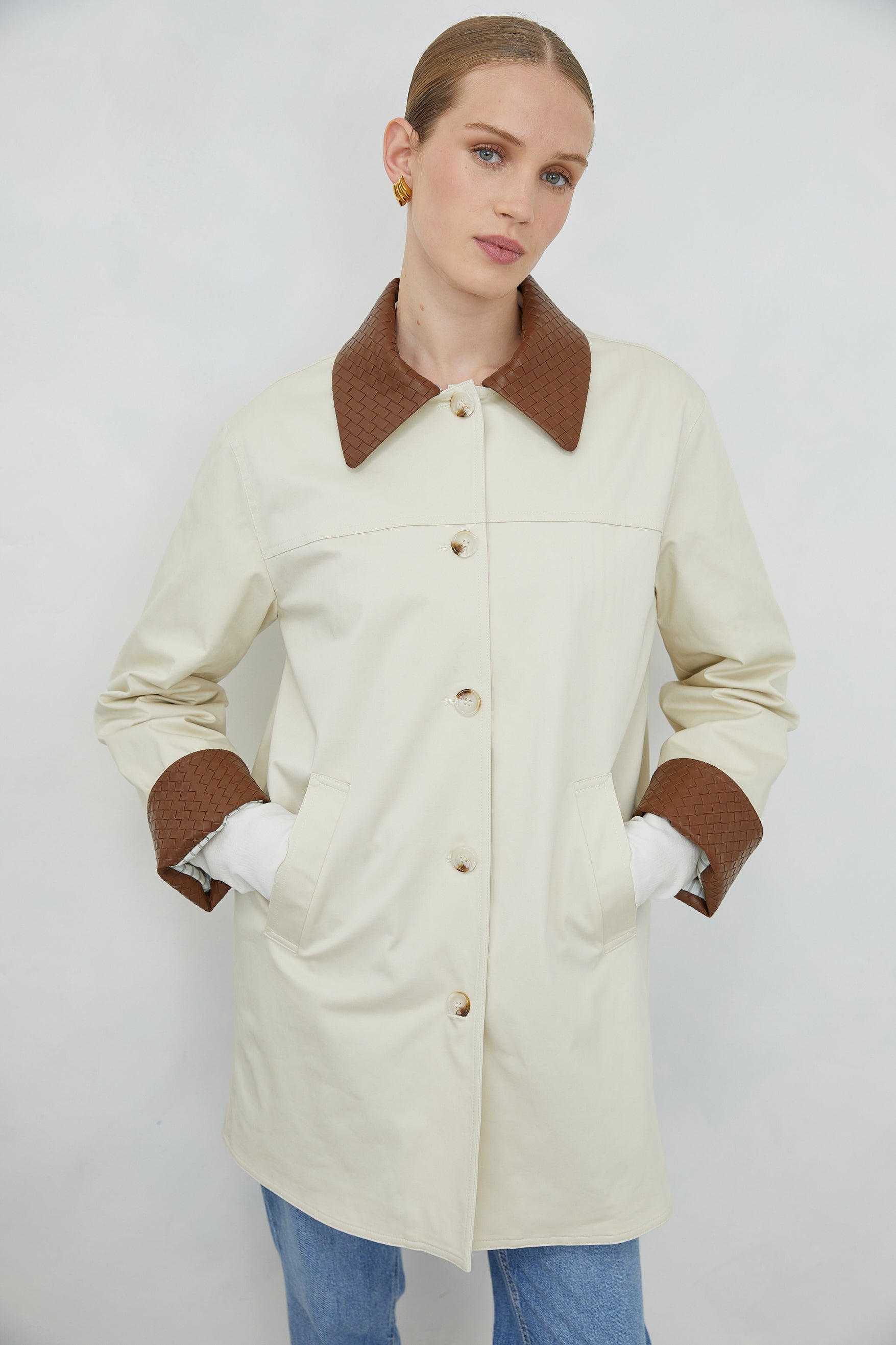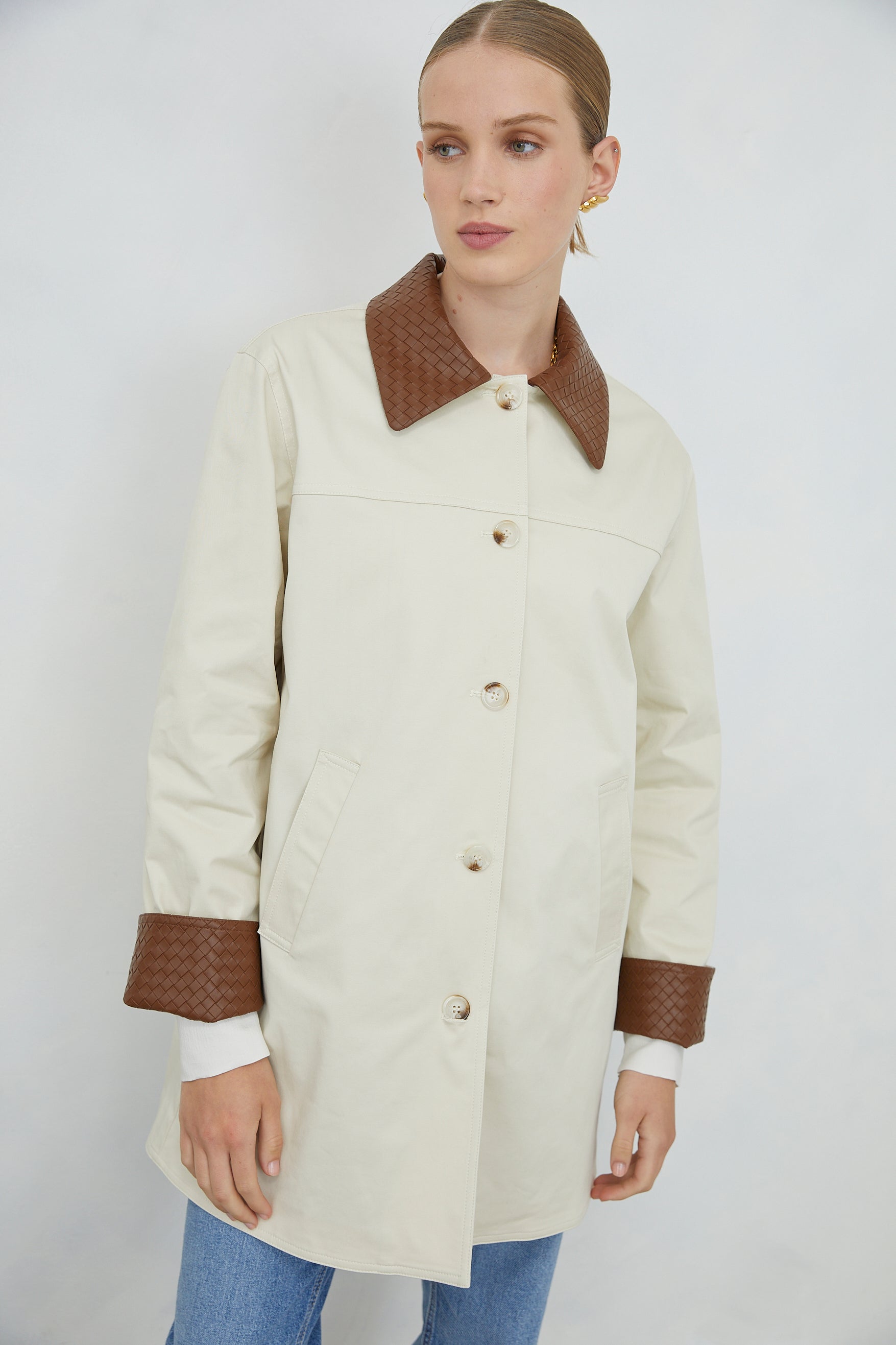 The ELIRA JACKET showcases refined tailoring with distinctive textural elements. Woven leather-effect cuffs and collar in rich brown create visual depth and tactile interest, while the button-down front ensures versatile styling. Expertly proportioned for layering, this piece bridges professional and leisure wear with understated sophistication. A considered addition to any curated collection.