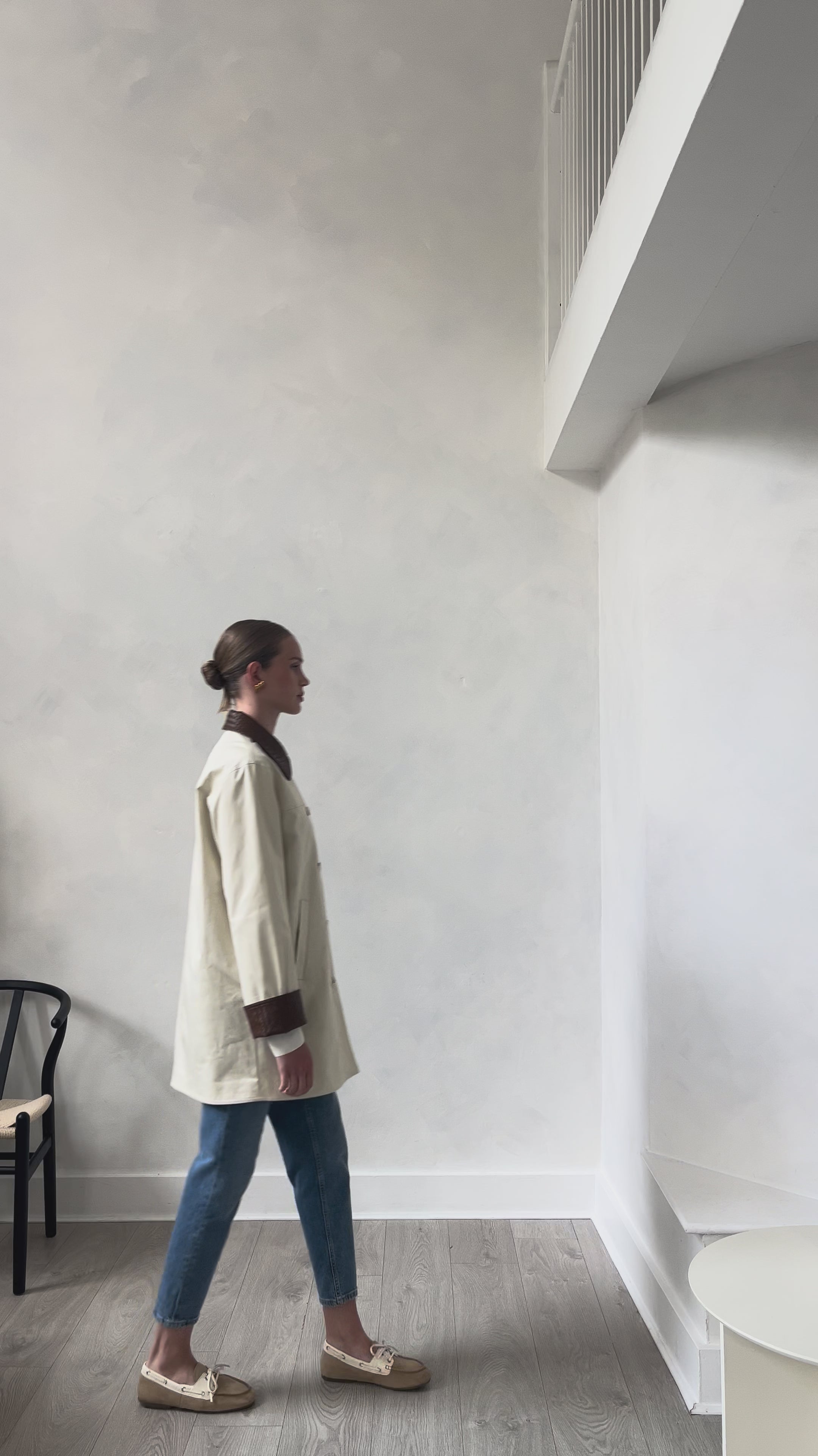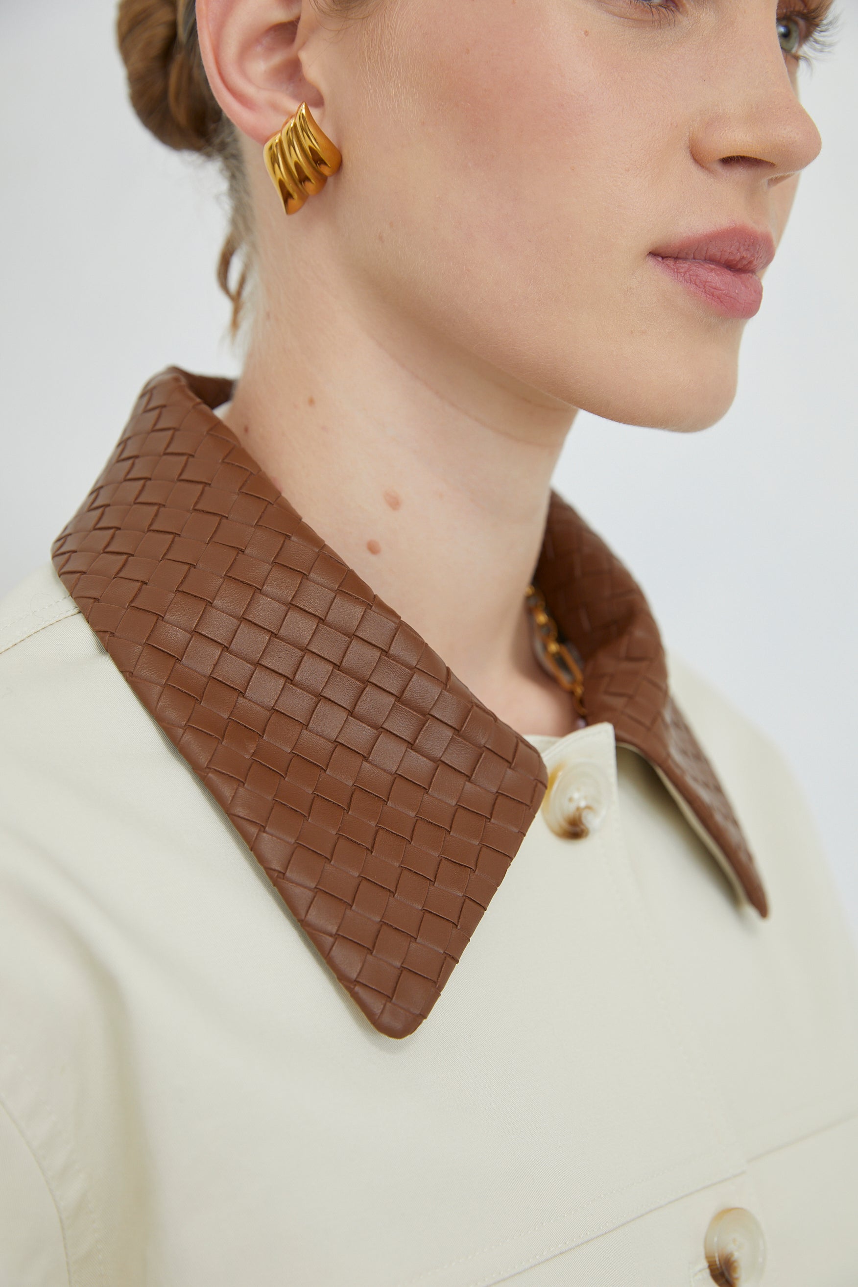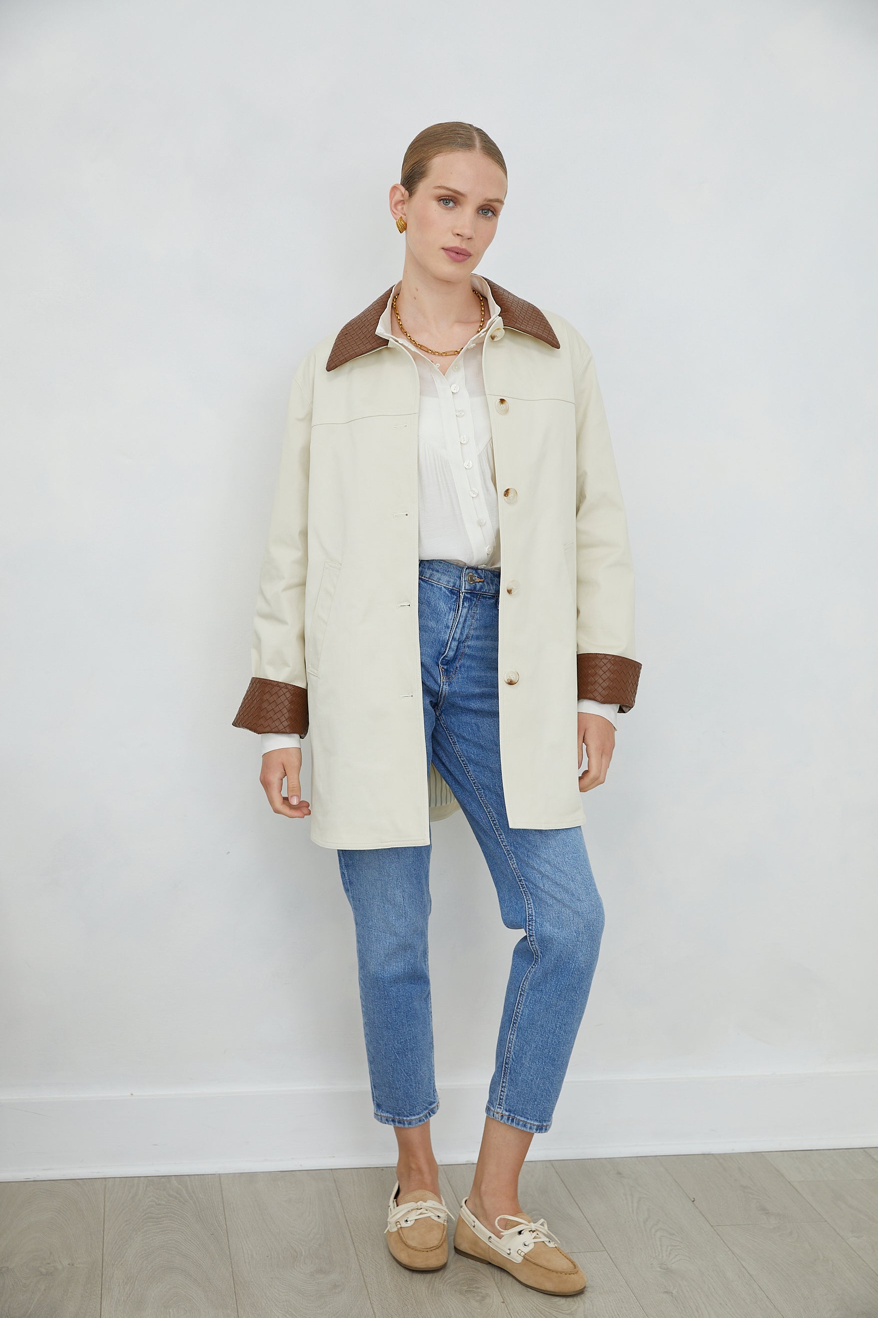 The ELIRA JACKET showcases refined tailoring with distinctive textural elements. Woven leather-effect cuffs and collar in rich brown create visual depth and tactile interest, while the button-down front ensures versatile styling. Expertly proportioned for layering, this piece bridges professional and leisure wear with understated sophistication. A considered addition to any curated collection.