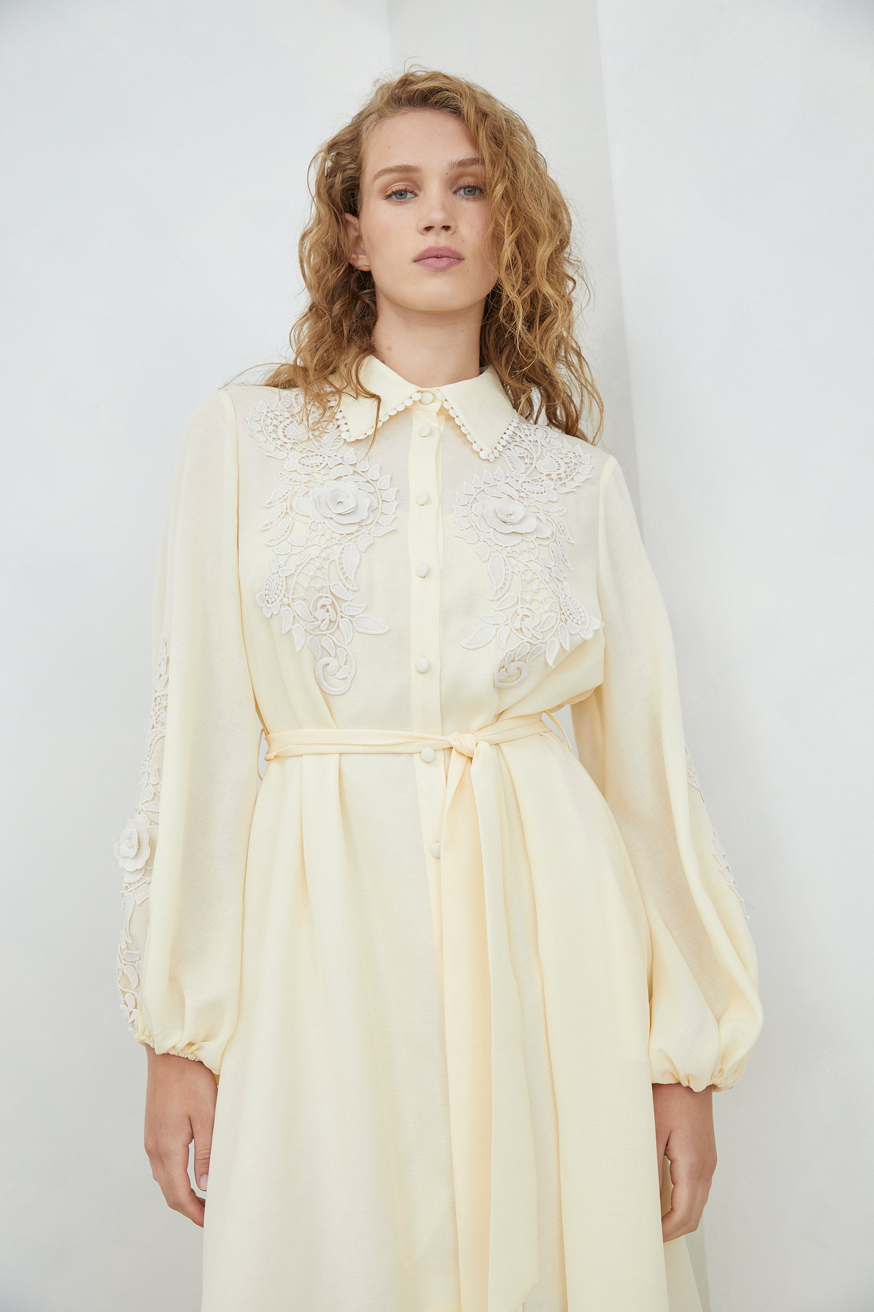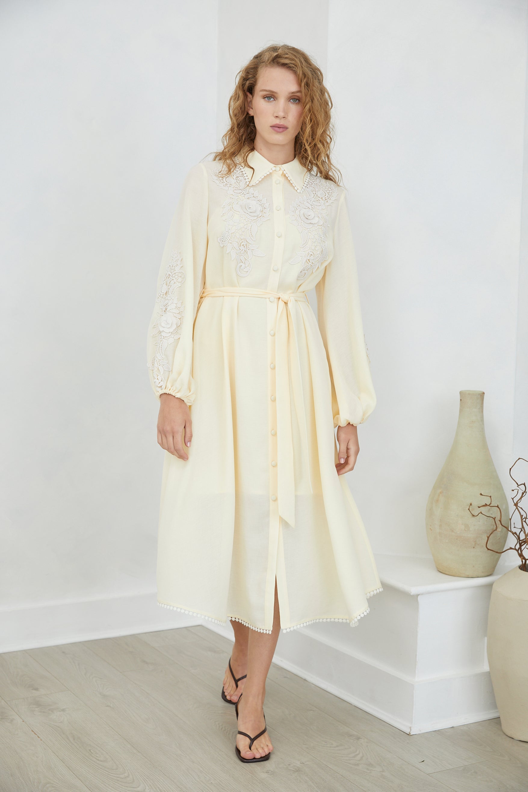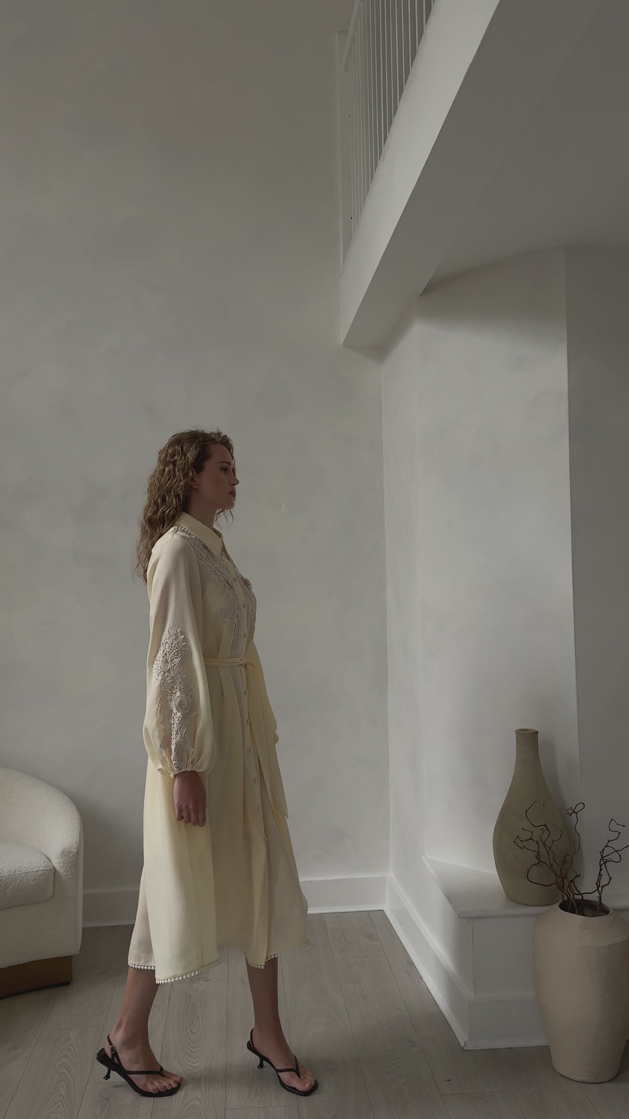 The GABY DRESS combines understated elegance with practical design. This lightweight button-down midi features delicate embroidery detailing that adds visual interest without compromising comfort. The relaxed silhouette and full-length cut offer versatile styling—dress it up for occasions or down for everyday wear. Perfect for layering or wearing solo, it's a refined piece that transitions effortlessly across seasons.