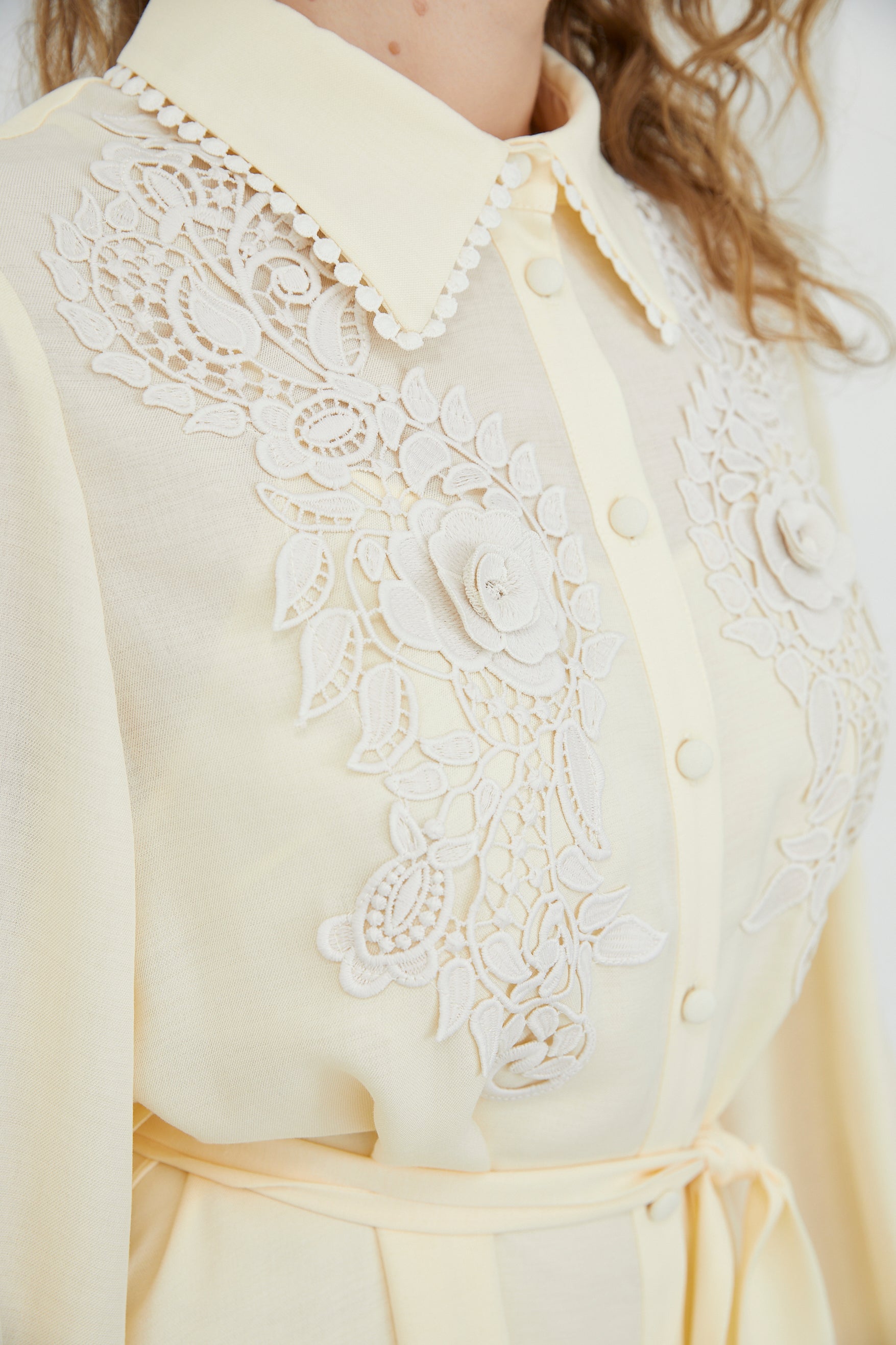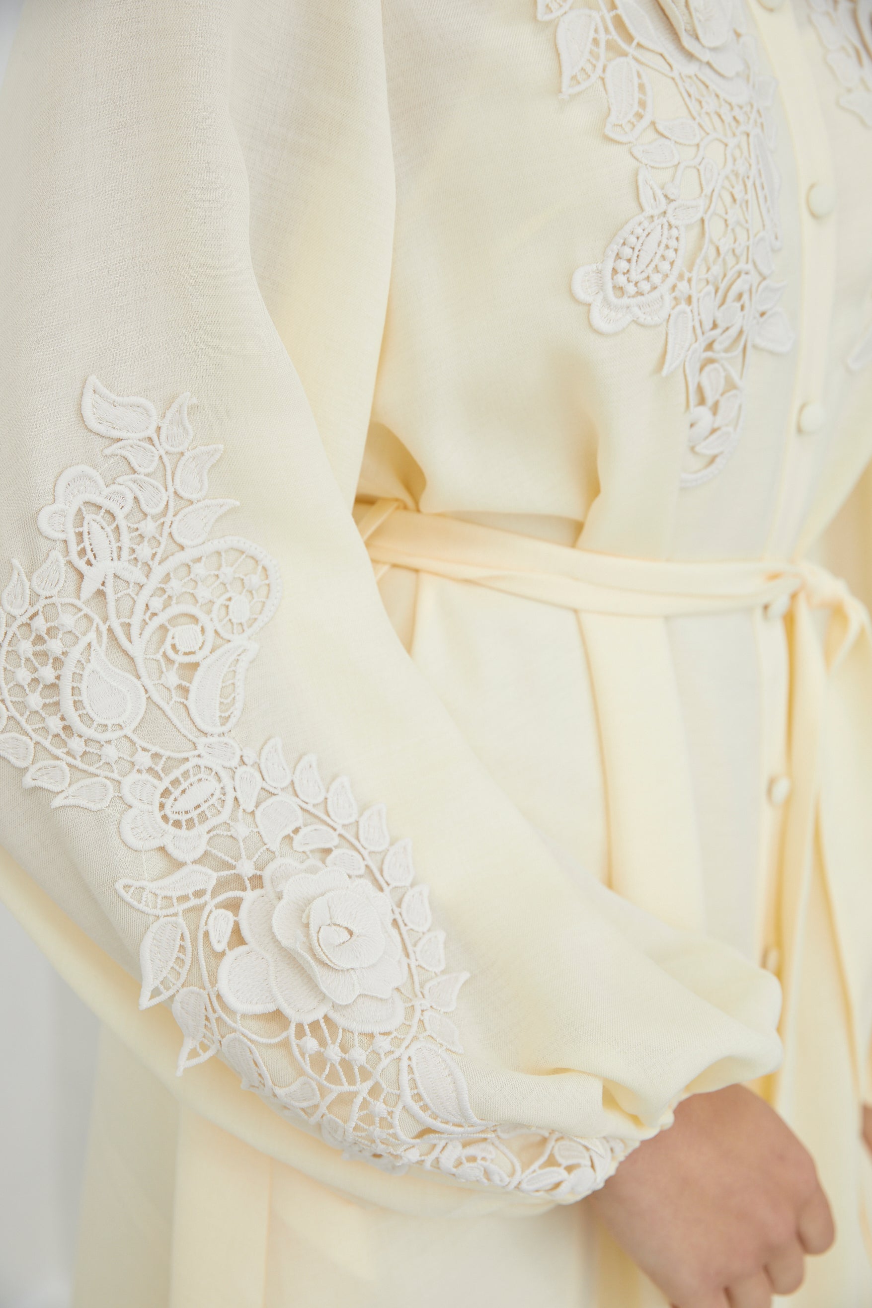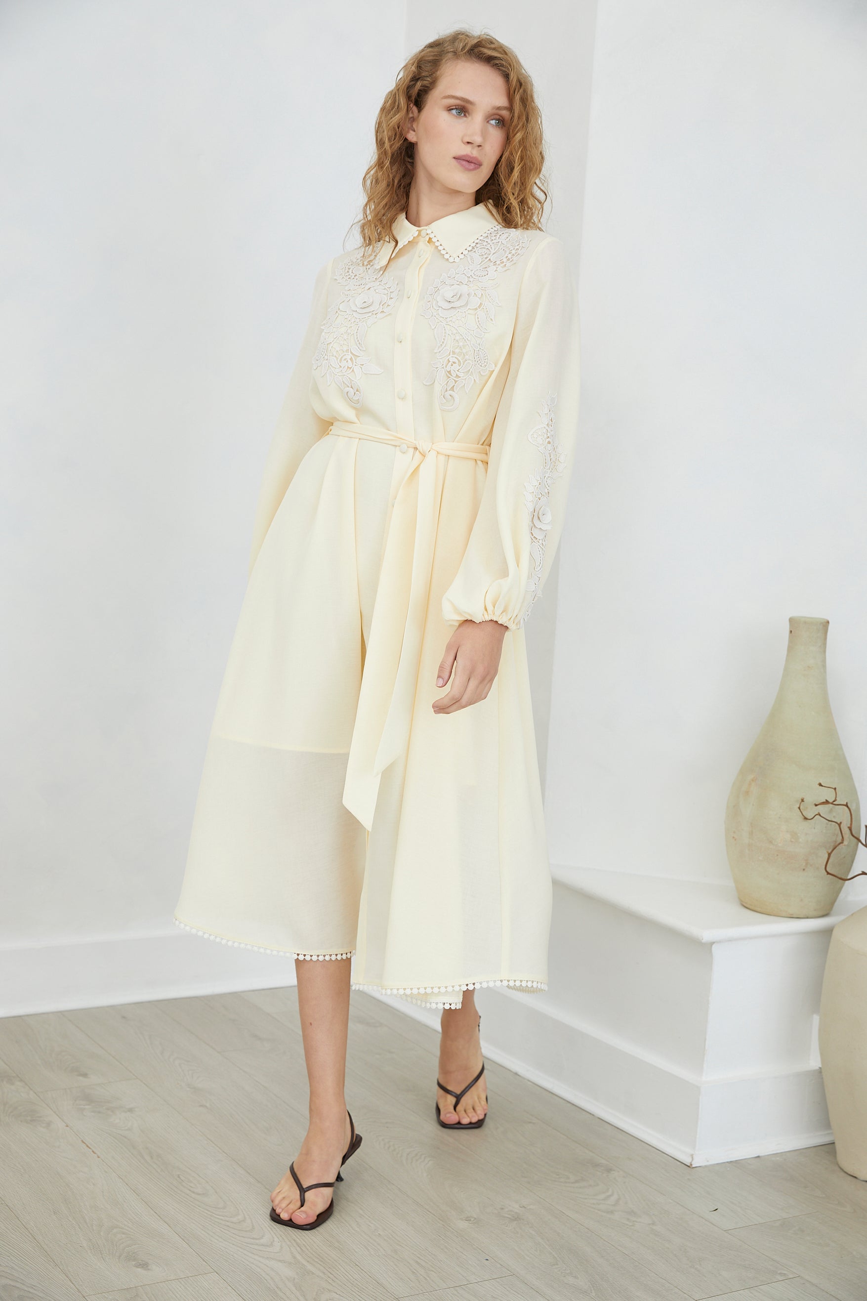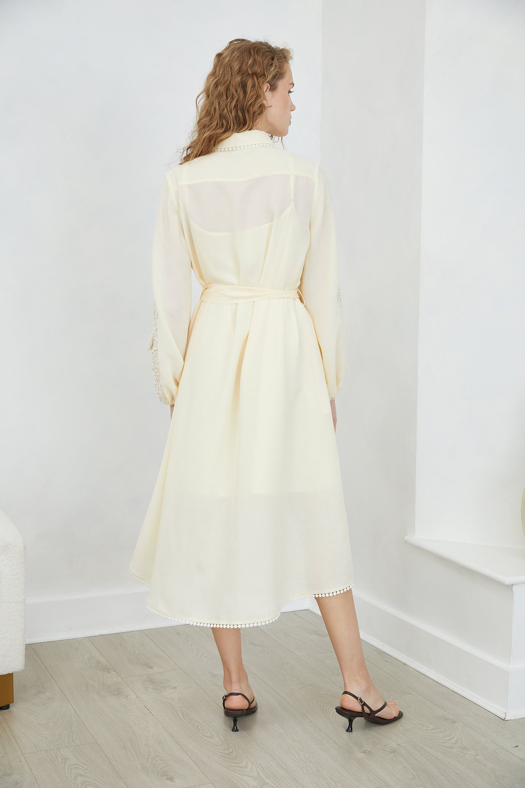 The GABY DRESS combines understated elegance with practical design. This lightweight button-down midi features delicate embroidery detailing that adds visual interest without compromising comfort. The relaxed silhouette and full-length cut offer versatile styling—dress it up for occasions or down for everyday wear. Perfect for layering or wearing solo, it's a refined piece that transitions effortlessly across seasons.