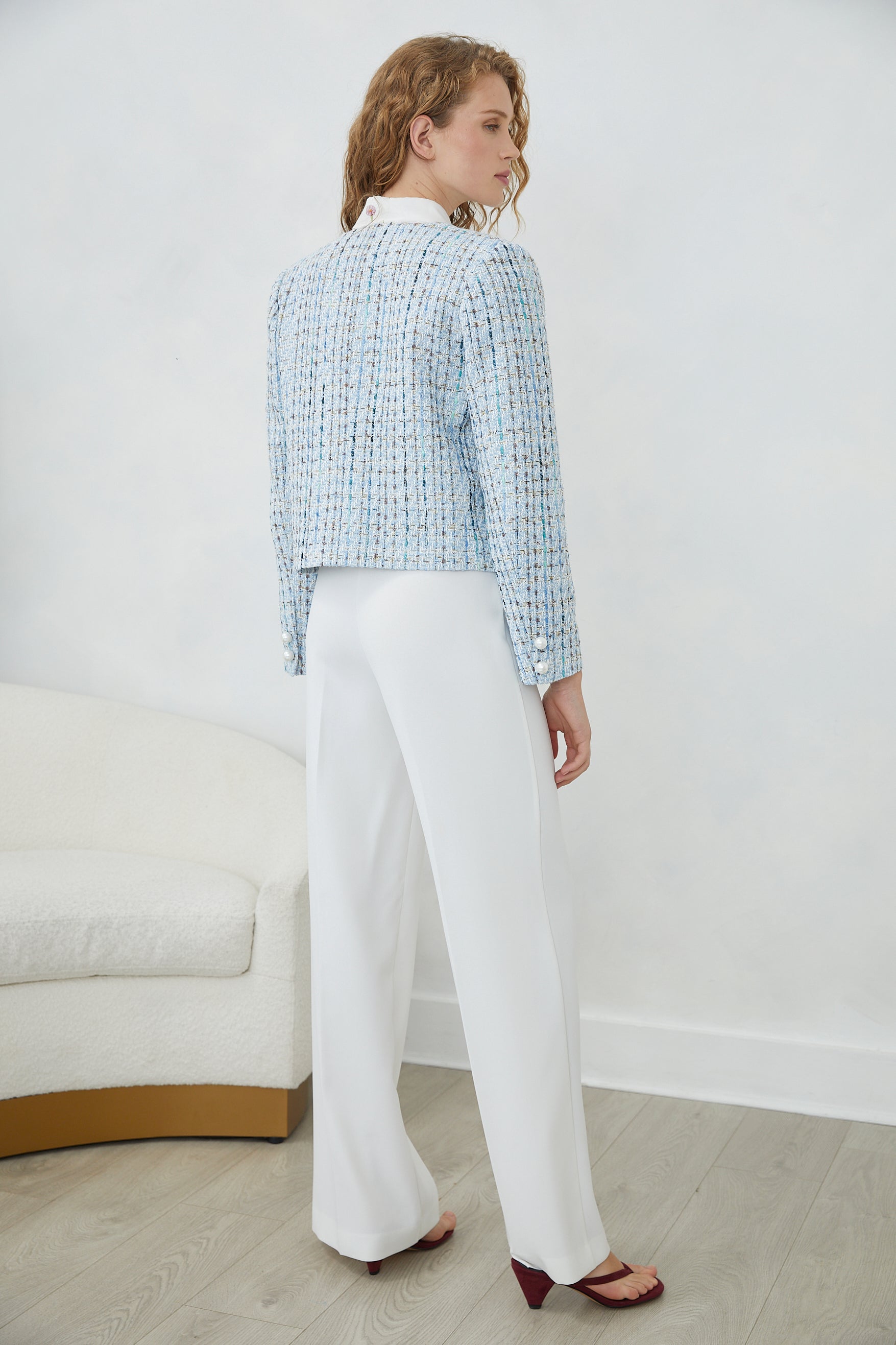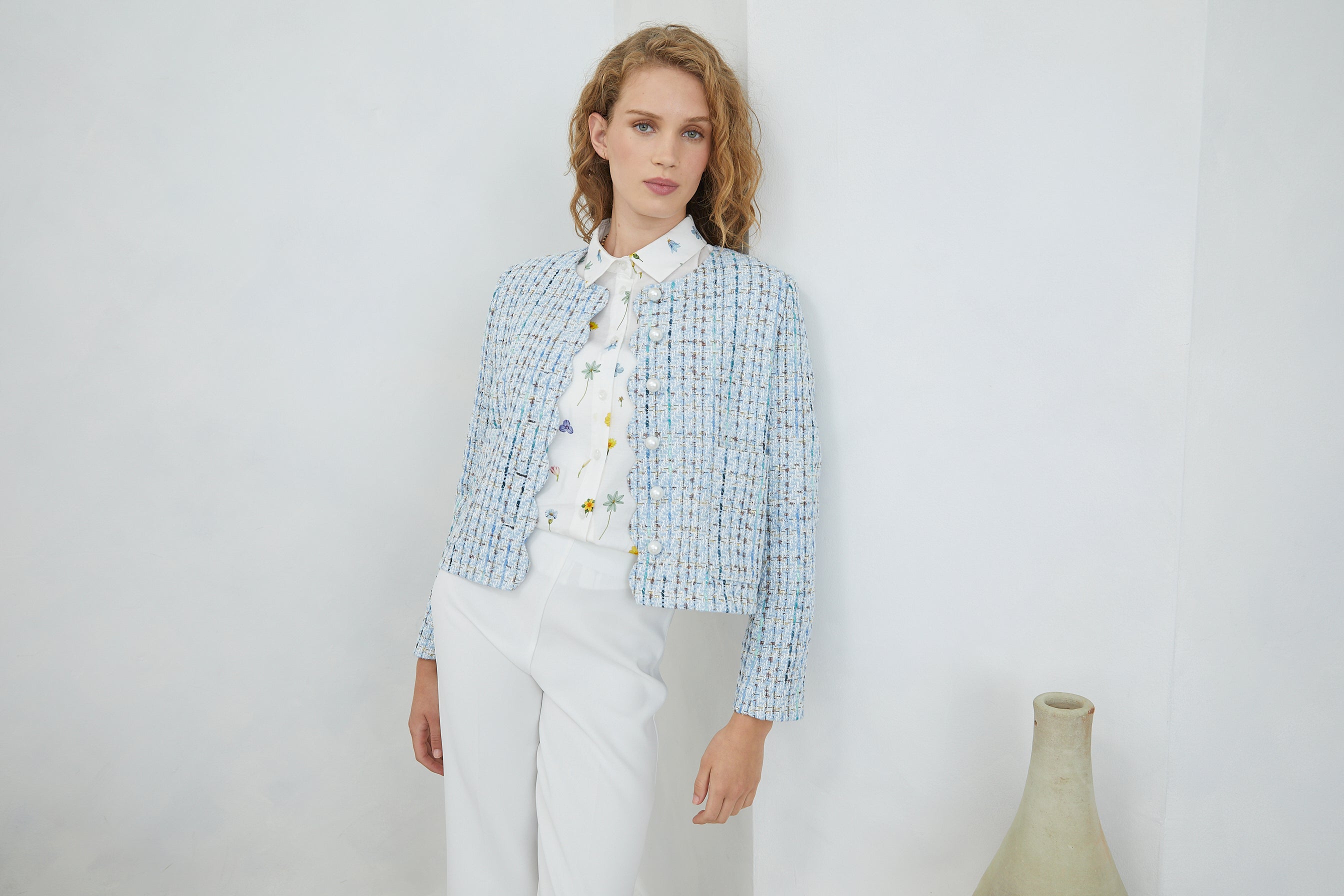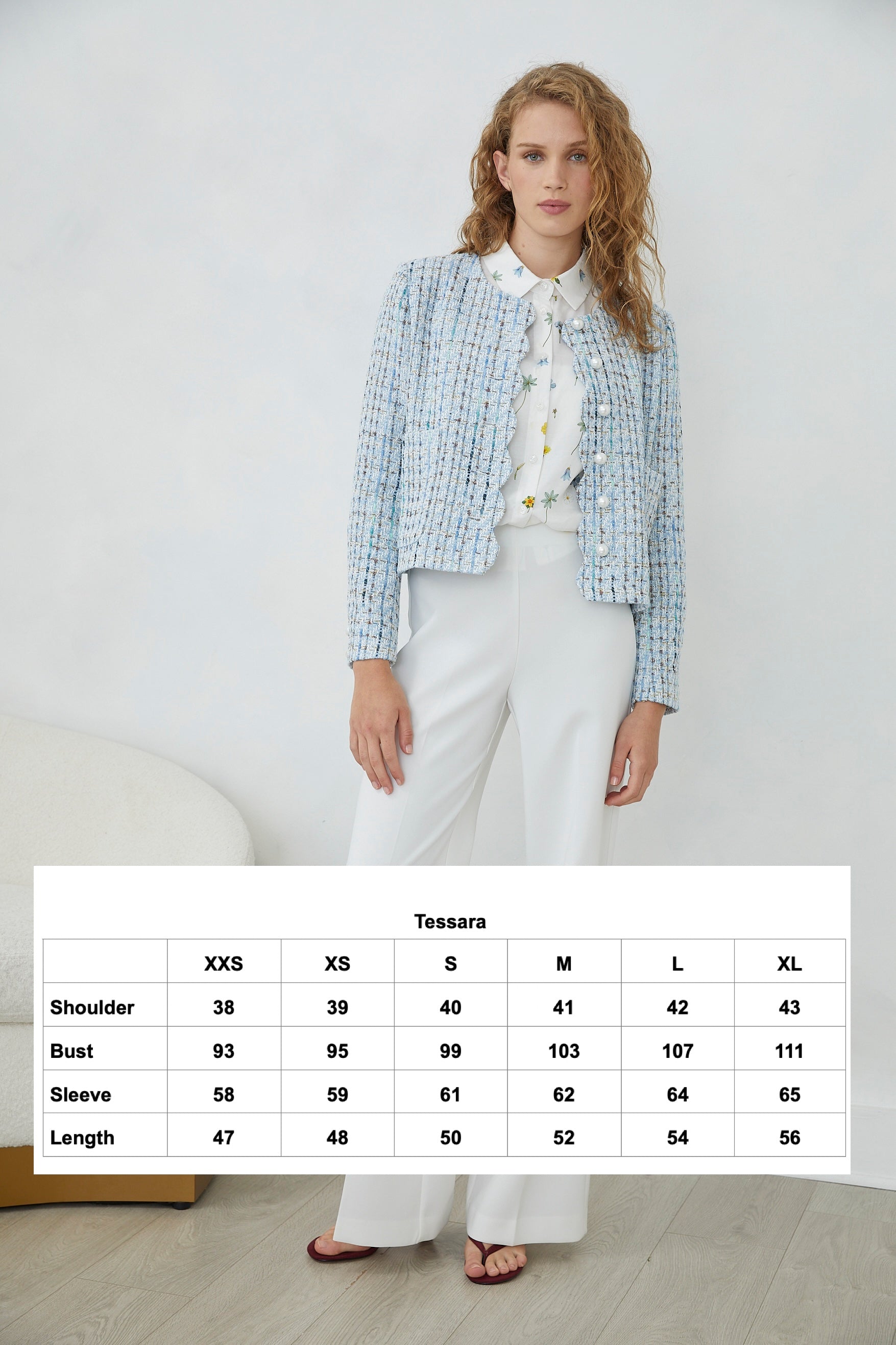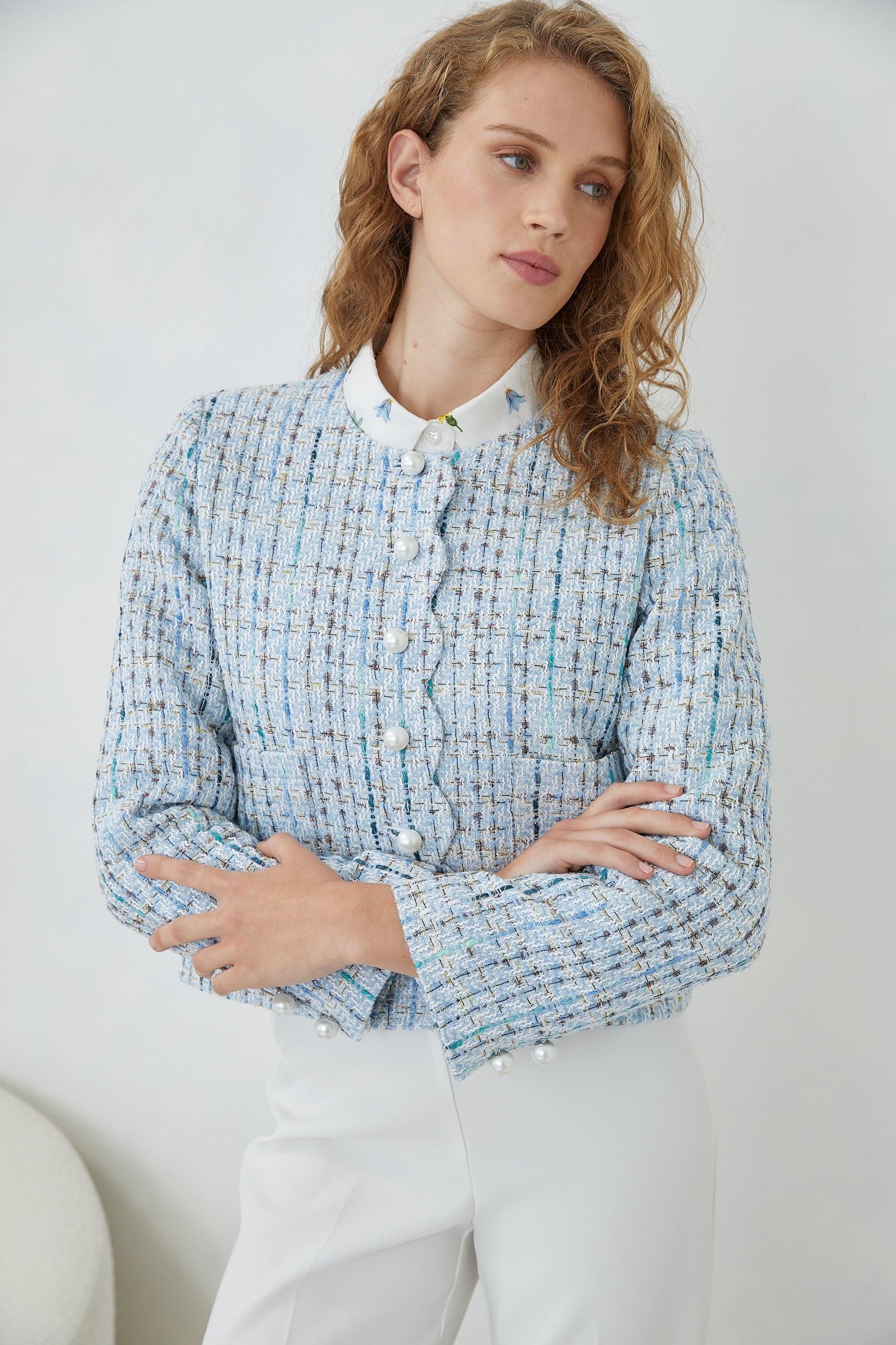 The TESSARA JACKET channels timeless elegance through its refined tweed construction, elevated by lustrous pearl buttons that catch the light with understated luxury. Practical front pockets offer functional sophistication, making this piece as wearable as it is striking. A wardrobe essential that bridges classic tailoring with contemporary ease.
