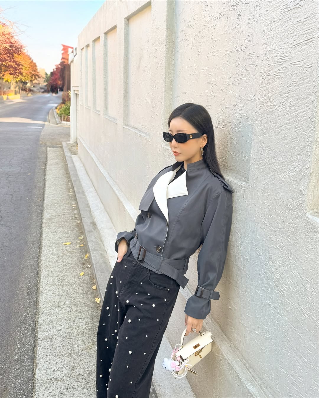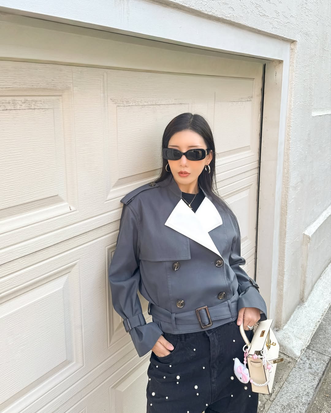 This sophisticated Wylie Jacket in grey offers a lightweight, cropped trench style perfect for transitional weather. Its utility design combines practicality with elegance, while the contrasting white details add a refined touch, making it a versatile piece for polished, modern wardrobes.