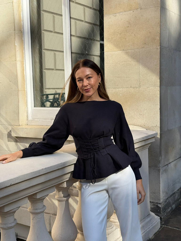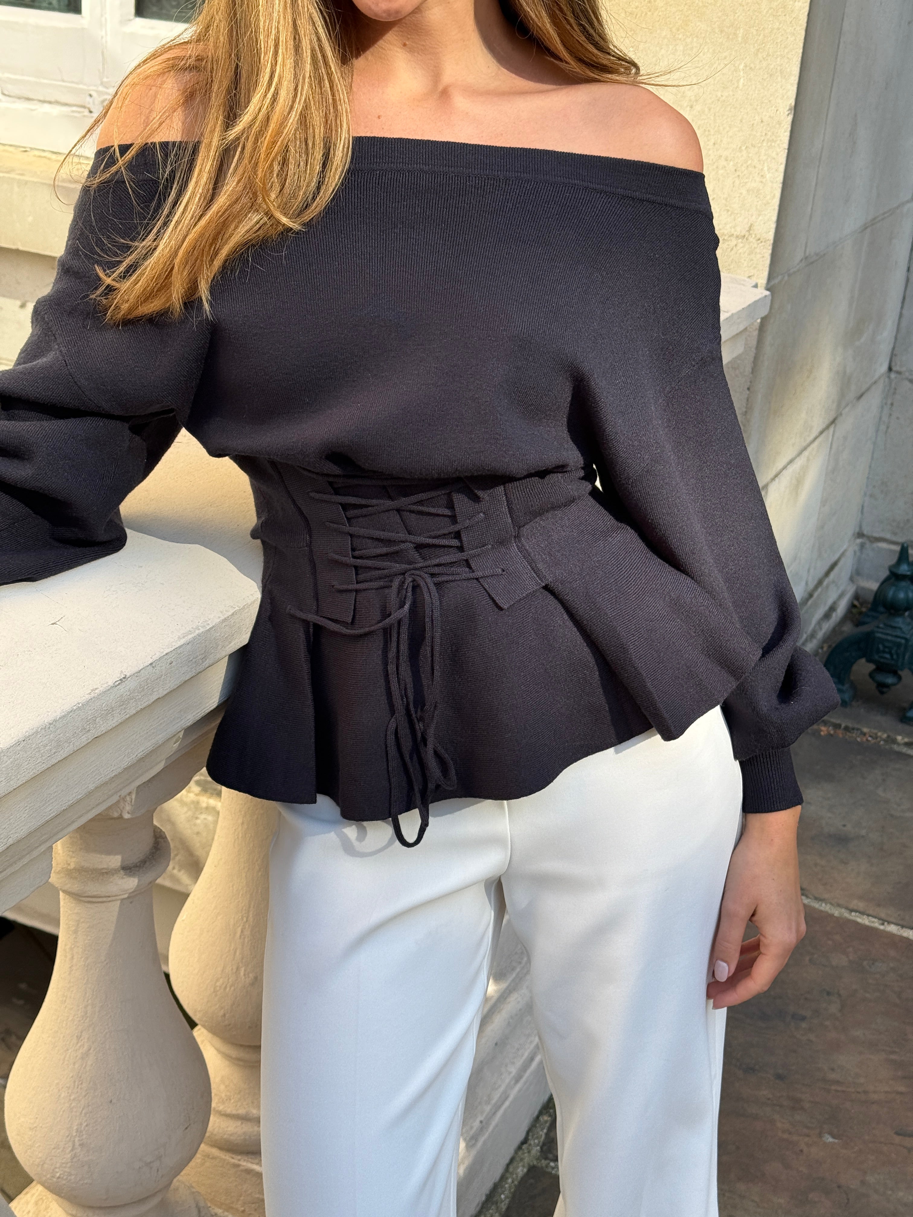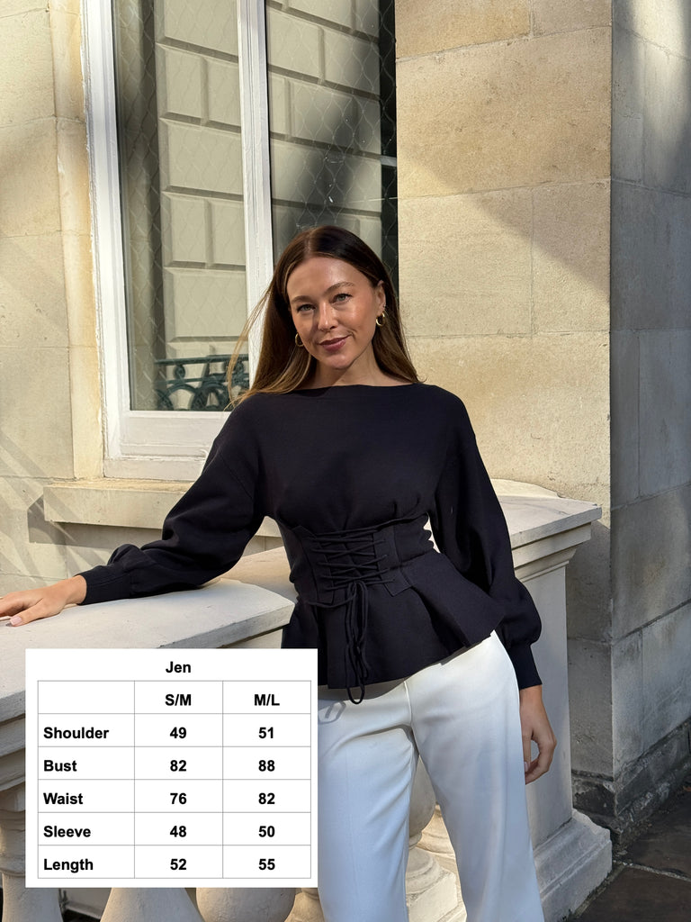 This elegant JEN Jumper in black features a corset-style design that cinches beautifully at the waist, enhancing your silhouette with a refined touch. The off-the-shoulder neckline adds a sophisticated and feminine allure, it can also be worn at the neckline. Crafted to blend comfort with statement style, this jumper is a versatile addition to any wardrobe.