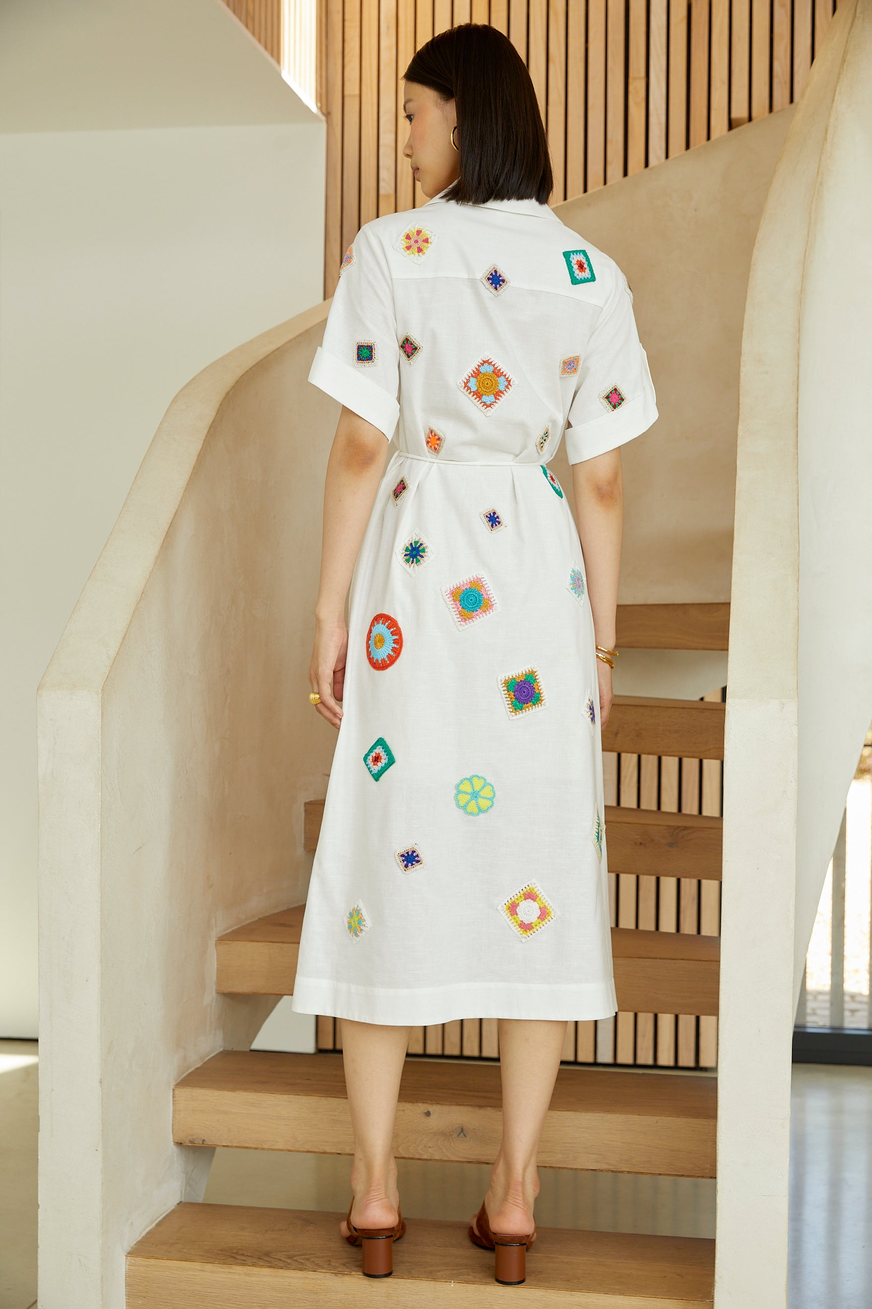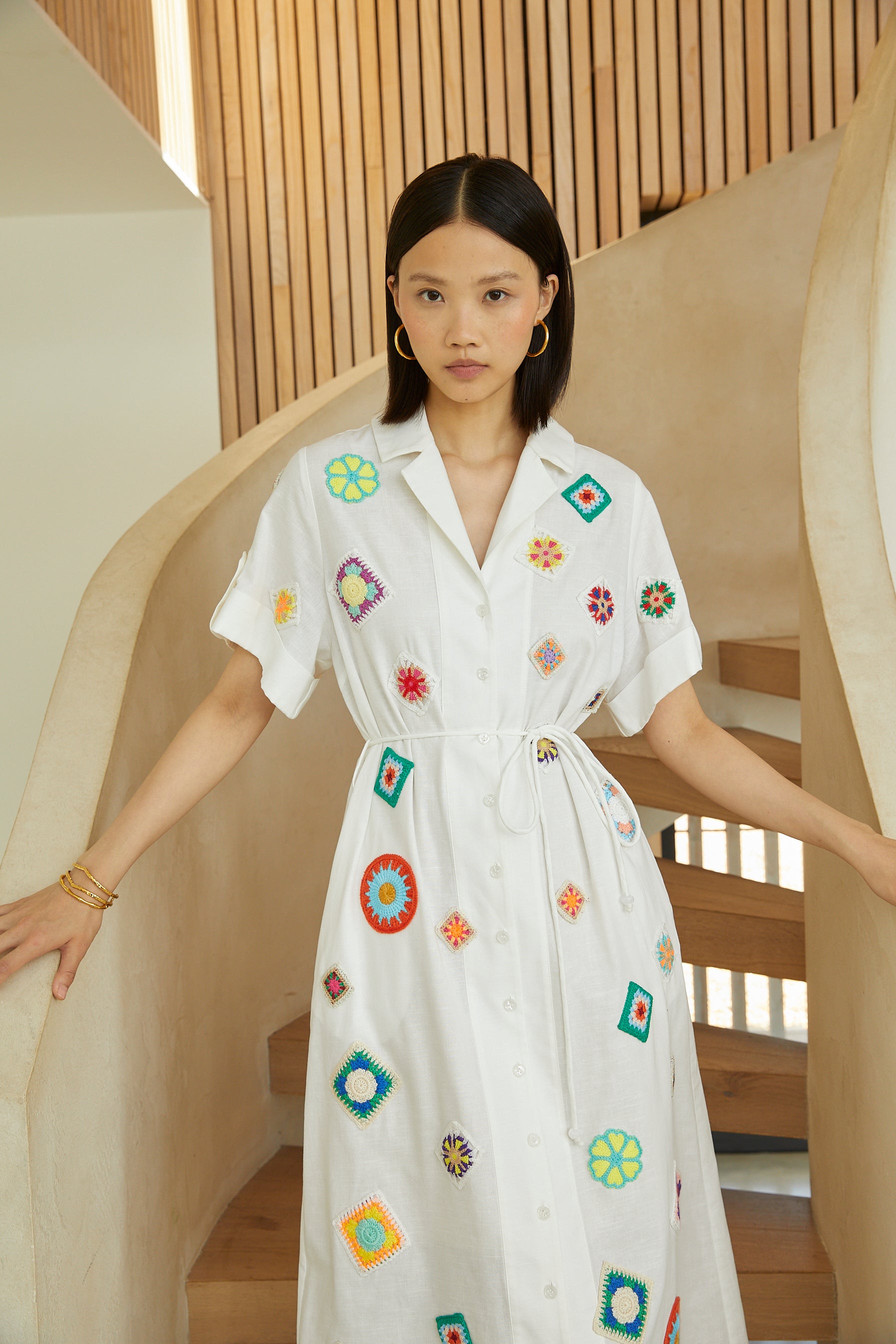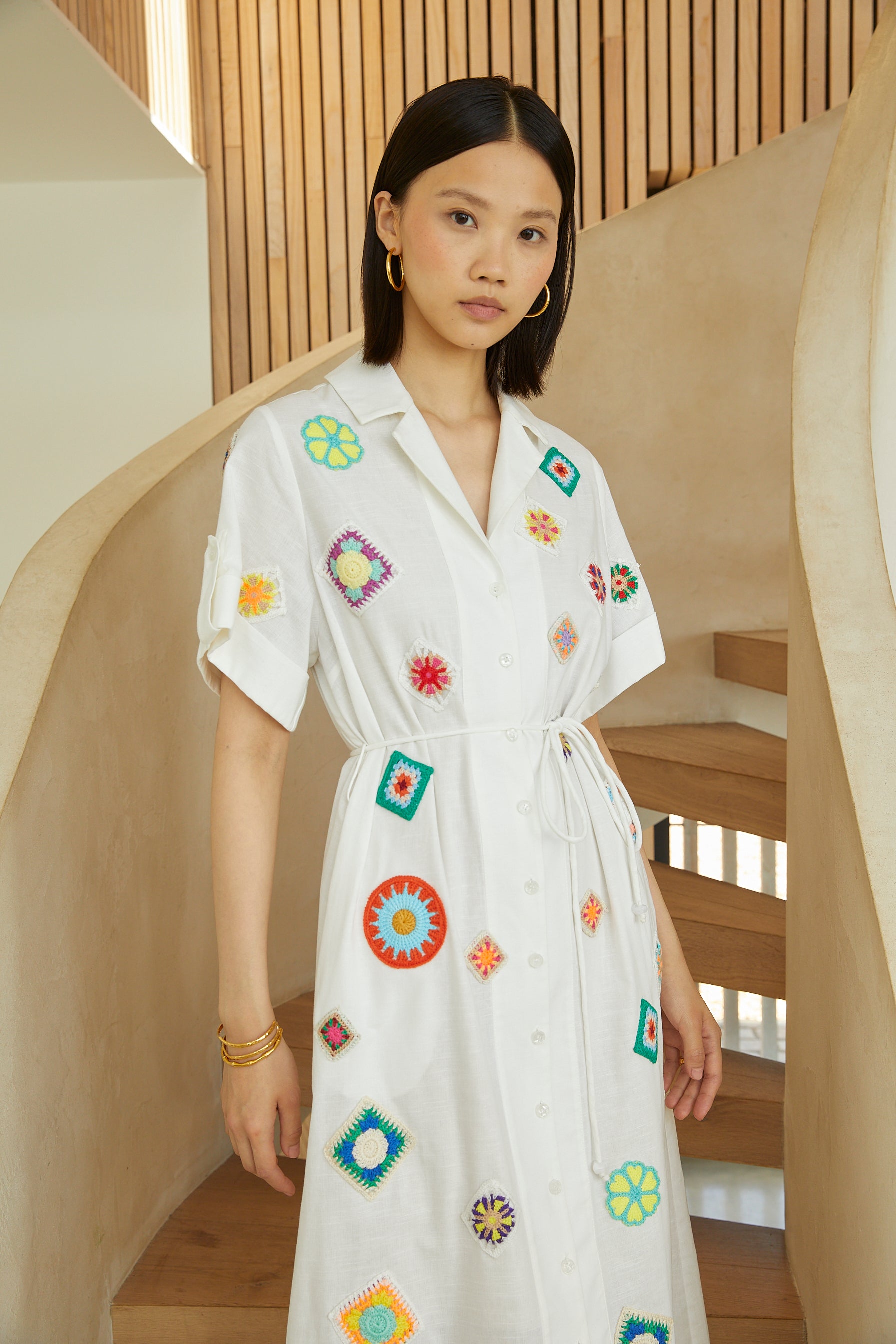 Hand-sewn crochet appliqués are scattered throughout, adding vibrant pops of colour and an artisanal touch that makes each piece feel unique. The relaxed silhouette is softly defined with a self-tie waist, while the midi length ensures easy, versatile wear. Fully lined with a 100% viscose slip for added comfort, this dress blends craftsmanship with everyday elegance.