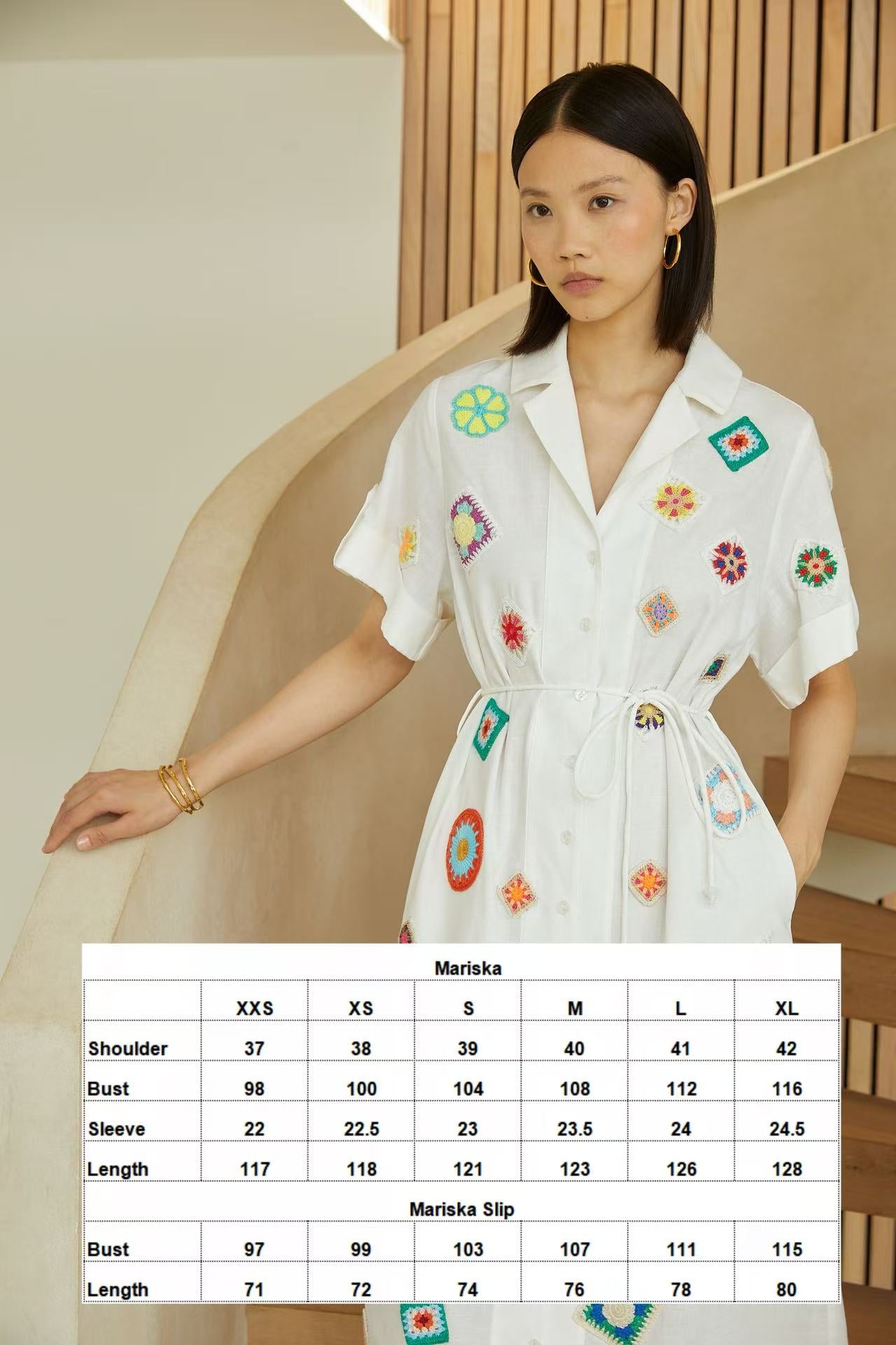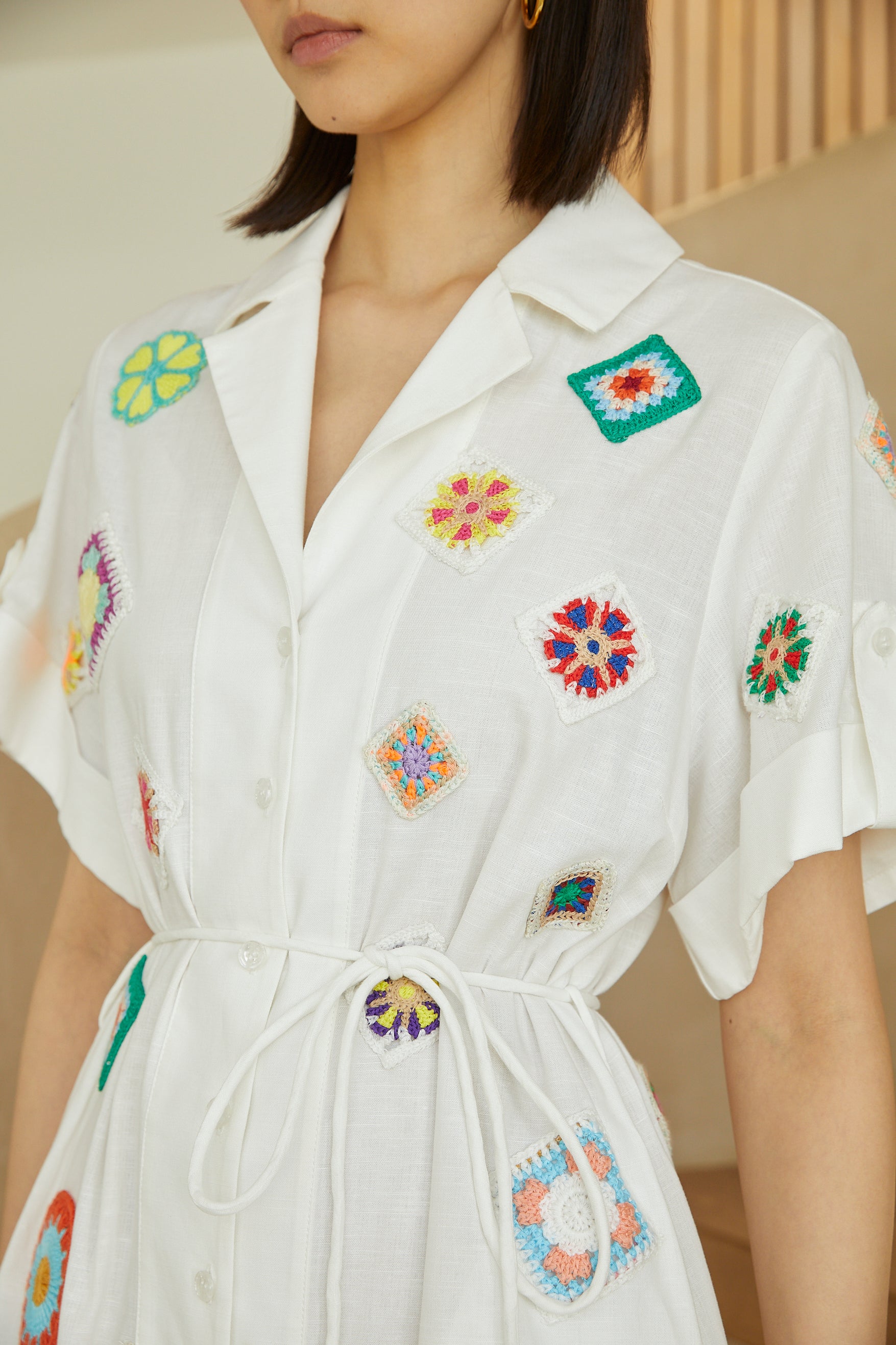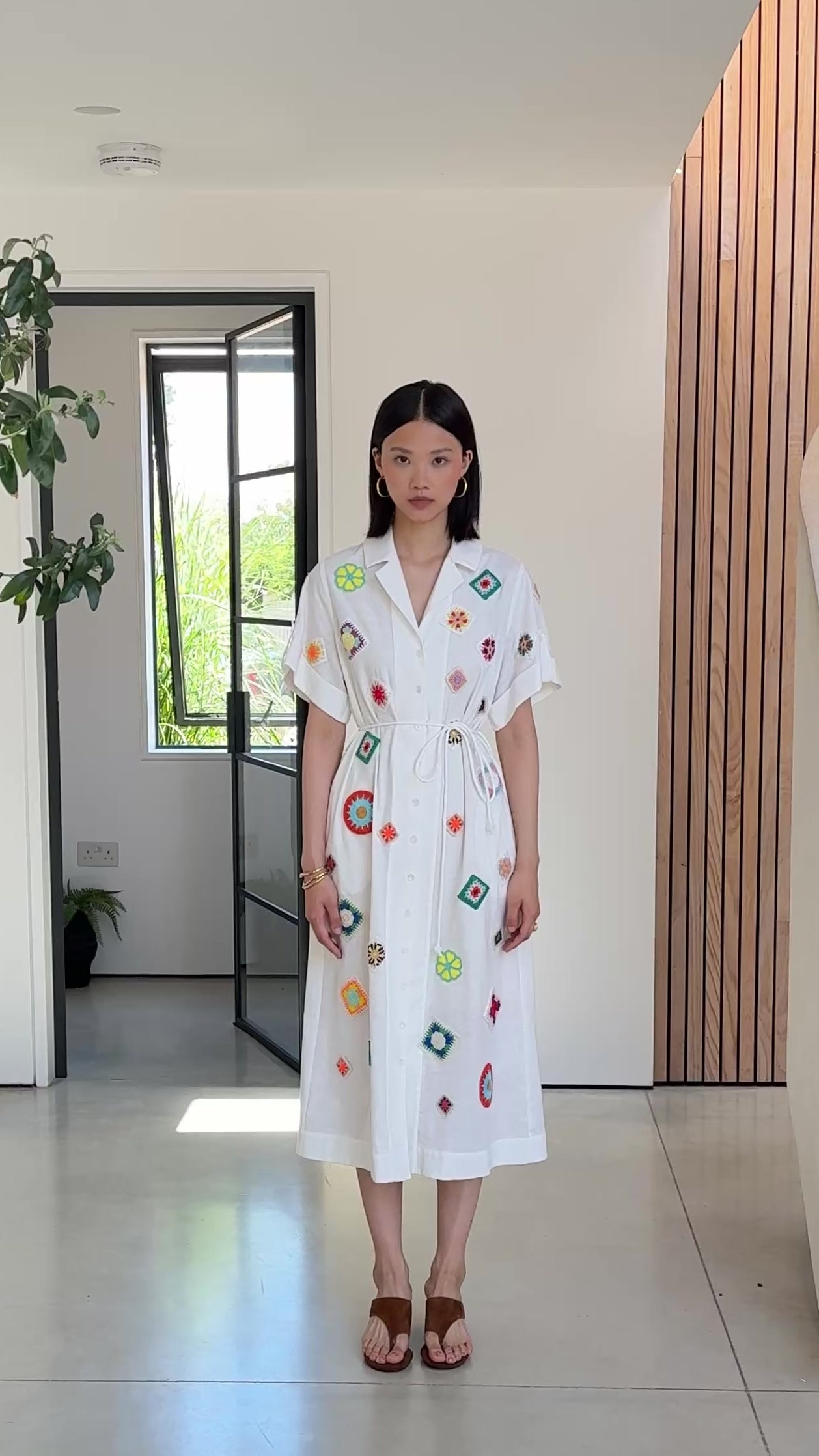 Hand-sewn crochet appliqués are scattered throughout, adding vibrant pops of colour and an artisanal touch that makes each piece feel unique. The relaxed silhouette is softly defined with a self-tie waist, while the midi length ensures easy, versatile wear. Fully lined with a 100% viscose slip for added comfort, this dress blends craftsmanship with everyday elegance.