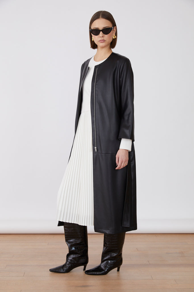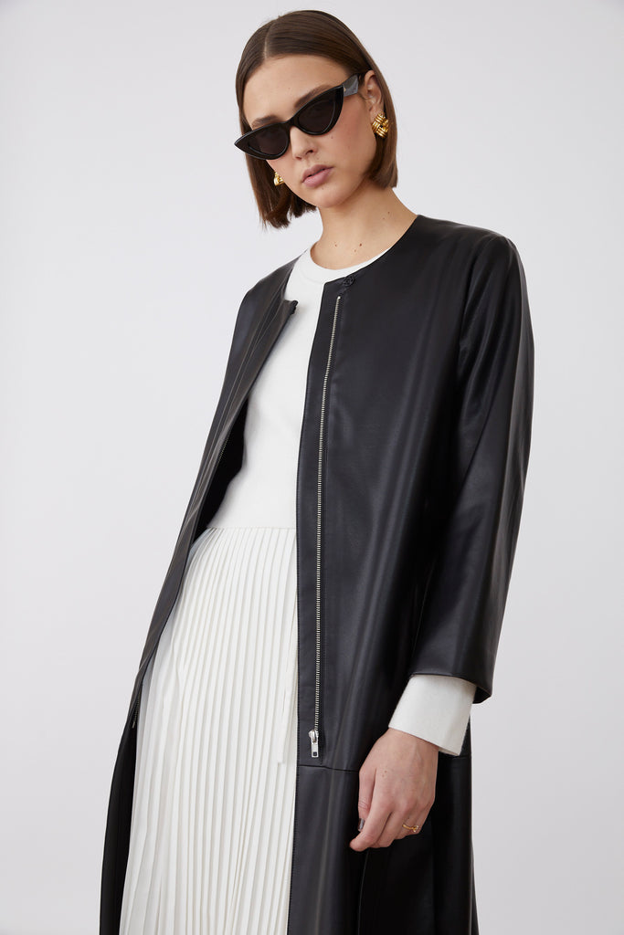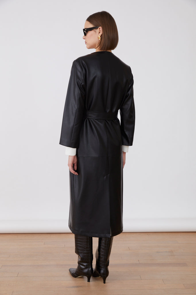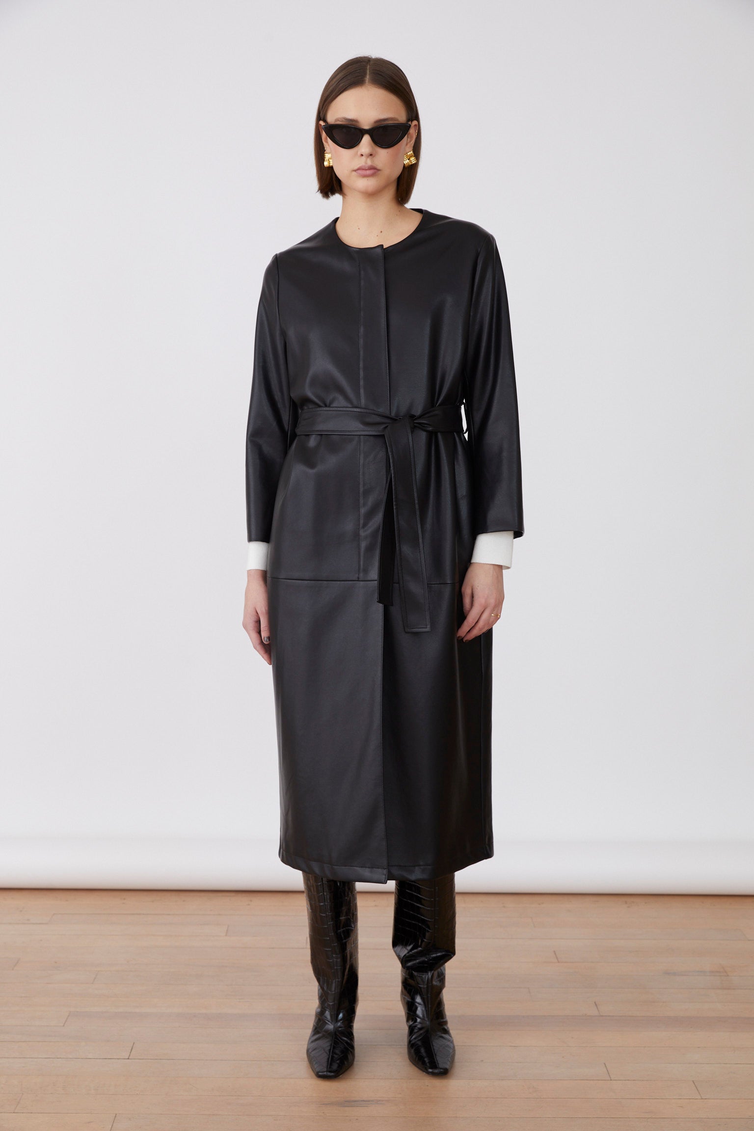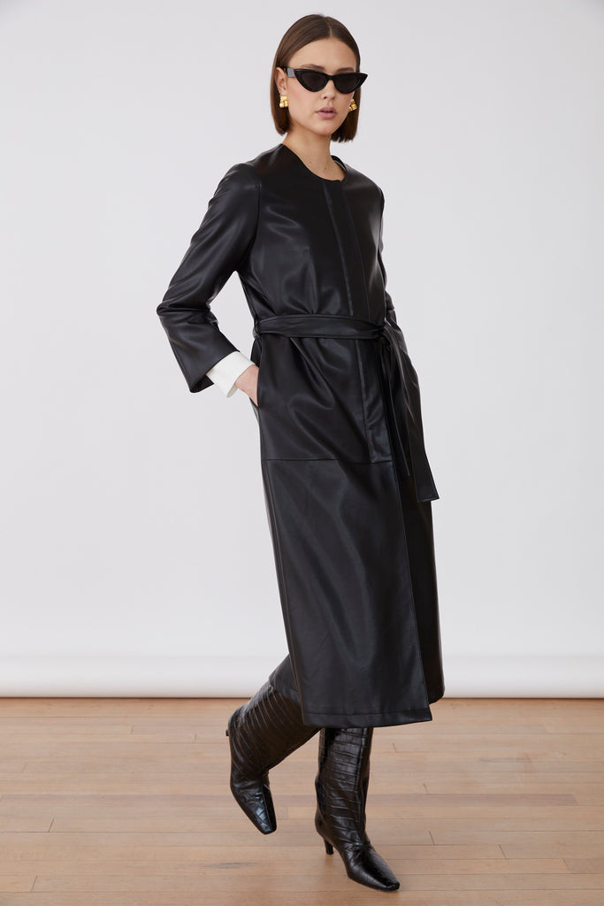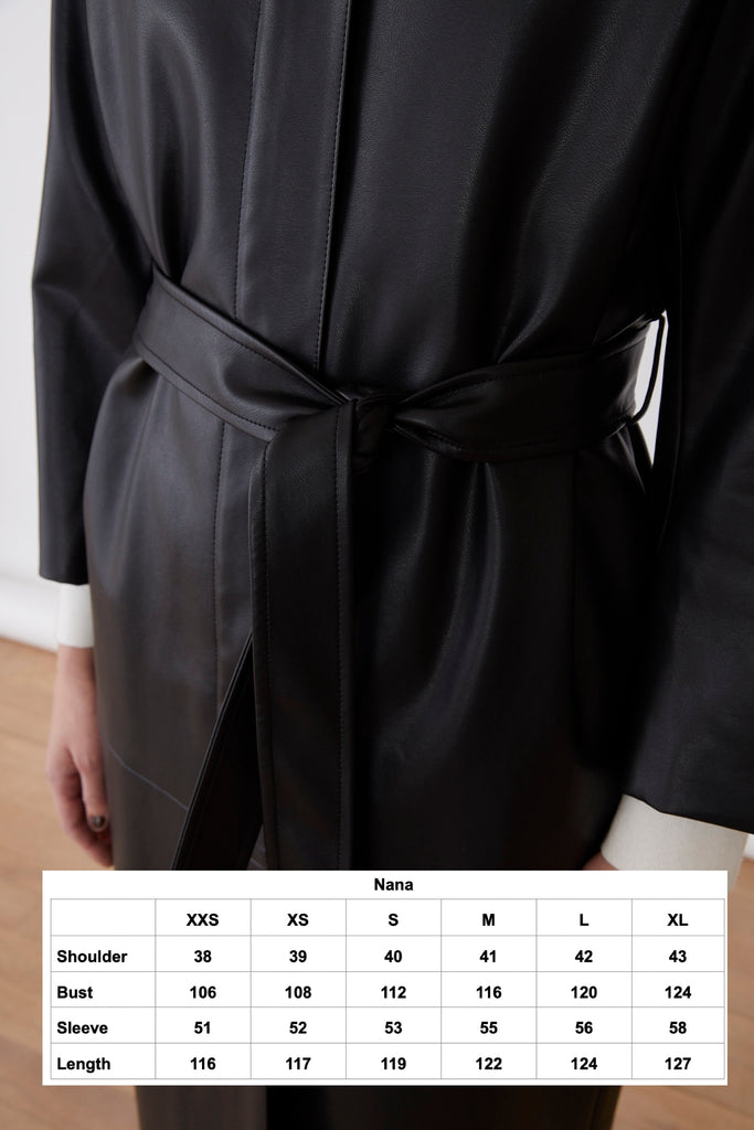 Crafted from sleek PU material, the NANA PU TRENCH features a half-way zip and a tie at the waist for a tailored silhouette. Its round neckline lends a refined touch, while the overall design offers a polished, sophisticated look.