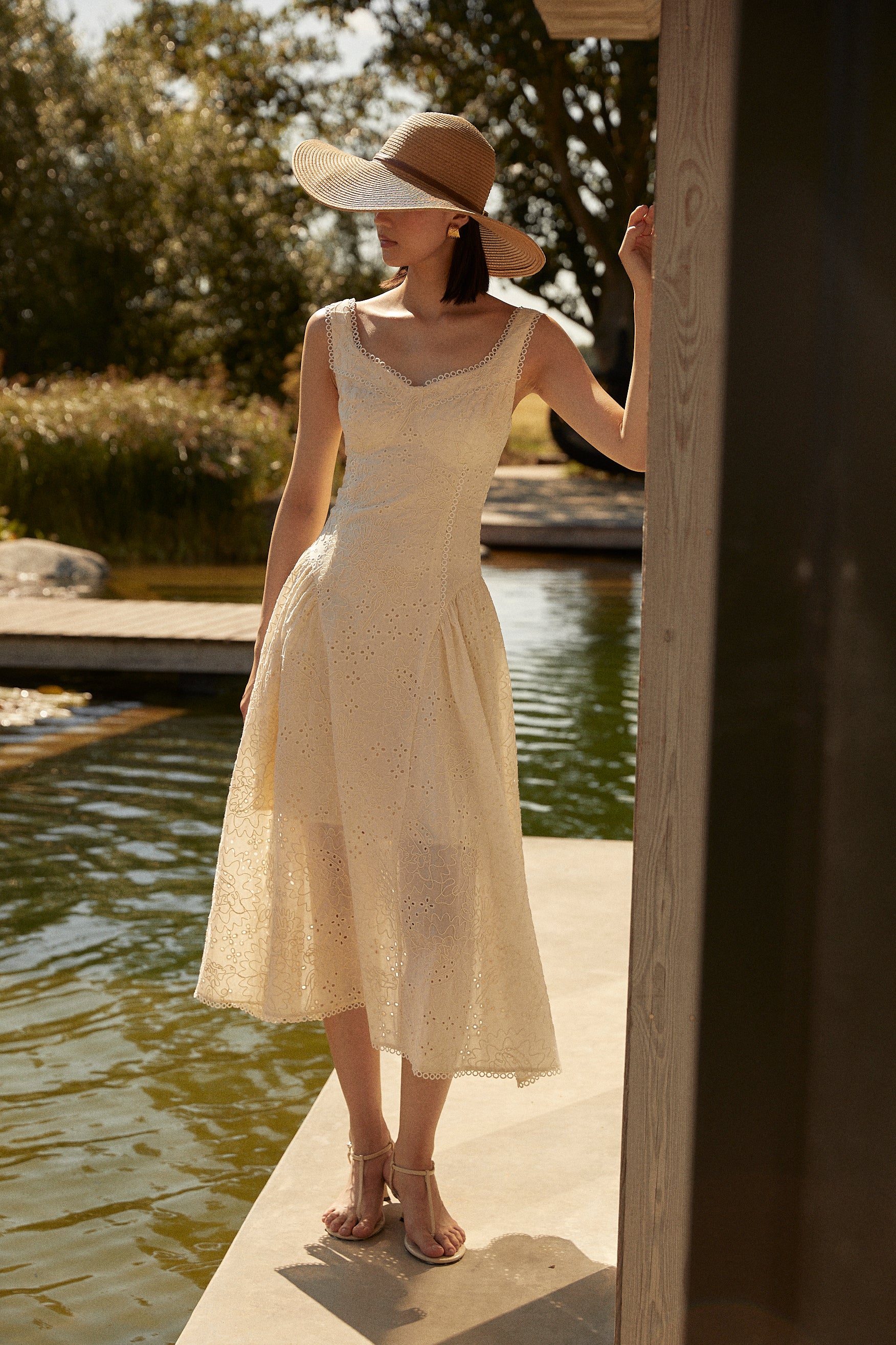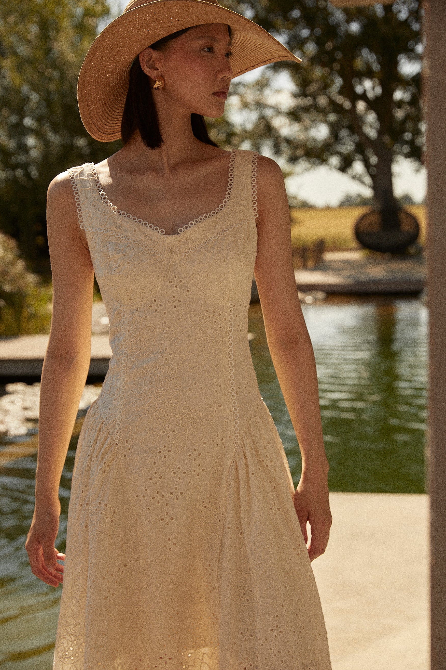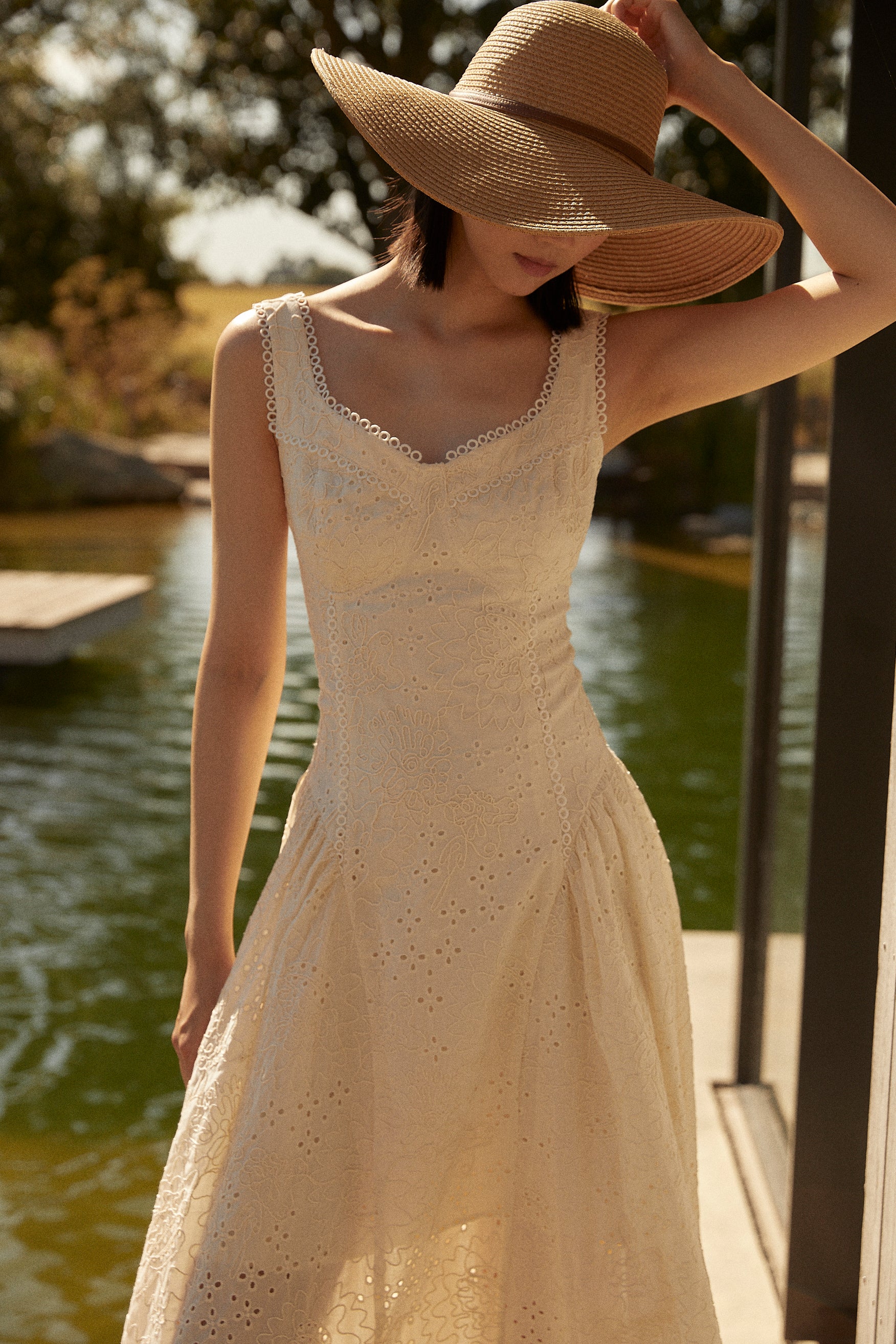 The fitted bodice with a gently curved neckline is framed by wide straps, creating a flattering, feminine silhouette. It flows into a full midi-length skirt with delicate cutwork patterns that bring lightness and movement to the design. Perfect for both daytime and evening wear, this piece blends classic charm with modern refinement.