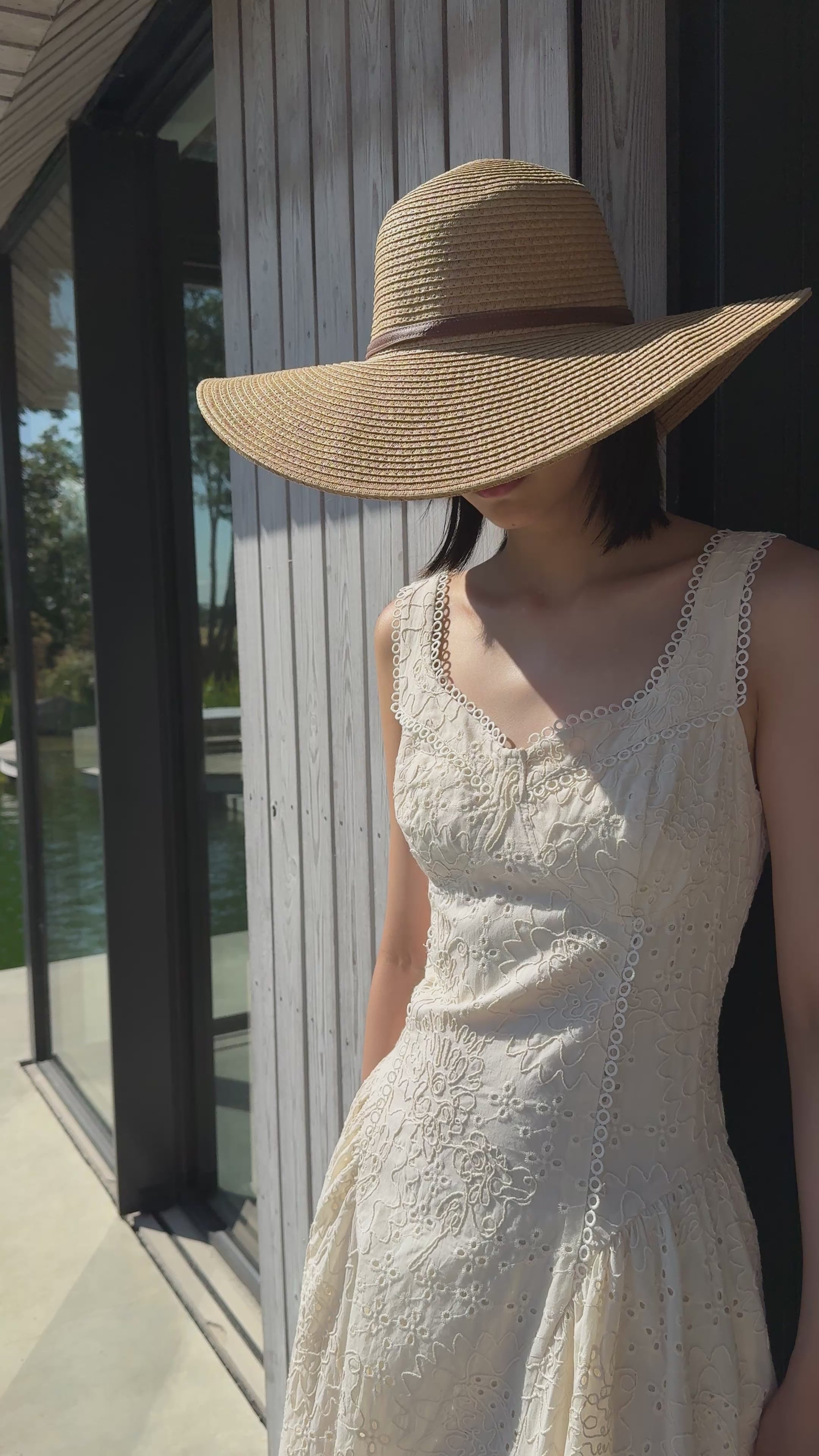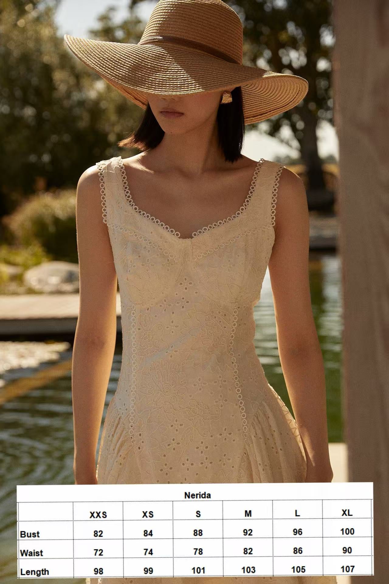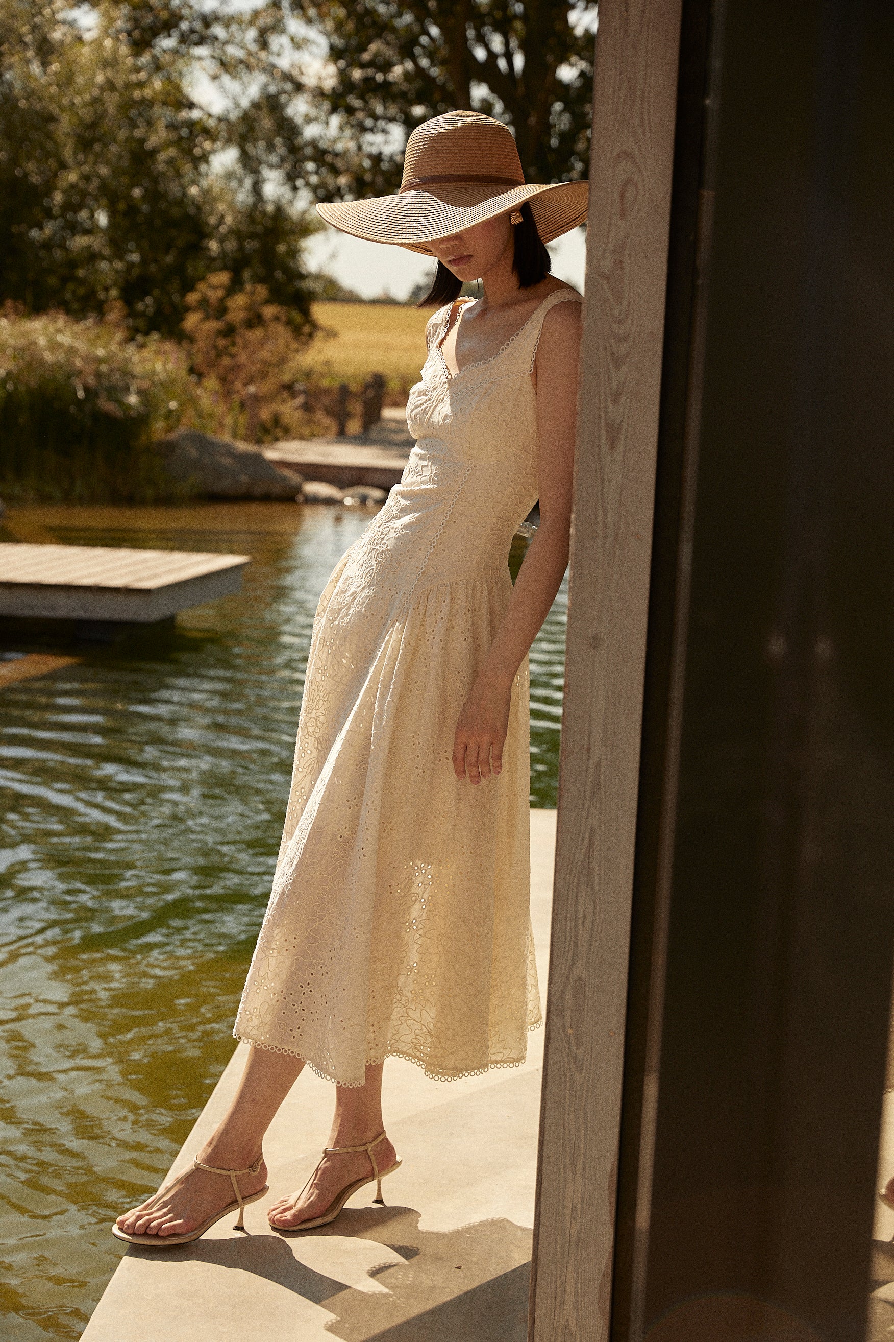 The fitted bodice with a gently curved neckline is framed by wide straps, creating a flattering, feminine silhouette. It flows into a full midi-length skirt with delicate cutwork patterns that bring lightness and movement to the design. Perfect for both daytime and evening wear, this piece blends classic charm with modern refinement.