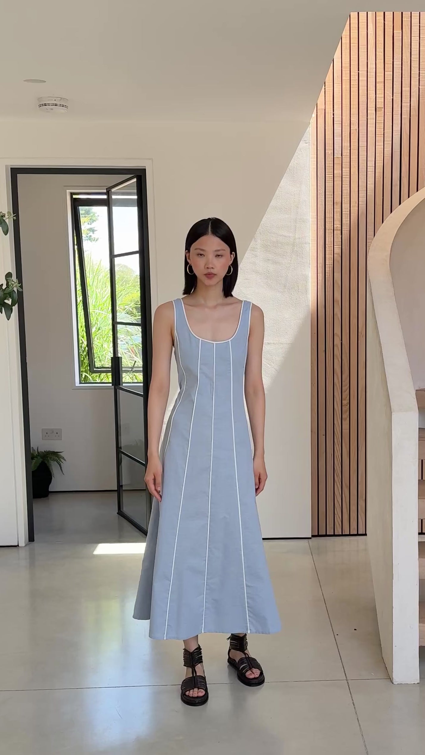 Clean, modern, and effortlessly refined, this dress is crafted from a breathable blend of 70% cotton and 30% linen, offering a lightweight feel with a natural, textured finish. Designed in a soft blue hue, it features a minimalist silhouette elevated by subtle contrast piping that elongates and flatters the form.