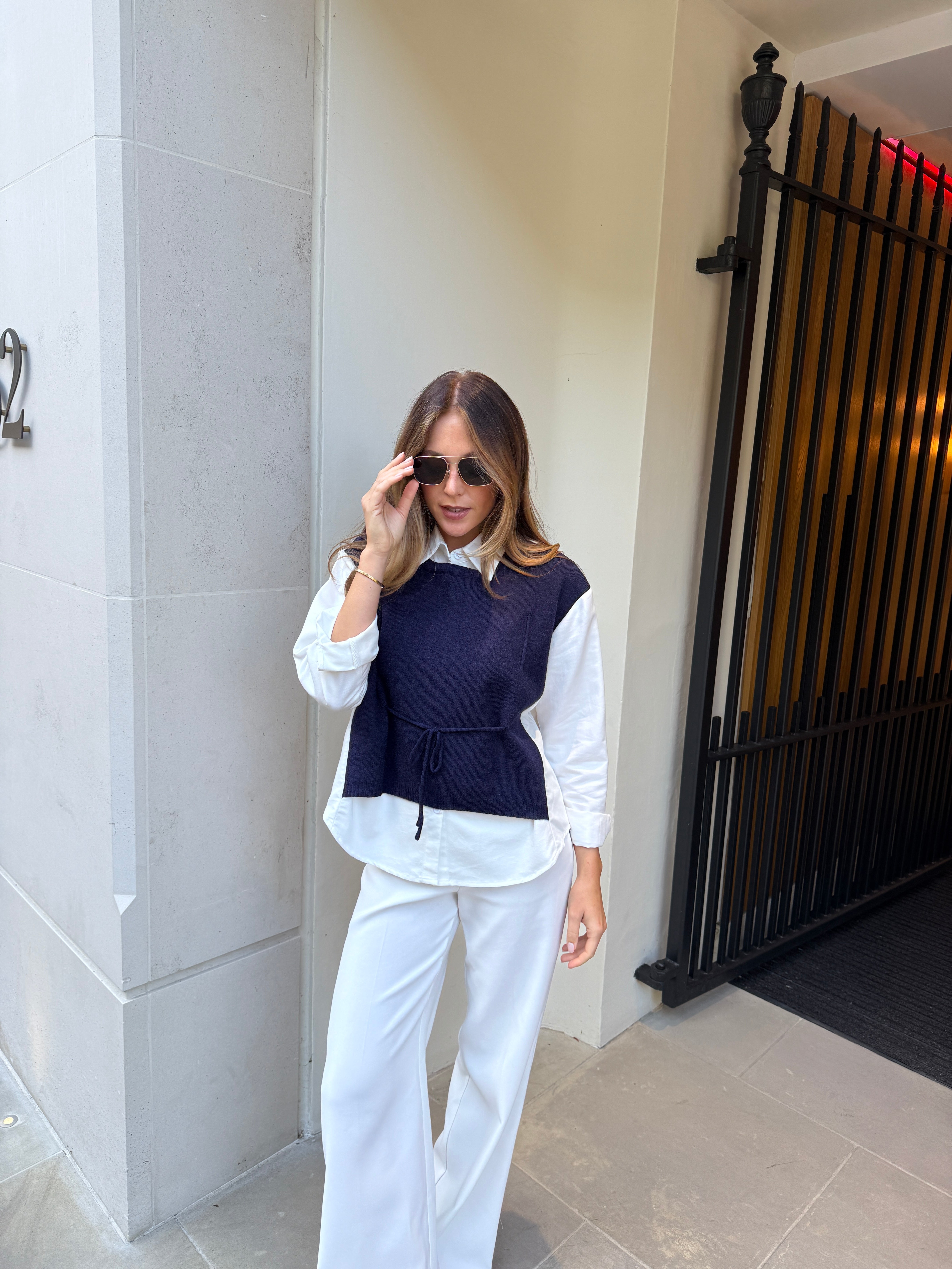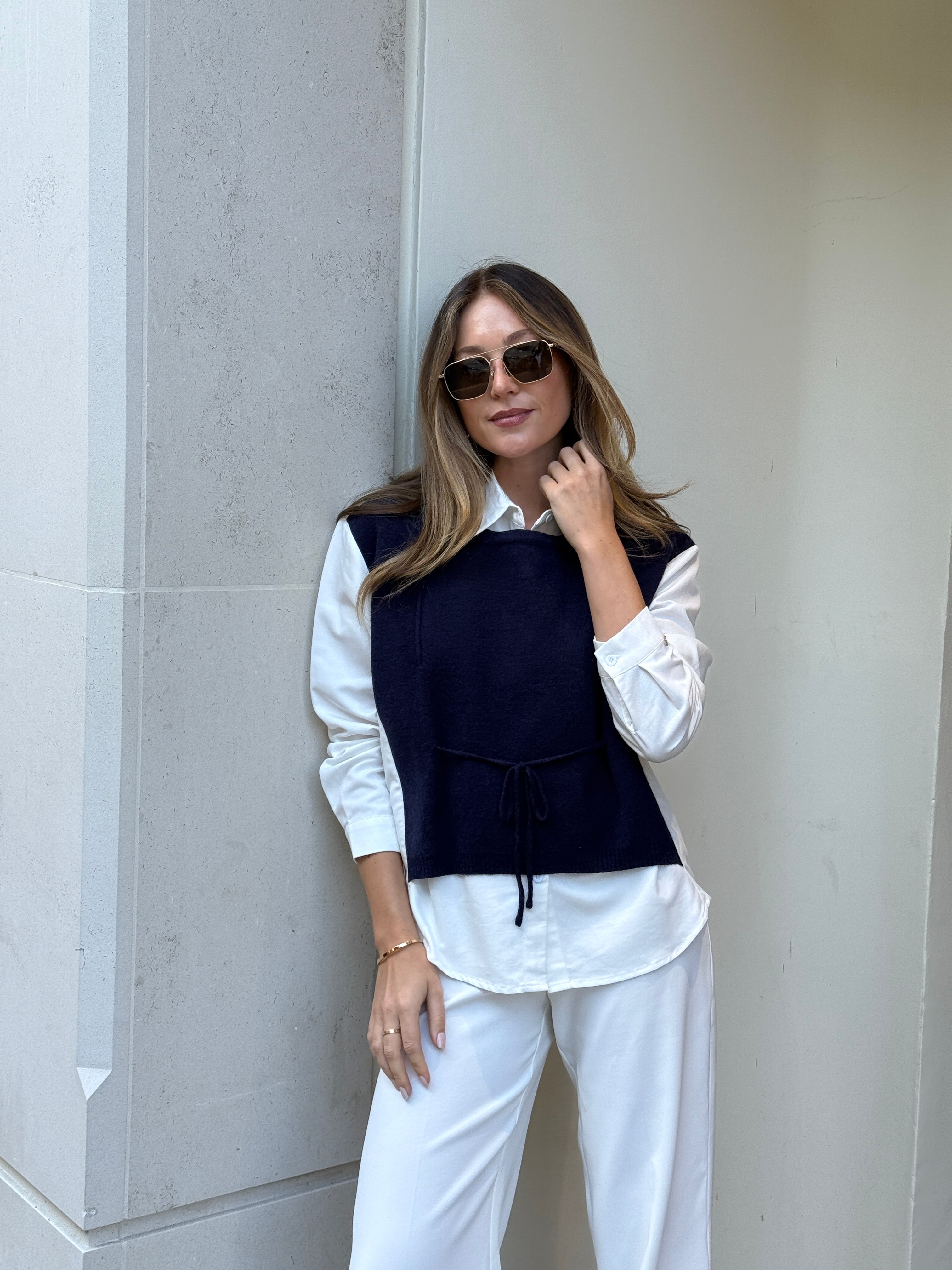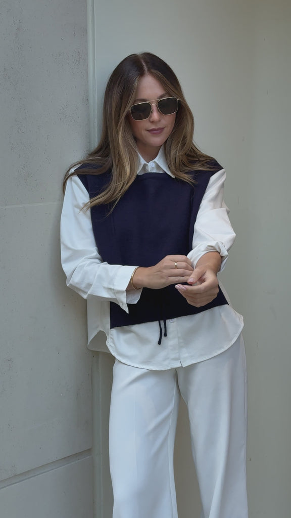 The RASA SHIRT navy epitomises refined simplicity. This ingeniously constructed piece fuses a soft knitted vest with a structured shirt layer, creating a singular garment that achieves both comfort and polish. The crisp integrated front elevates your silhouette with architectural precision, whilst the warm beige tone provides a versatile canvas for layering or standalone wear. An investment piece that transcends seasonal trends—the perfect foundational layer for a curated, sophisticated wardrobe.