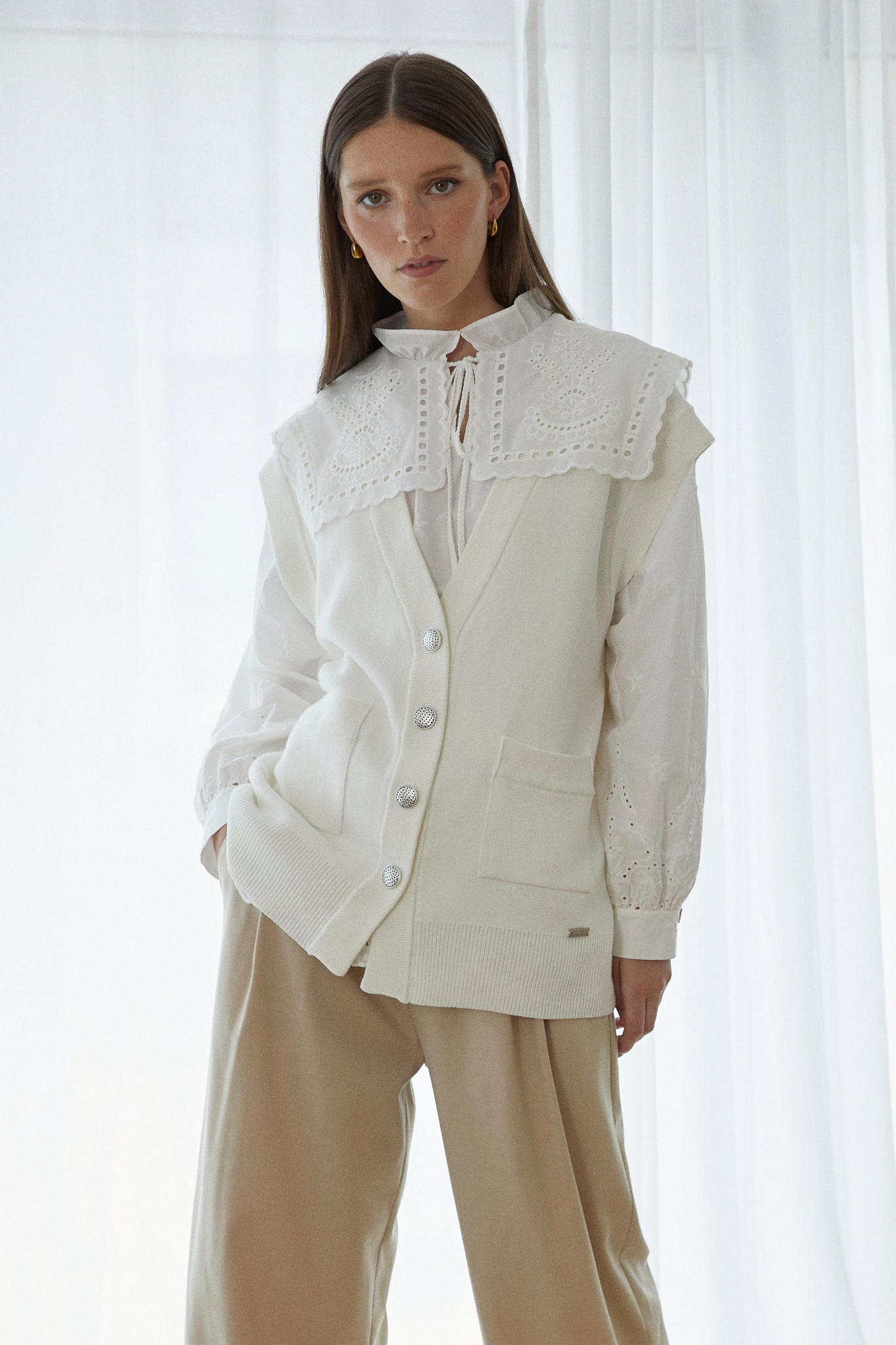 Introducing the Norah knitted vest. The perfect rotational item that can be used to shake up outfits again and again. Use to layer or just by itself to achieve coolness. The vest features a V-neck, four embroidered style metal buttons, two pockets and a Jovonna pendant. Pair with our Shailee Blouse