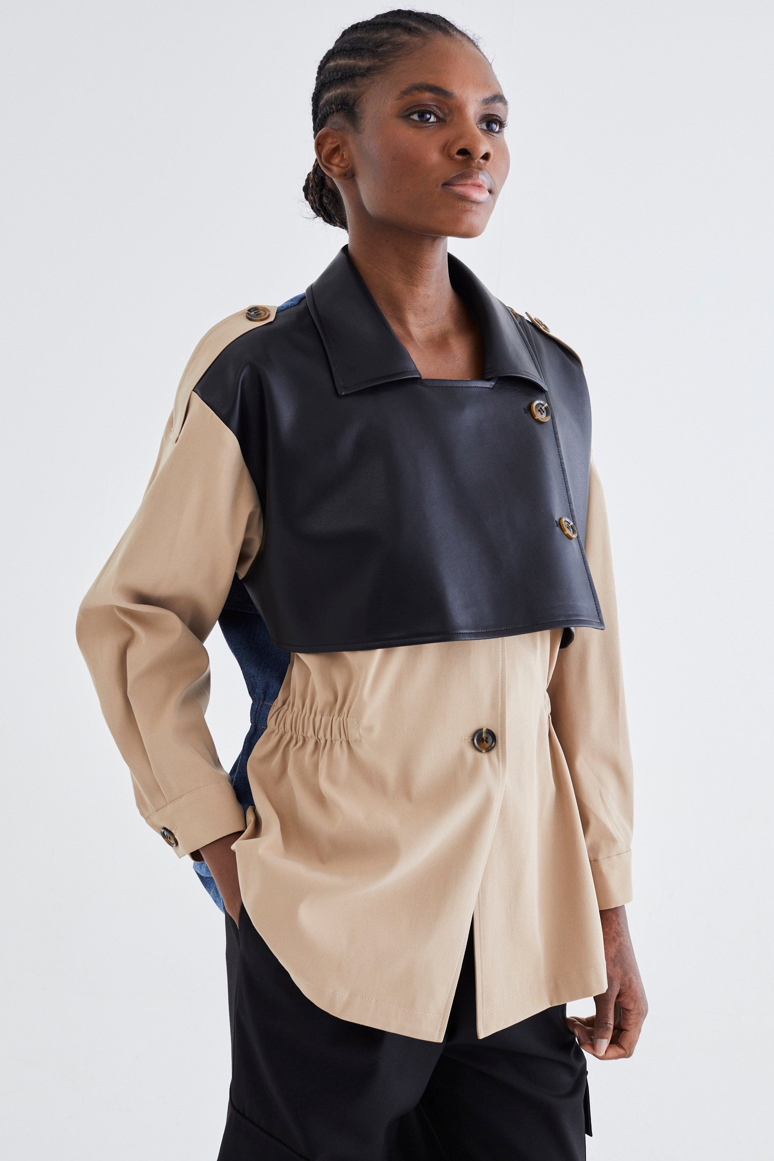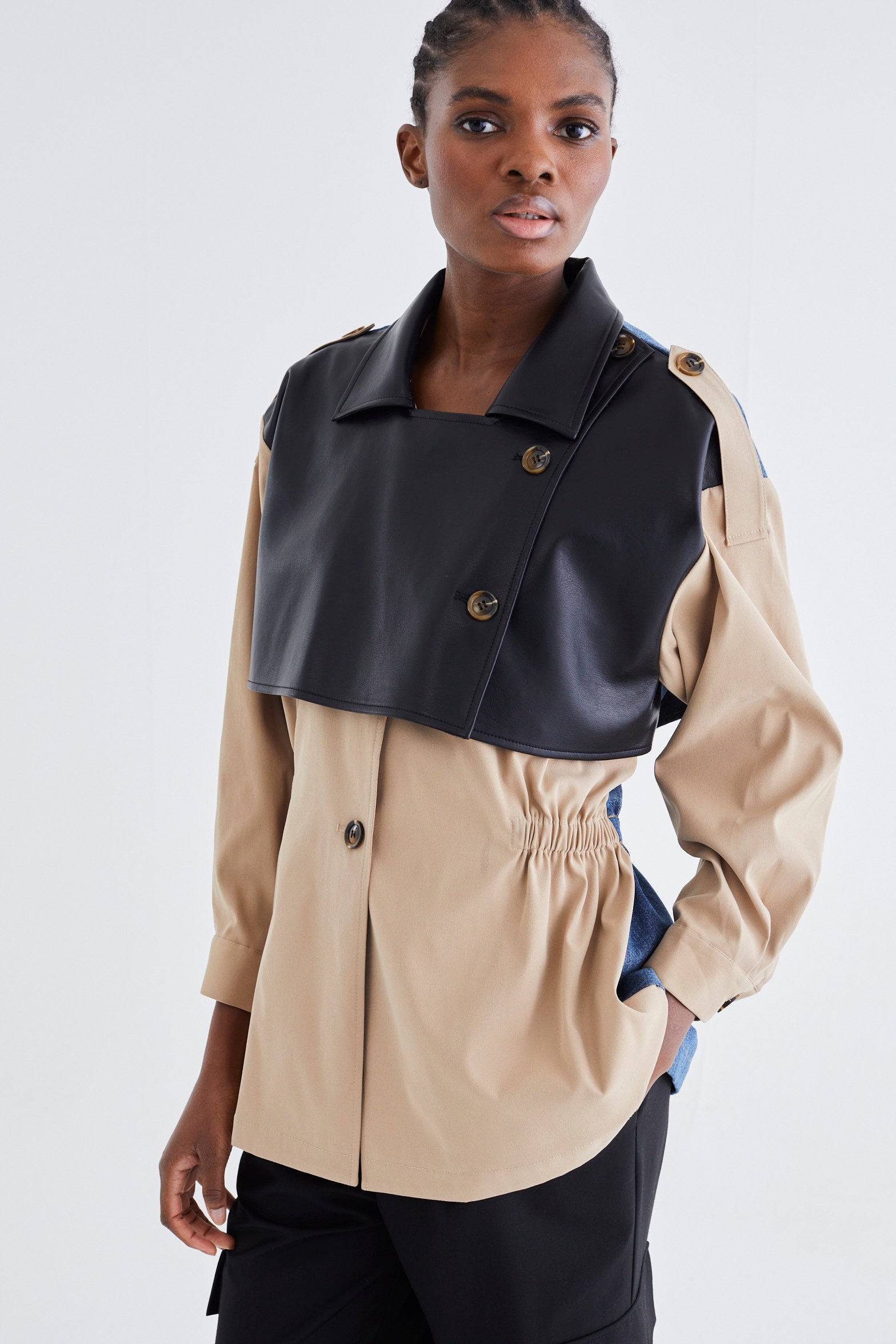 The MAITE TRENCH offers a sophisticated fusion of classic trench design, rich leather accents, and timeless denim elements. This unique blend creates a versatile outerwear piece that balances elegance with contemporary edge, perfect for elevating your wardrobe with refined style and enduring appeal.