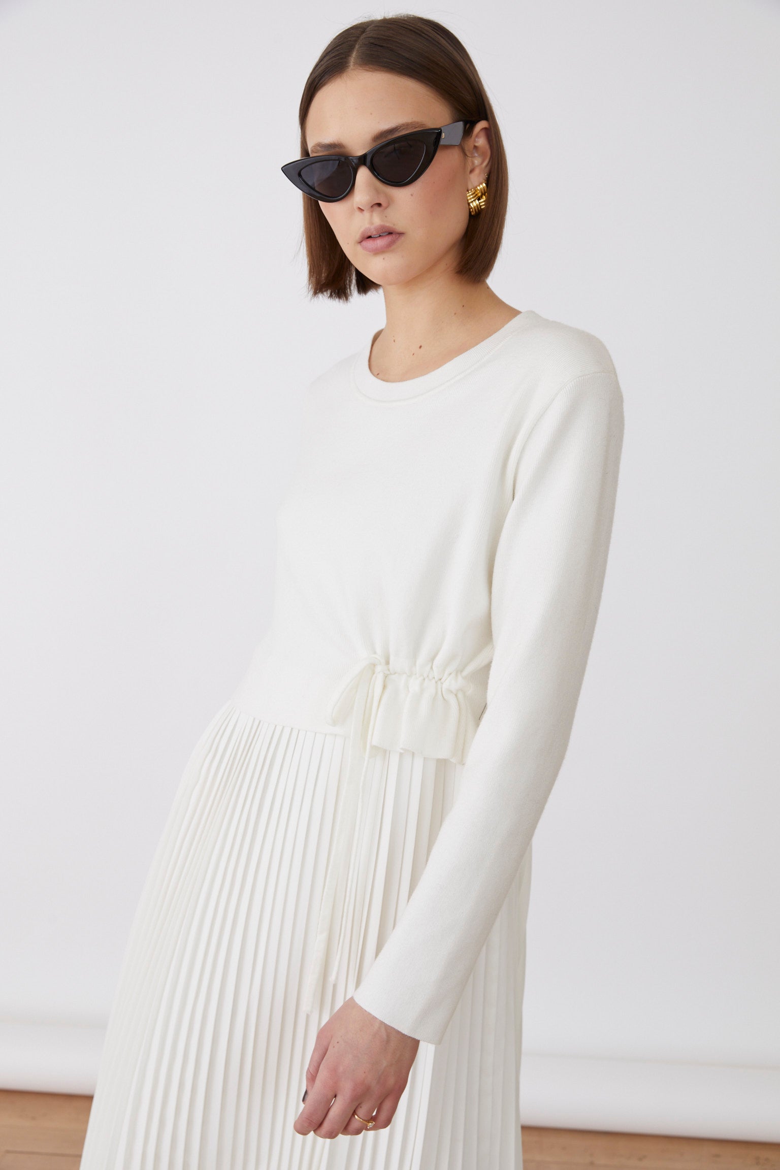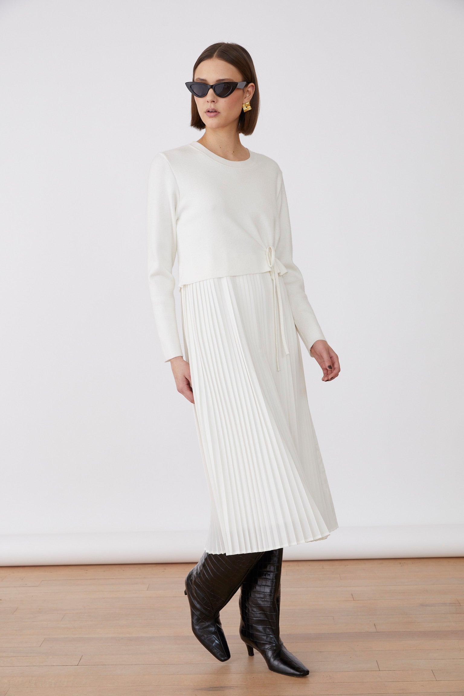 Elevate your wardrobe with the Merida Knitted Dress in black, featuring a finely knitted texture for comfort and elegance. Its pleated skirt adds graceful movement, while long sleeves provide a refined silhouette. The adjustable tie at the side cinches the waist to enhance your shape, making this dress a perfect choice for sophisticated, timeless style.