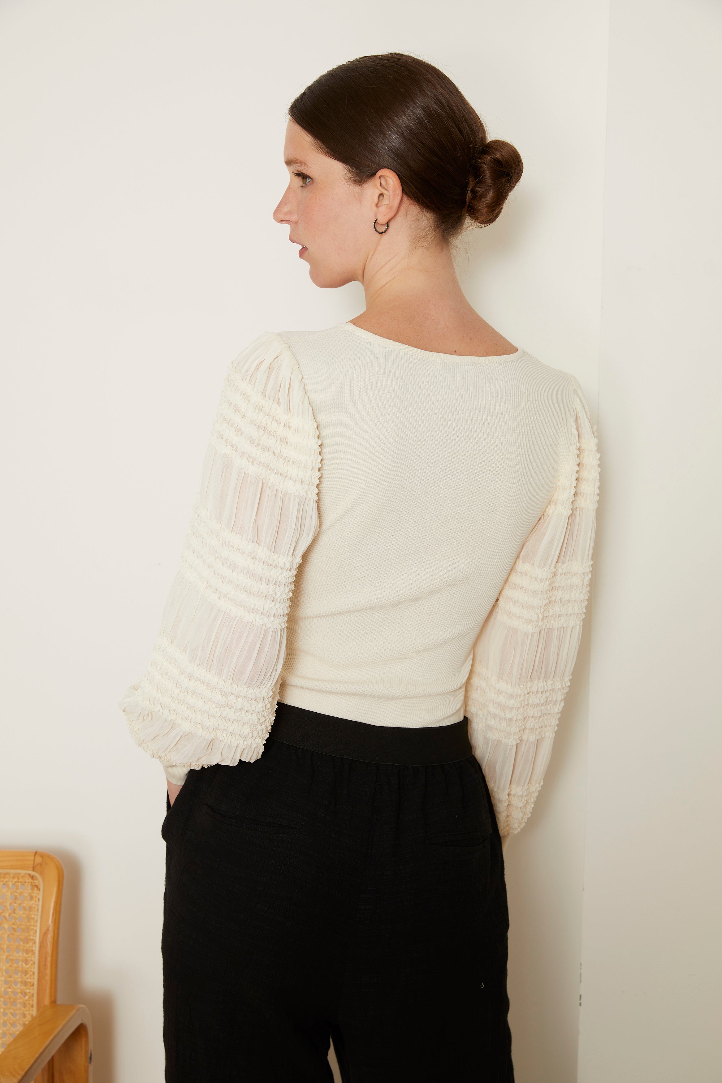 FINAL SALE. NO REFUNDABLE The Neasa Jumper offers a sophisticated take on the everyday knitwear essential, featuring a flattering V-neck and uniquely textured sleeves that elevate its classic design. This refined piece blends comfort with subtle detail, making it the perfect elevated basic for effortless style and versatility.