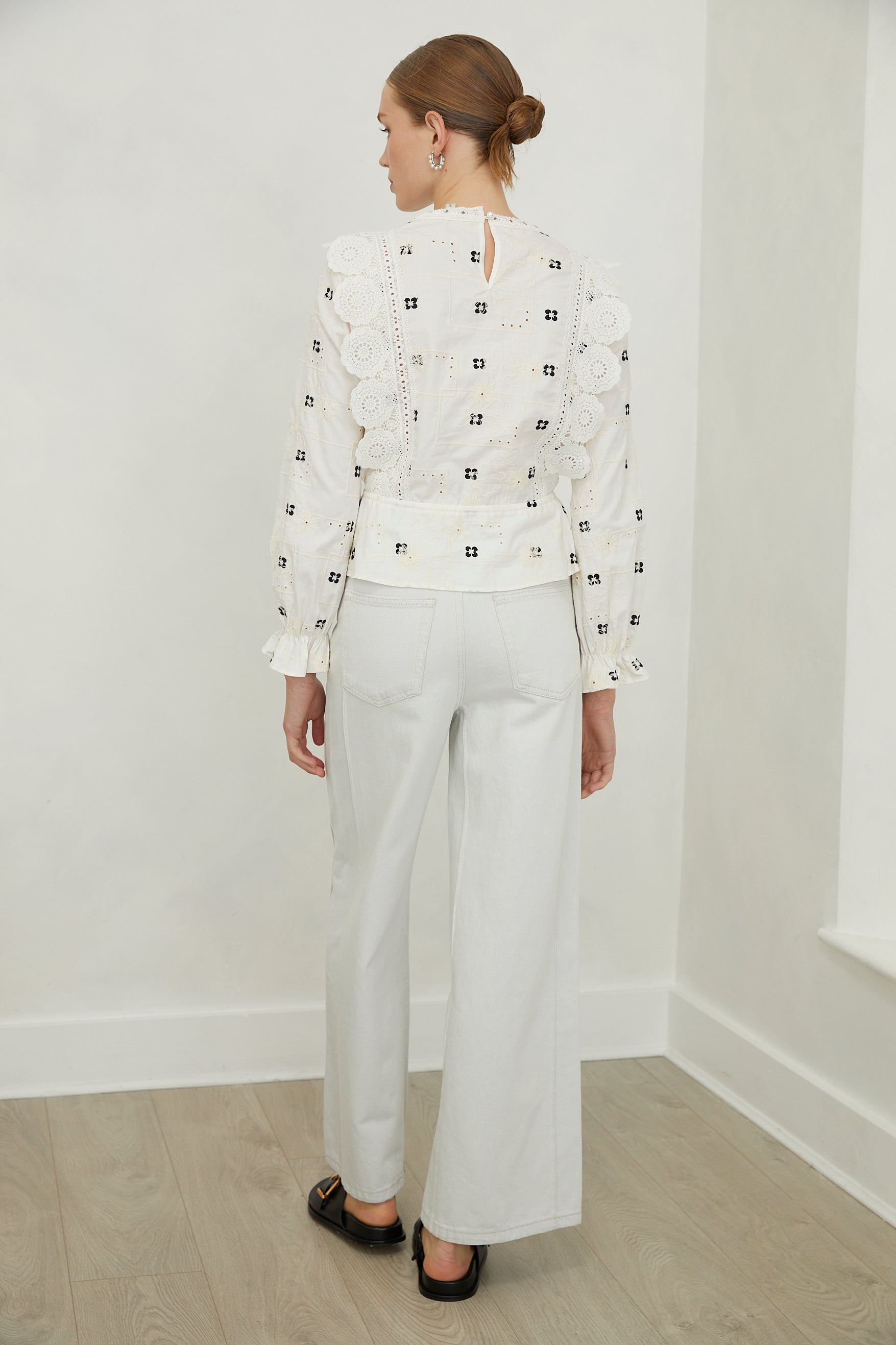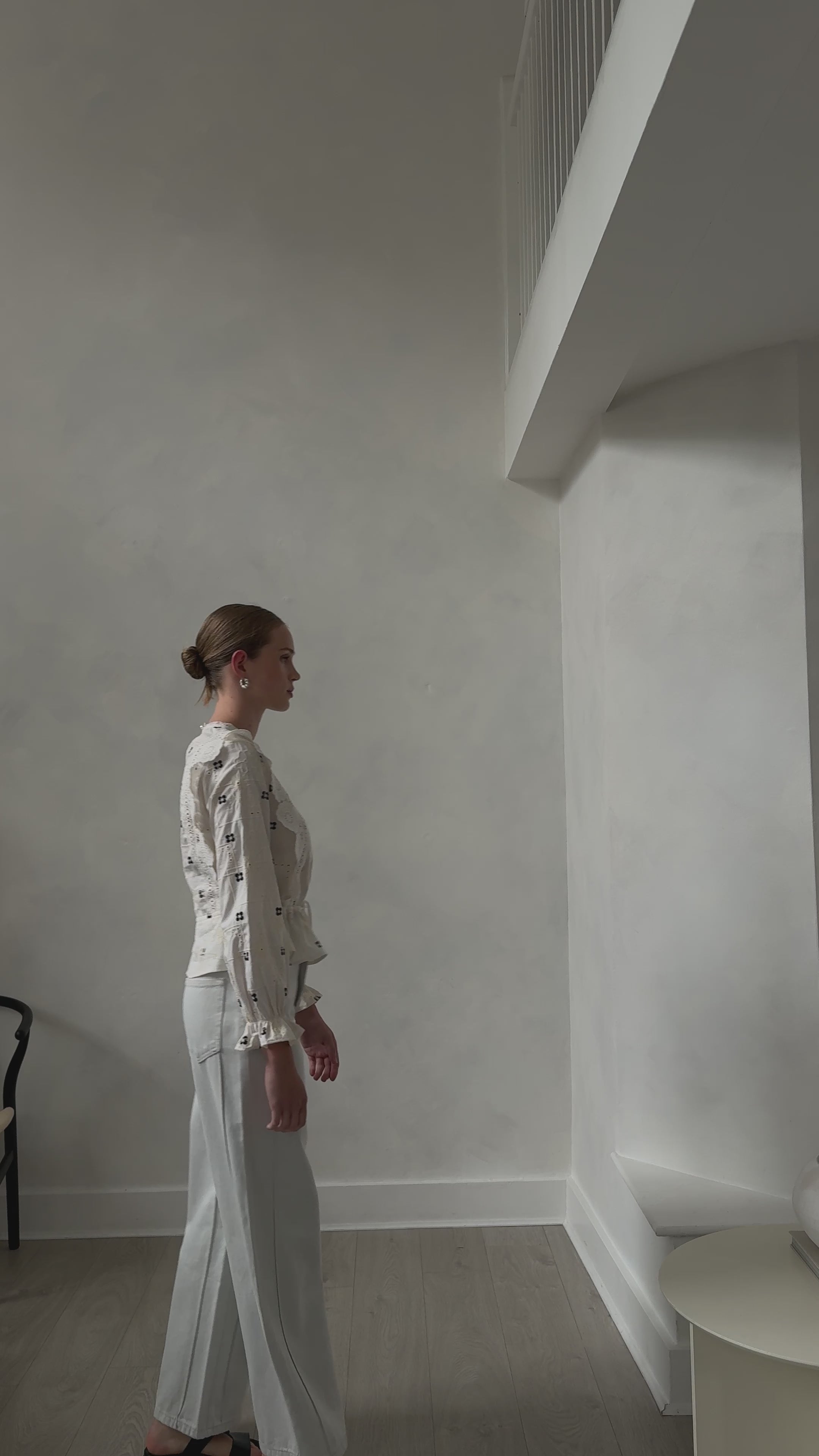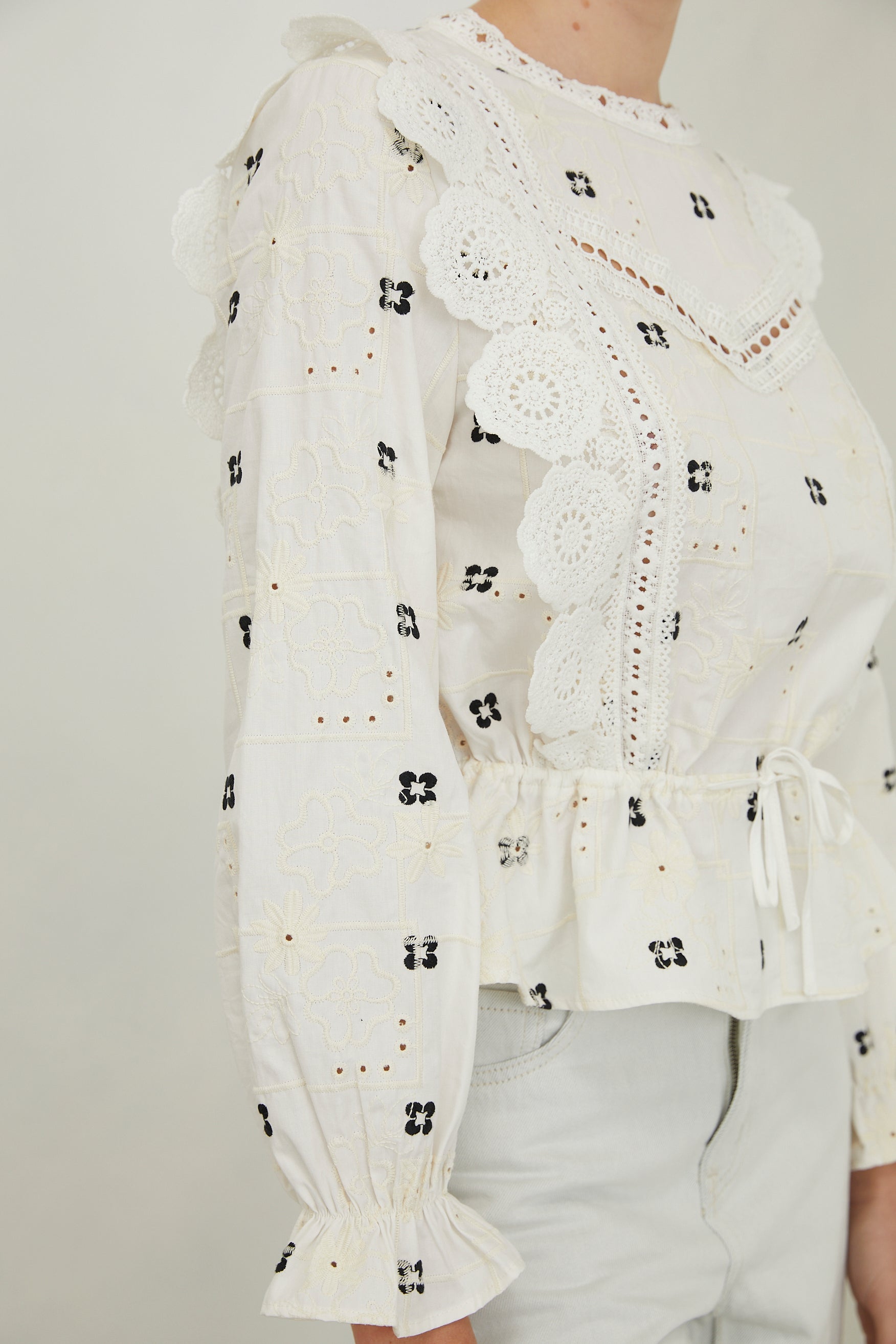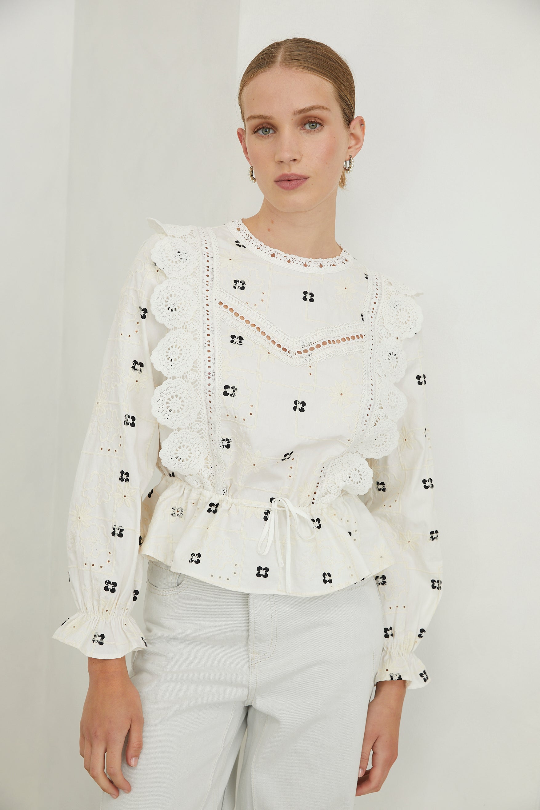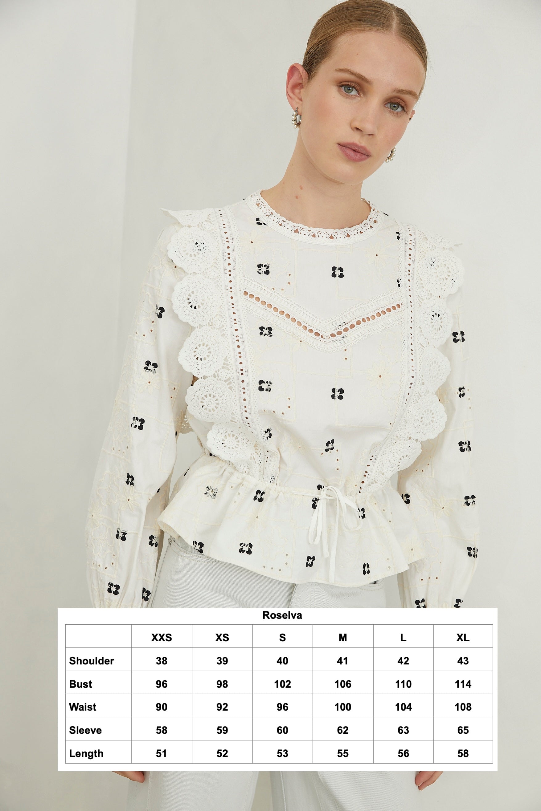 The ROSELVA BLOUSE combines understated elegance with refined craftsmanship. Rendered in soft cream, this piece features intricate embroidered detailing and delicate lace accents that elevate its timeless appeal. The adjustable tie waist creates a flattering silhouette, allowing you to define your shape with ease. Perfect for layering or wearing solo, this blouse transitions effortlessly from day to evening, embodying the premium aesthetic that defines contemporary luxury dressing.