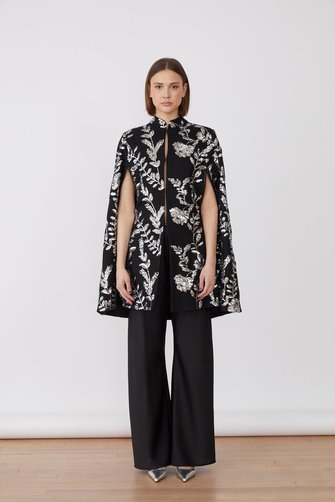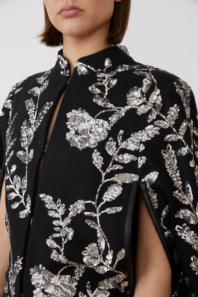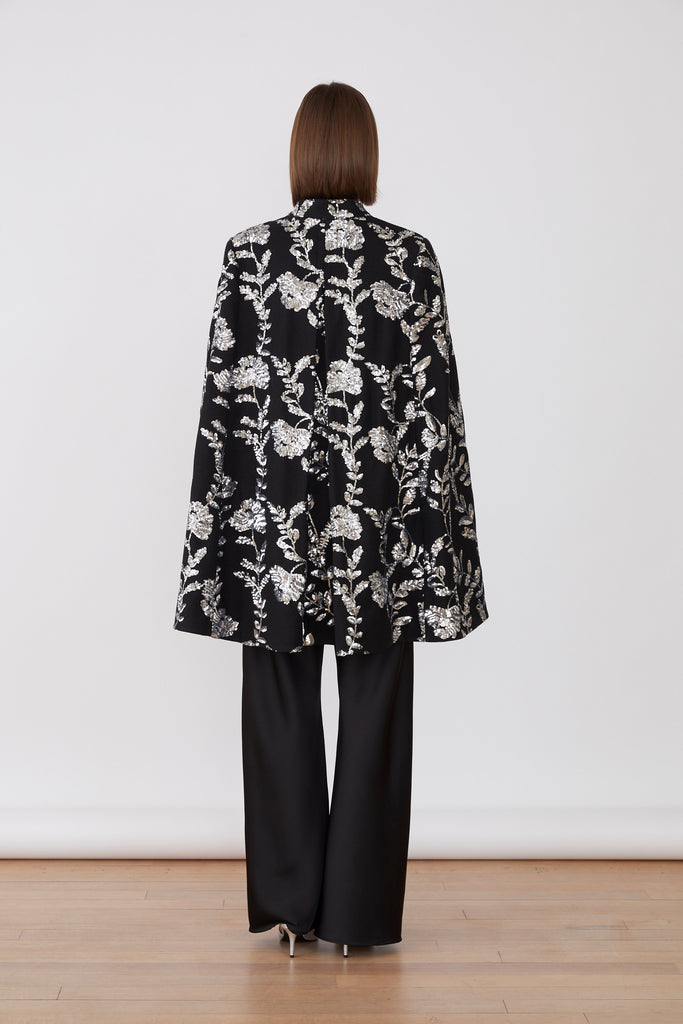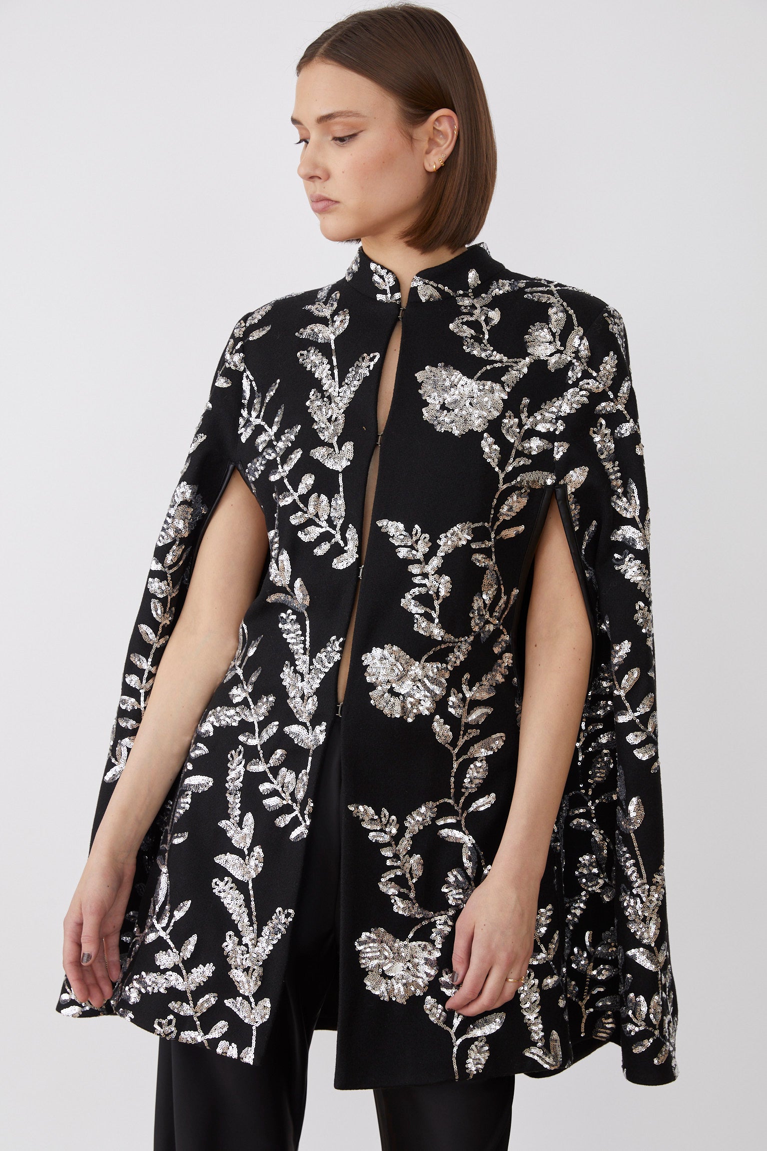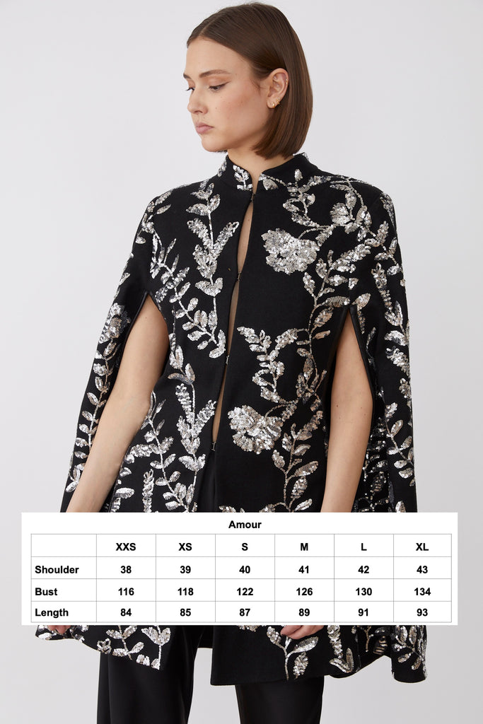Elevate your look with the Amour Cape, a sophisticated piece featuring delicate floral embellishments and elegant arm openings. This graceful cape effortlessly transforms any outfit into a statement ensemble, perfect for adding a refined touch to your wardrobe. Whether layered over evening wear or chic daywear, it embodies timeless elegance and serves as the perfect star piece for special occasions.